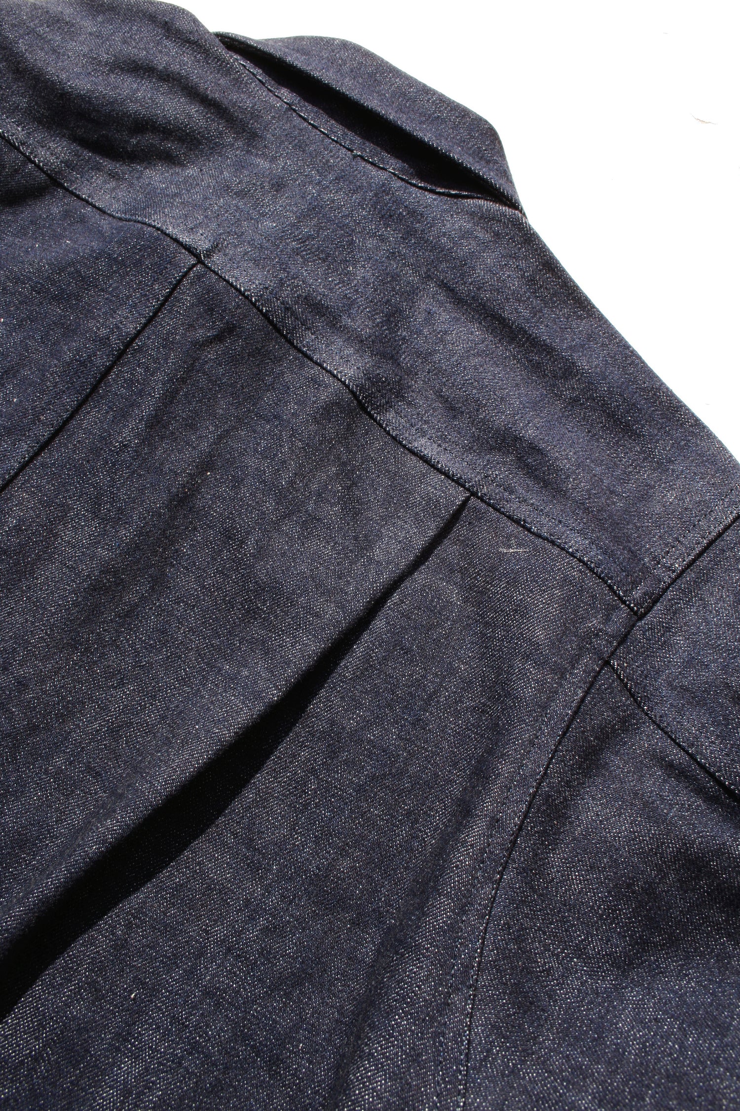 中厚で通気性のあるオーガニックセルヴィッチデニム生地を使用したドローコード付きのデザインショートジャケット。左右側には4つのポケットをつけて、整理整頓がしやすい仕様にしました。春から秋にかけて長く楽しんでいただける、どこから見ても美しい一着。インナーに丈の長いトップスを合わせてレイヤードスタイルも楽しめます。同素材でダンガリージャンプスーツのご用意がございます。
