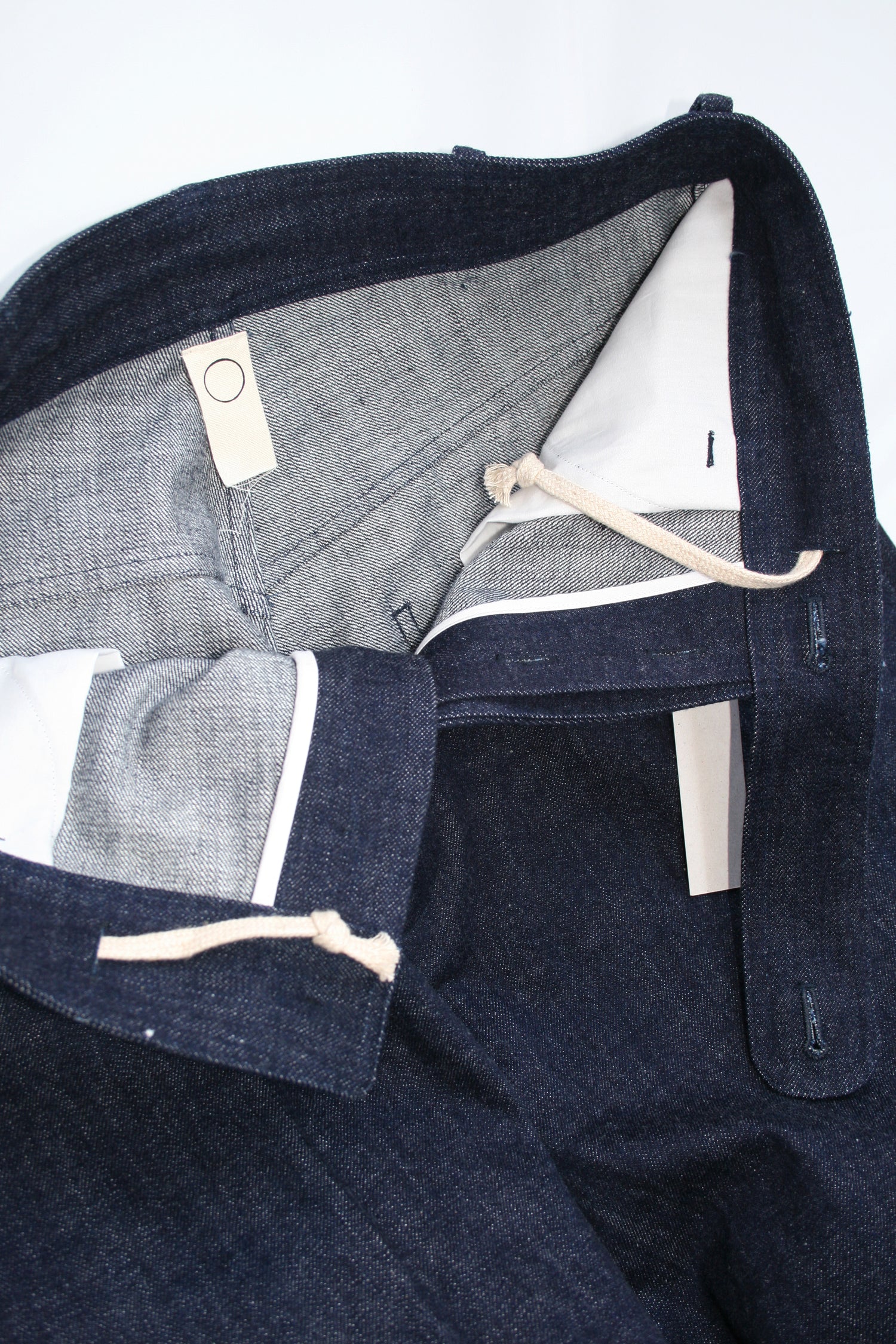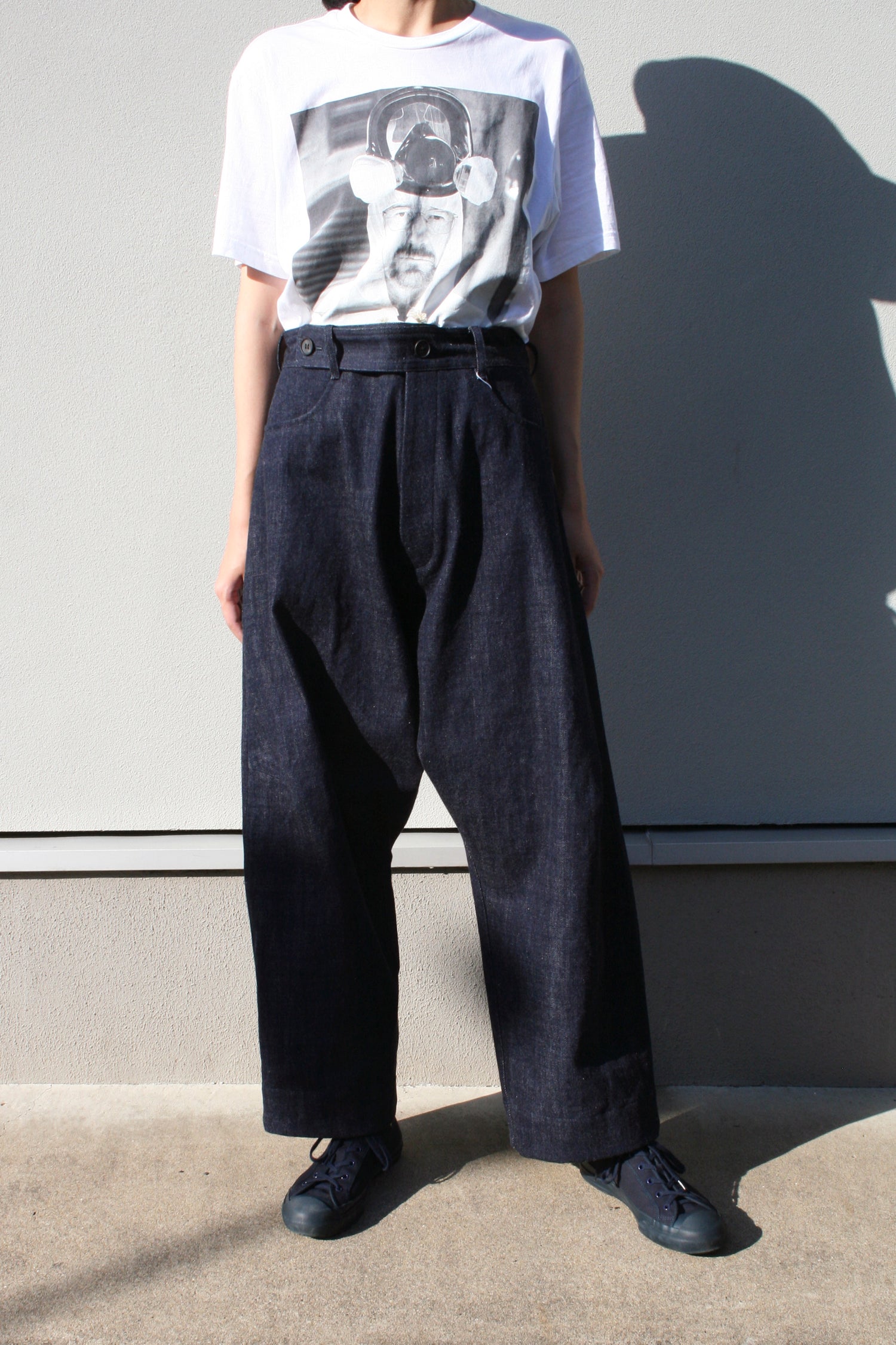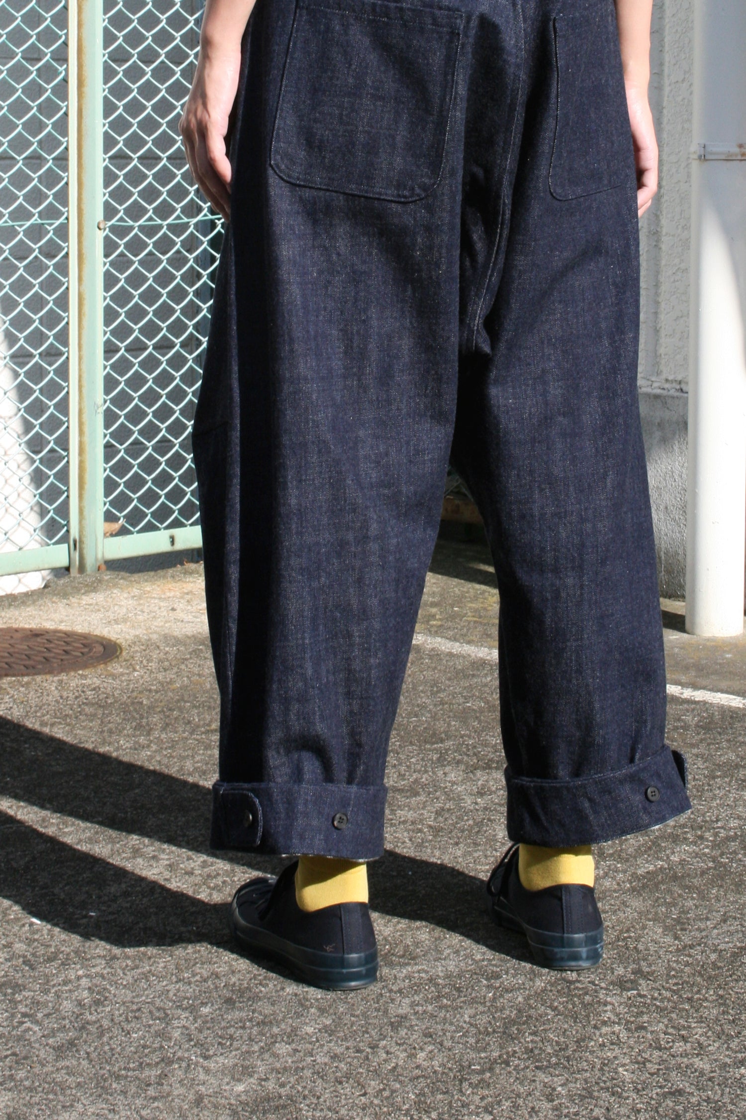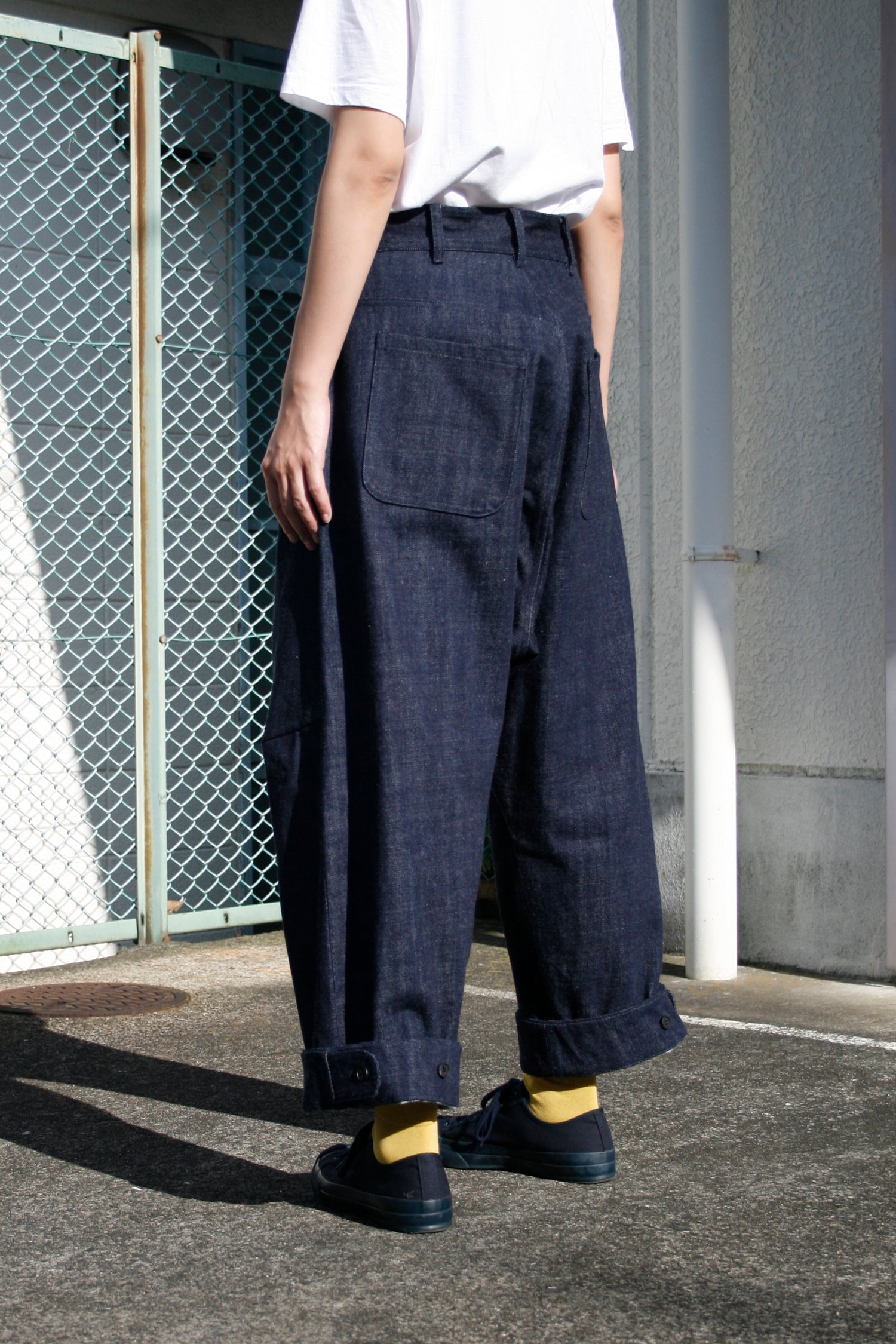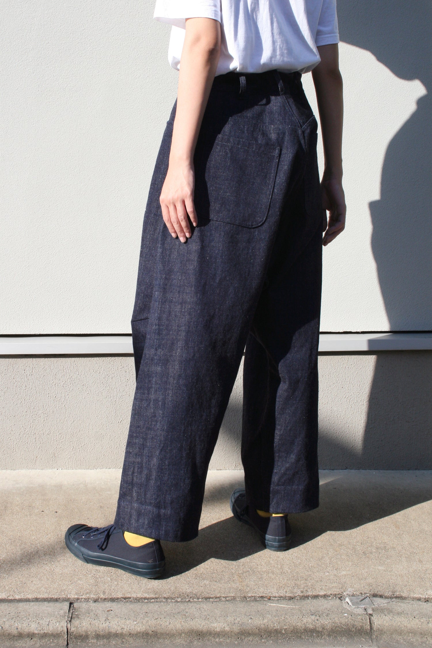 深めの股上、セルヴィッチデニムを使用した彫刻的で立体感のあるワイドパンツ。フロントは開閉ボタン仕様。左右にパッチポケットとバックポケットが2つ。裾のドローコード、ウエストはドローストリングを採用、イージーな着心地を実現しています。オーガニックコットンの生地は耐久性に優れ、 スタイルを選ぶこと無く、着込む程に身体に馴染んでいく。履く人の体系を選ばないトラウザー。性別、年齢も超え、着用すると意外にもハマる、便利でコンテンポラリーなアイテム。同素材のインジゴジャケットとのセットアップもおすすめです。