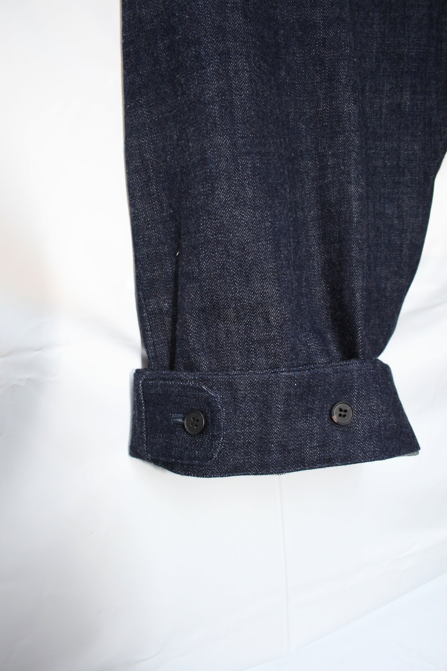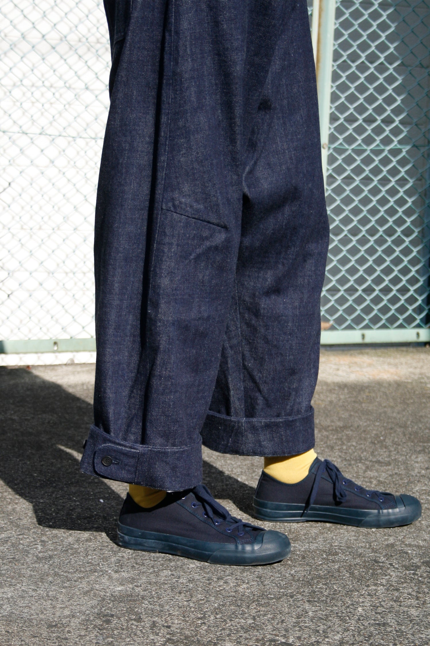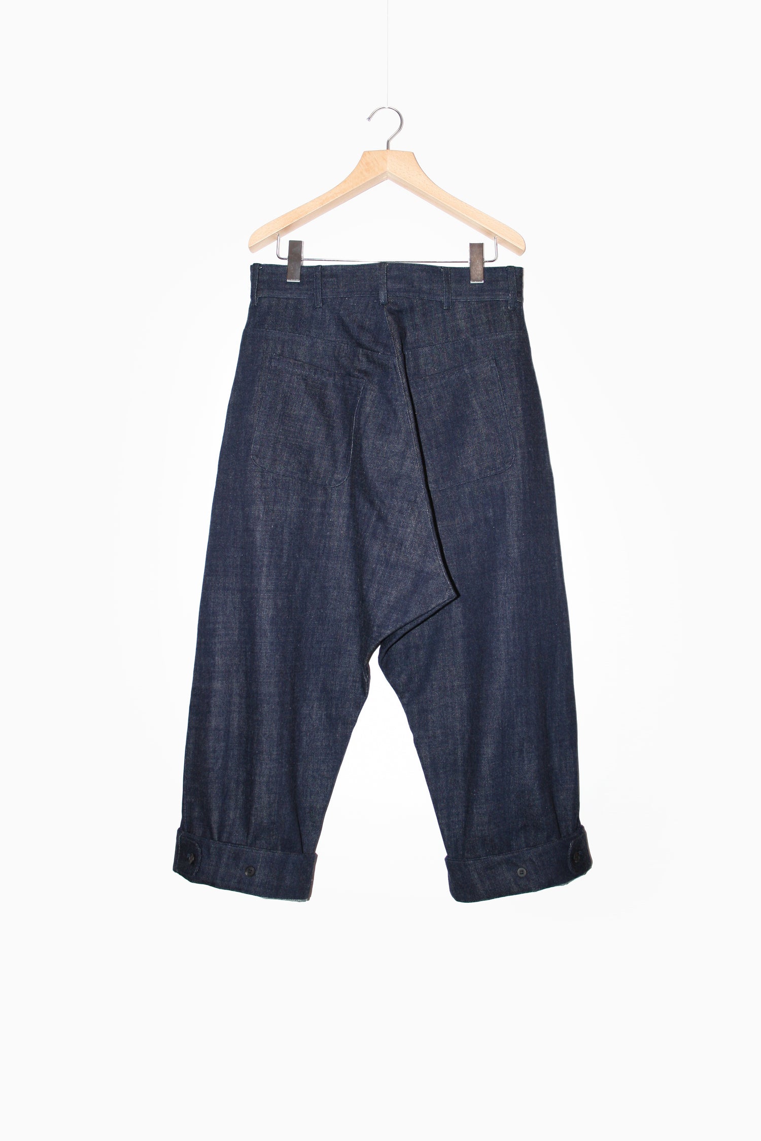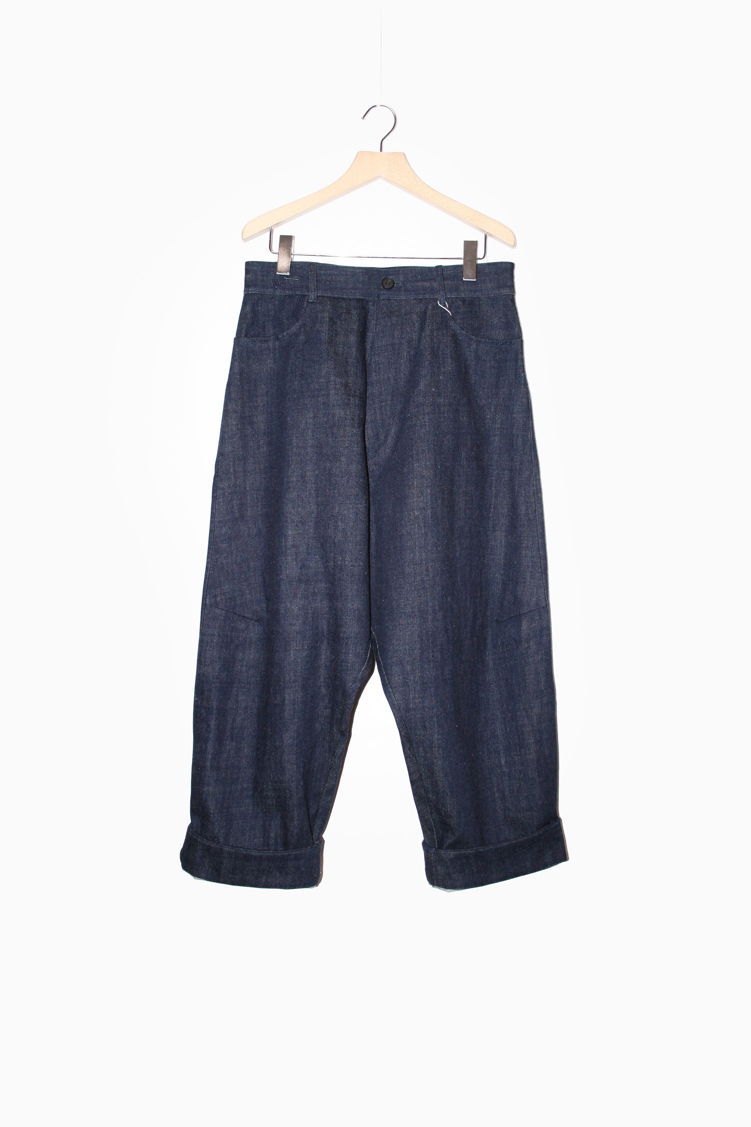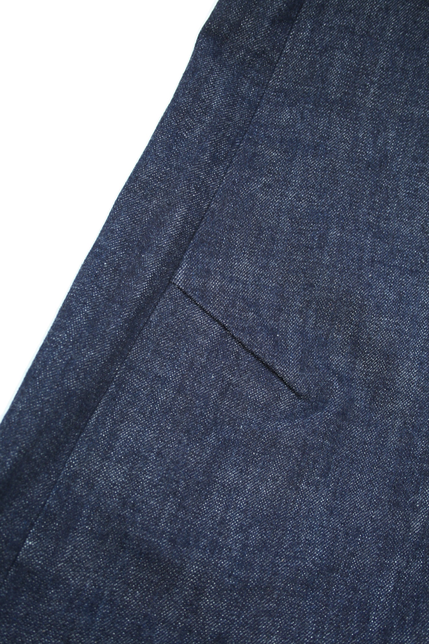 深めの股上、セルヴィッチデニムを使用した彫刻的で立体感のあるワイドパンツ。フロントは開閉ボタン仕様。左右にパッチポケットとバックポケットが2つ。裾のドローコード、ウエストはドローストリングを採用、イージーな着心地を実現しています。オーガニックコットンの生地は耐久性に優れ、 スタイルを選ぶこと無く、着込む程に身体に馴染んでいく。履く人の体系を選ばないトラウザー。性別、年齢も超え、着用すると意外にもハマる、便利でコンテンポラリーなアイテム。同素材のインジゴジャケットとのセットアップもおすすめです。