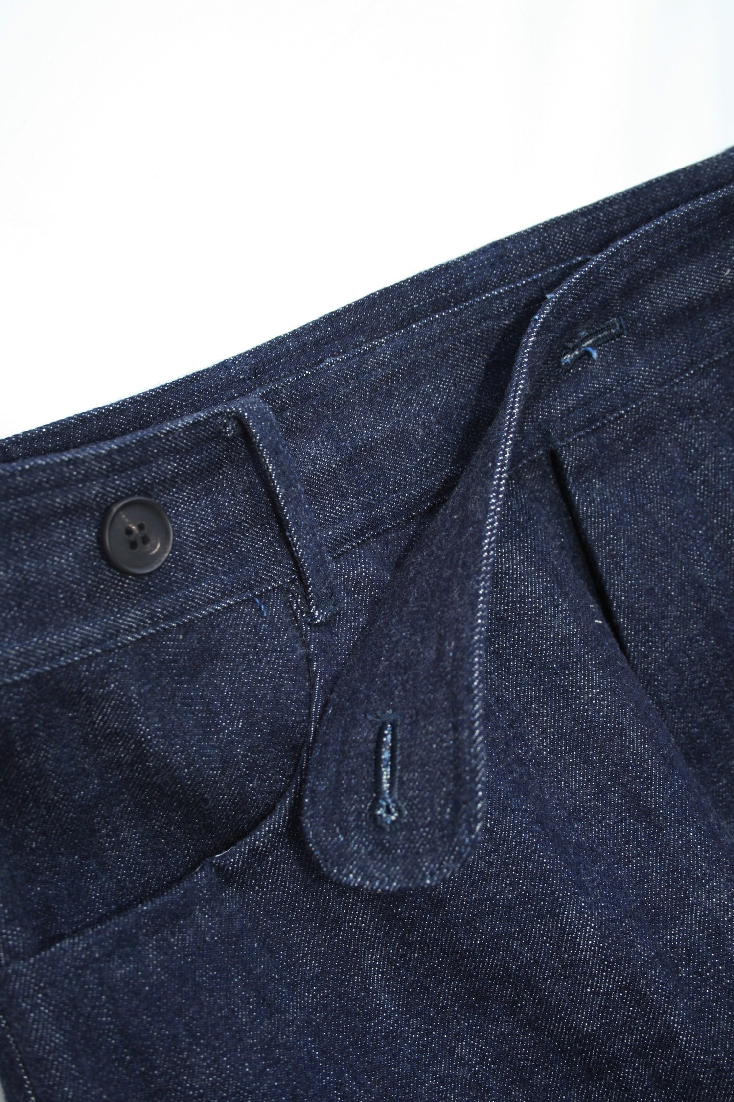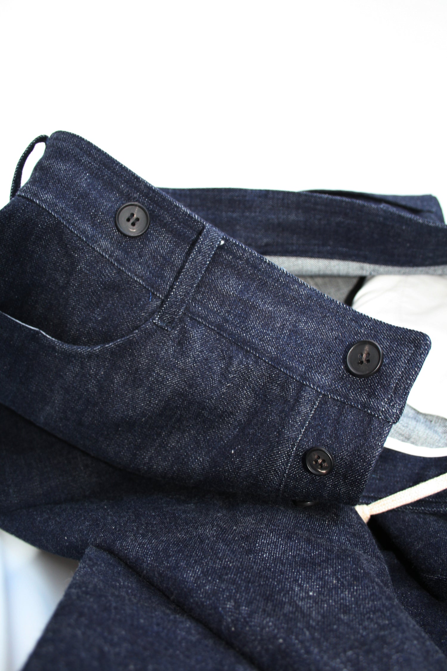 A relaxed-fit pair of trousers in raw and heavyweight Japanese organic selvedge denim. Constructed with deep rise and front button closure, as well as a comfortable waist drawcord, 4 large pockets and adjustable hems. Wide waistline and voluminous in the leg. A comfortable item for any type of climate. Unisex for men and women. Matched well with the wide indigo jacket style in the same fabric.