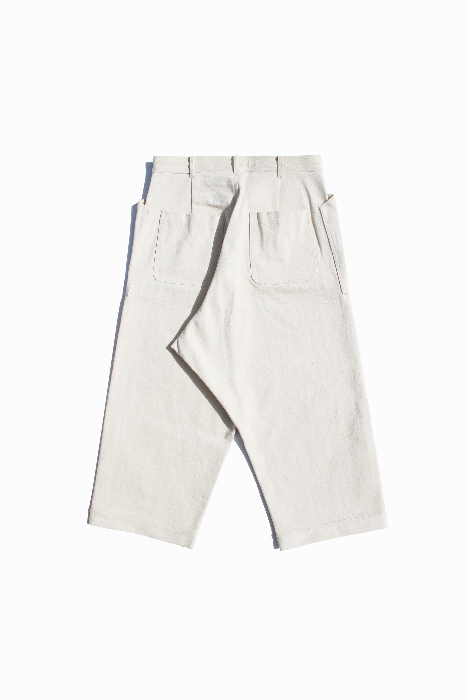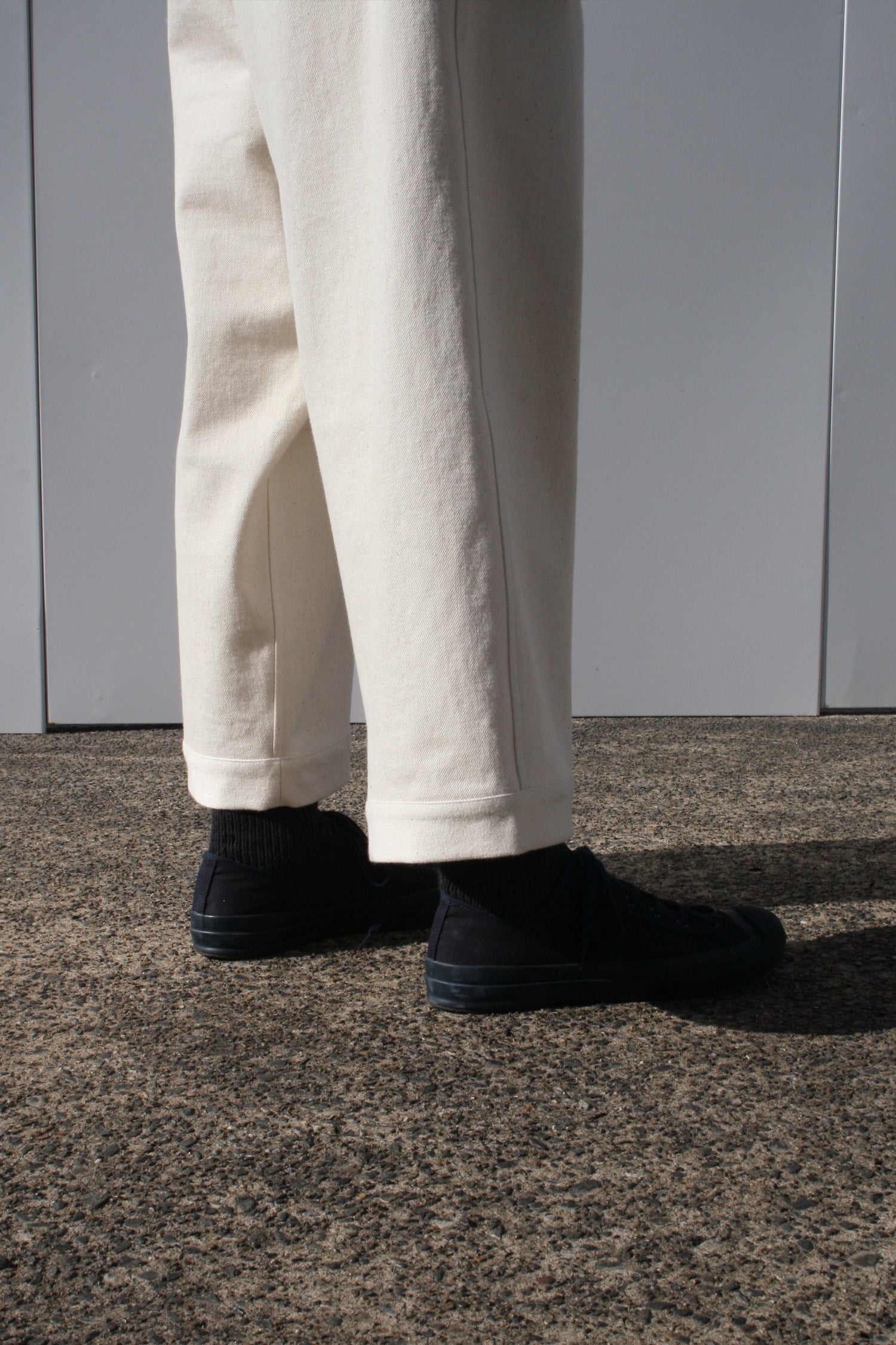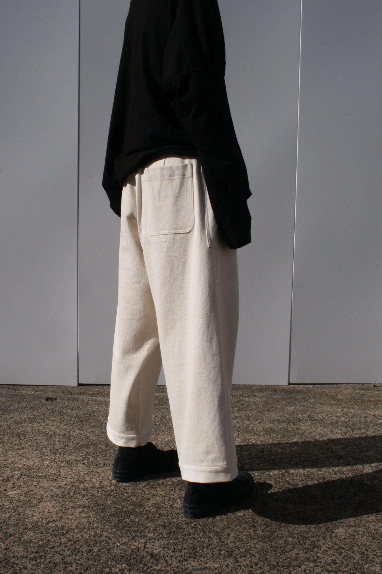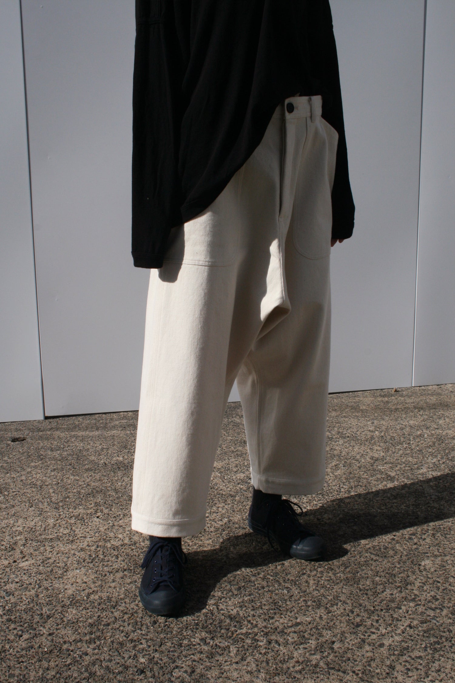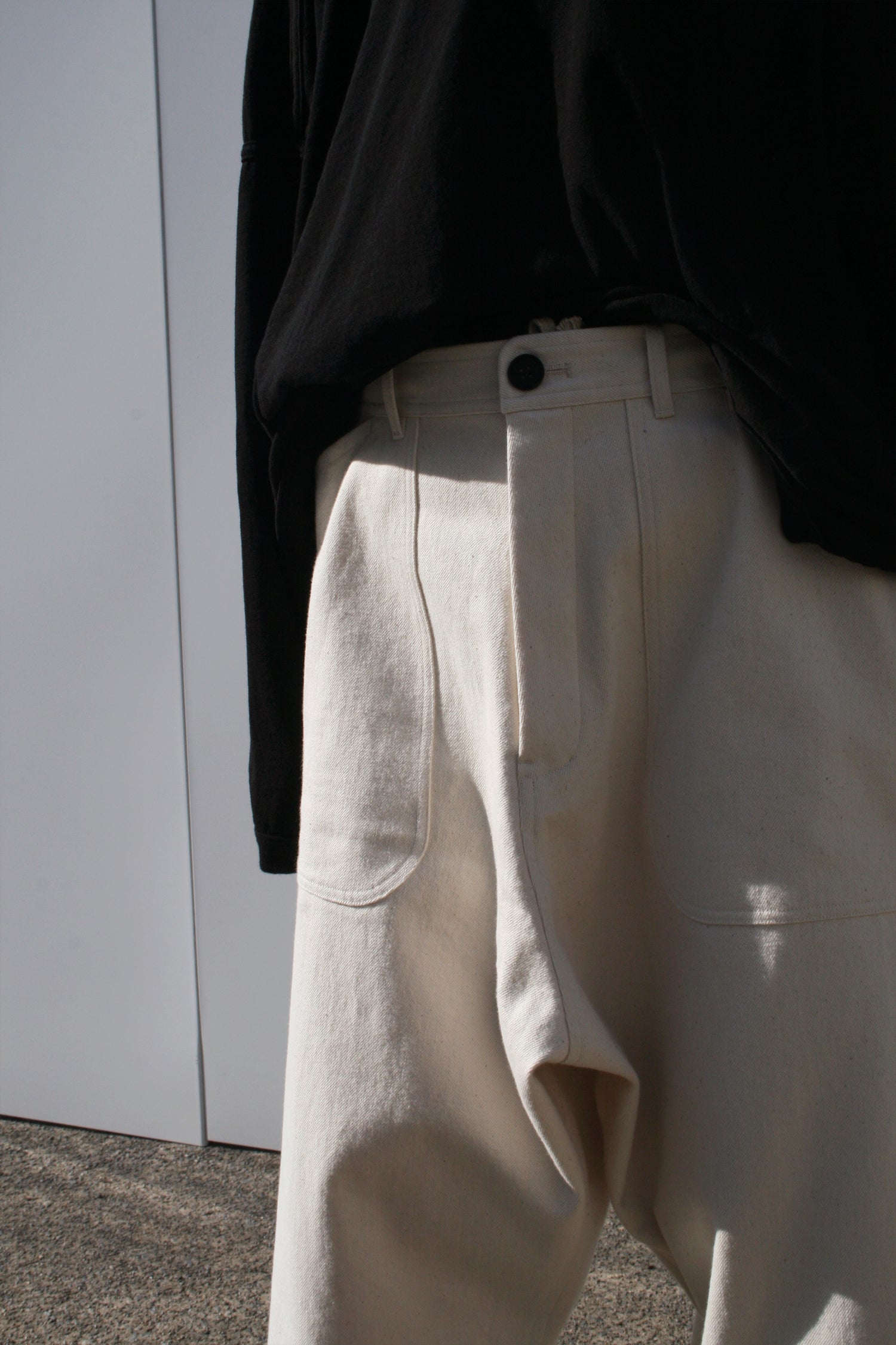 股上深めのワイドクロップド、オーガニックコットンの生地使用した新型となるトラウザー。かなりゆとりを入れたワイドフィットなシルエットは、オープロジェクトのコレクションの中でリラックスフィットラインになります。ウエストにドローコードをつけ、履きやすさを提案しています。両サイドにパッチポケット、バックにはスクエア型ポケットが付属。性別、年齢も超え、着用すると意外にもハマる、便利でコンテンポラリーなアイテム。最高の着心地をお楽しみ下さい。 上下であわせることでナチュラルデニムなセットアップスタイルをお楽しみいただくことができます。