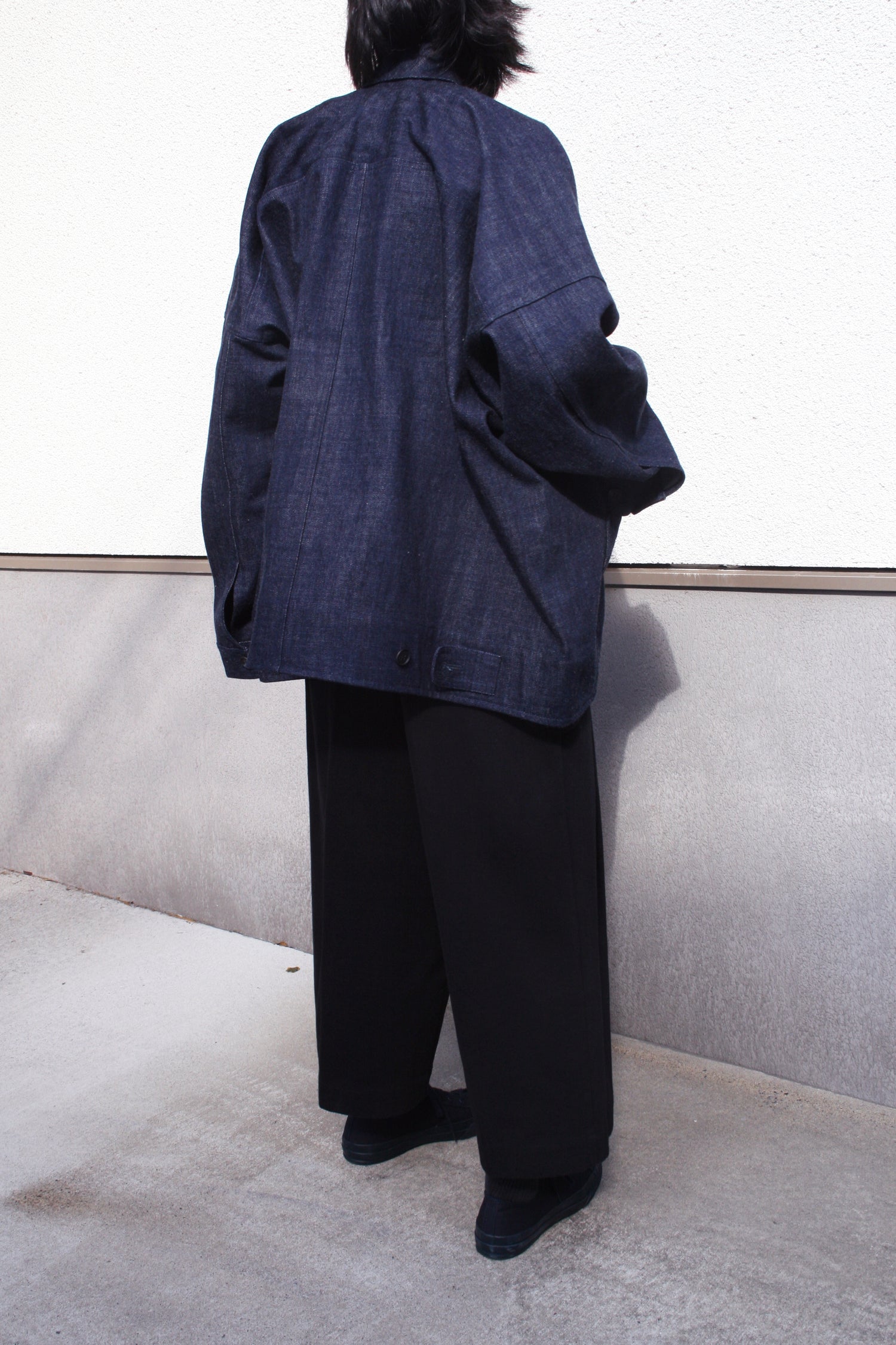 Unisex denim jacket using medium-thick, breathable Japanese organic cotton selvedge denim. Constructed with a wide body, dropped shoulders, and loose cut sleeves. Features a Japanese style V collar and 4 patch pockets. The hem has button fastenings at the back for extra volume. A-line shape through the body, great for mix and casual daily wear.