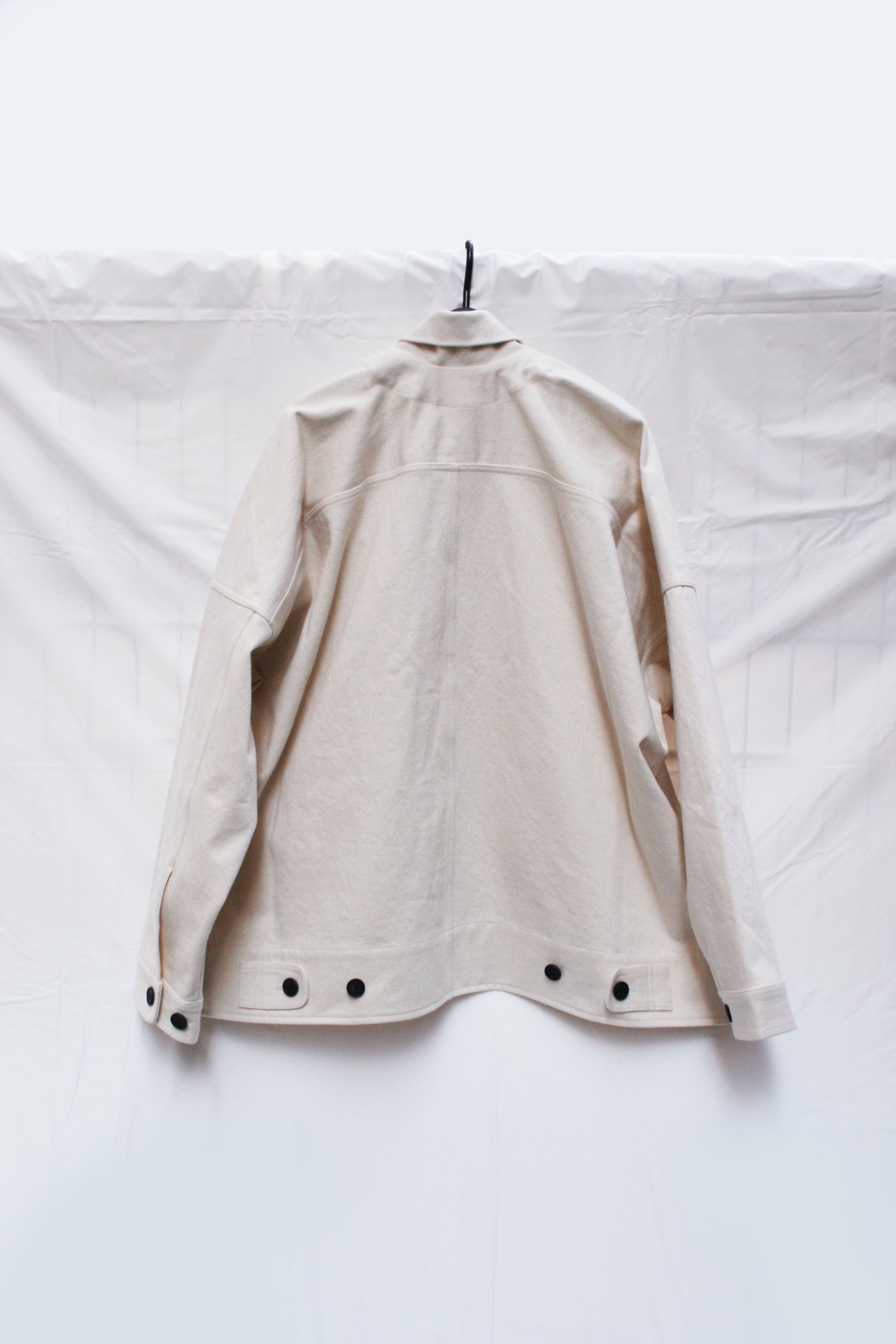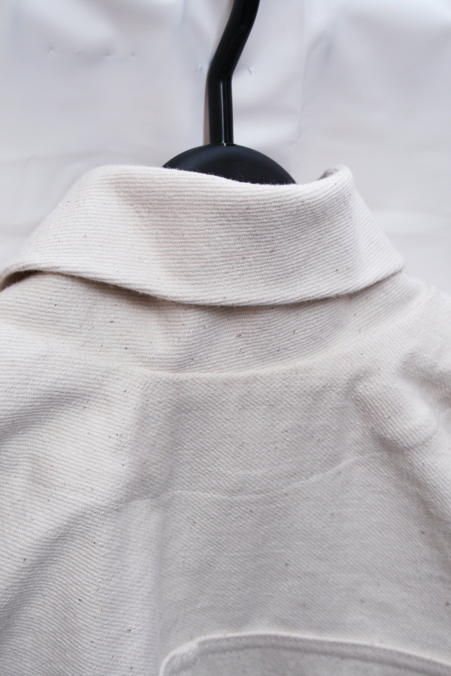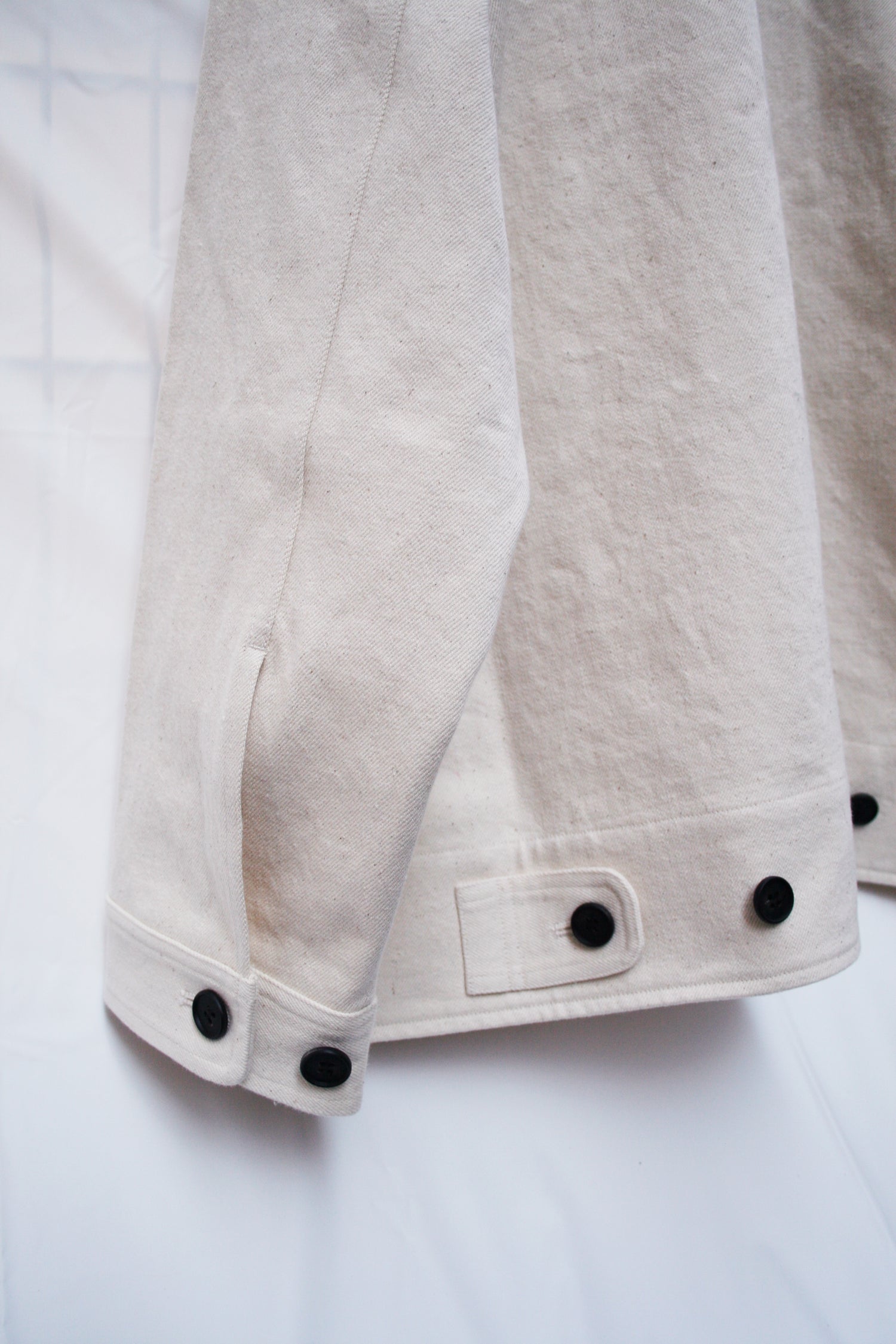 Unisex denim jacket using medium-thick, breathable Japanese organic cotton selvedge denim. Constructed with a wide body, dropped shoulders, and loose cut sleeves. Features a Japanese style V collar and 4 patch pockets. The hem has button fastenings at the back for extra volume. A-line shape through the body, great for mix and casual daily wear.