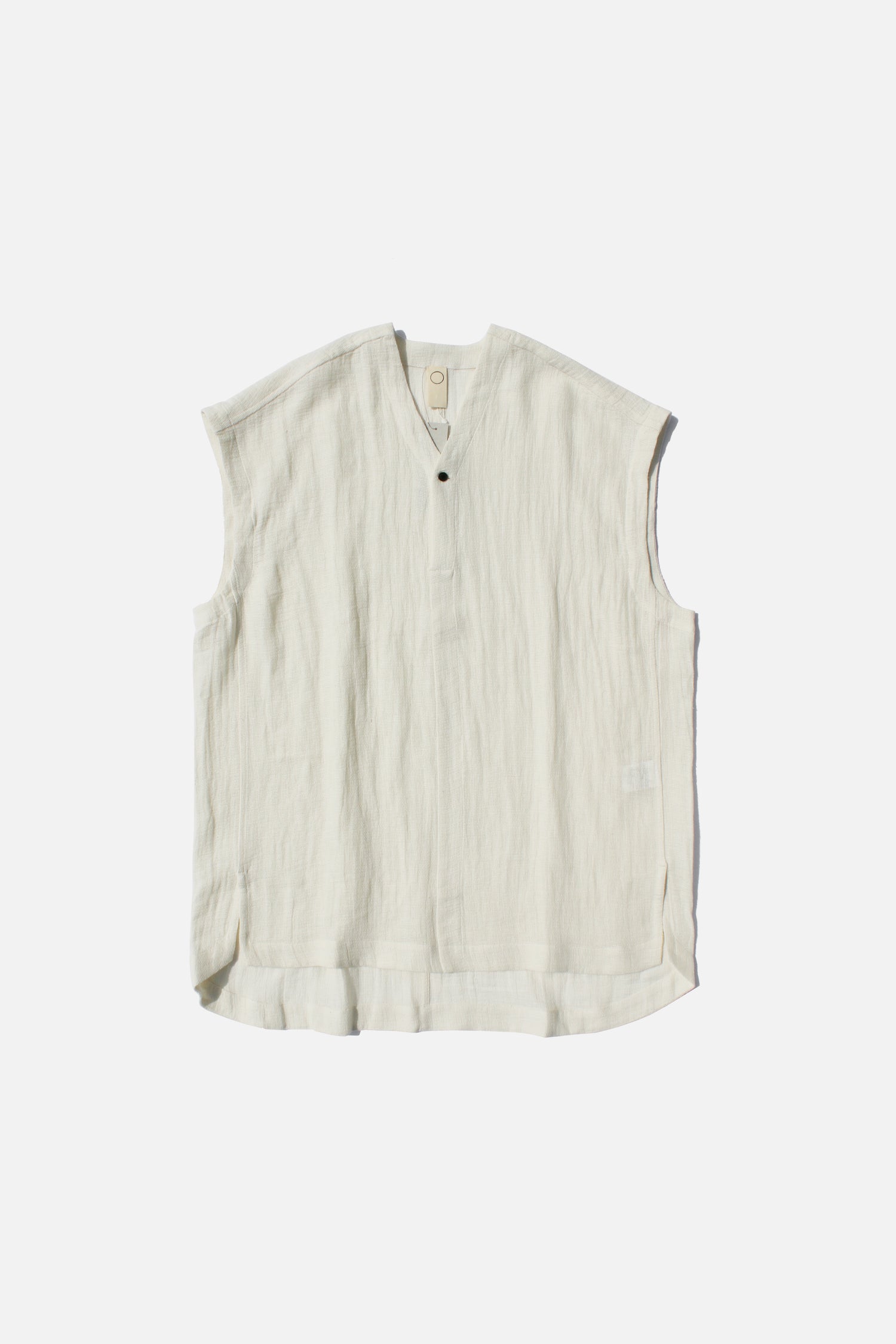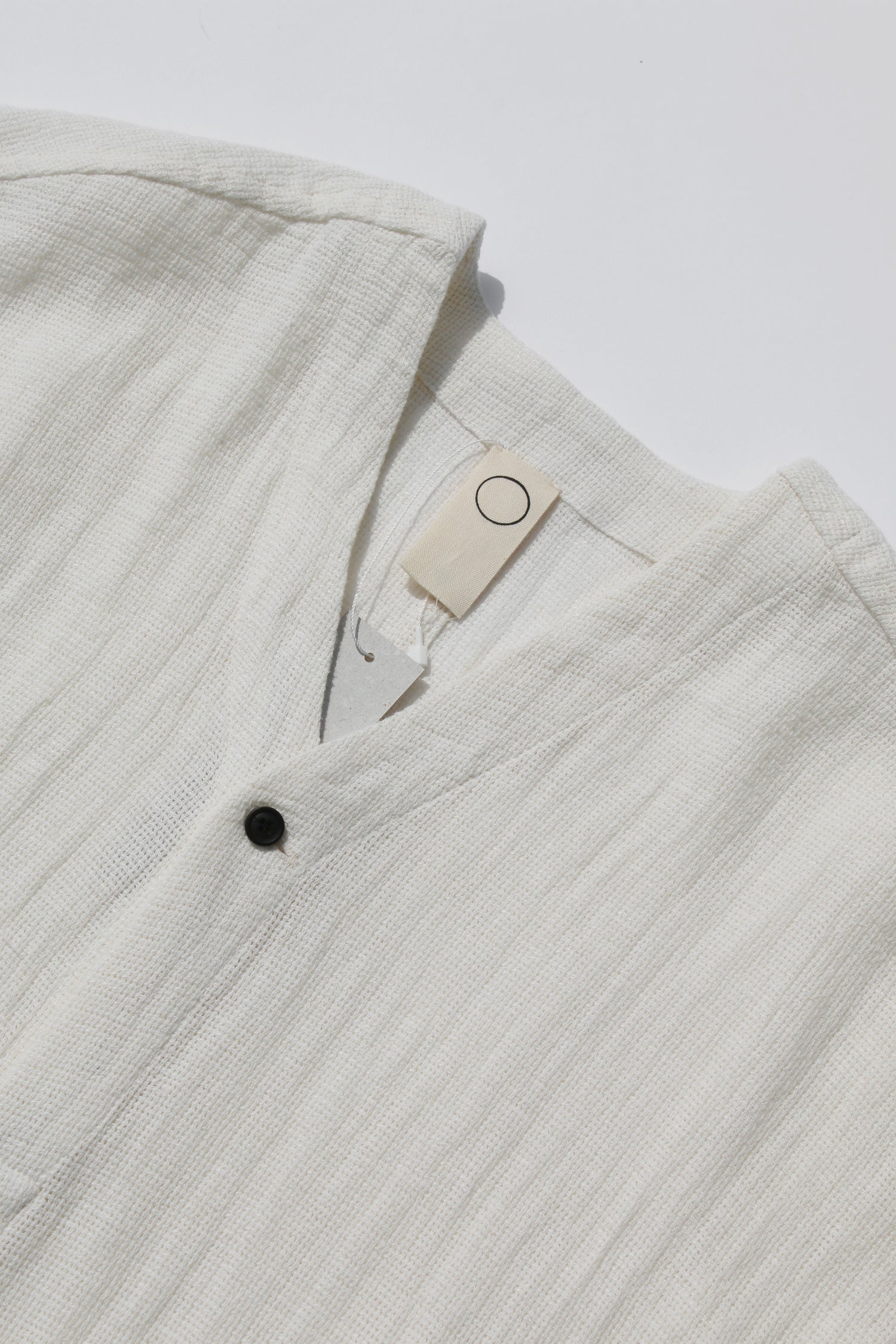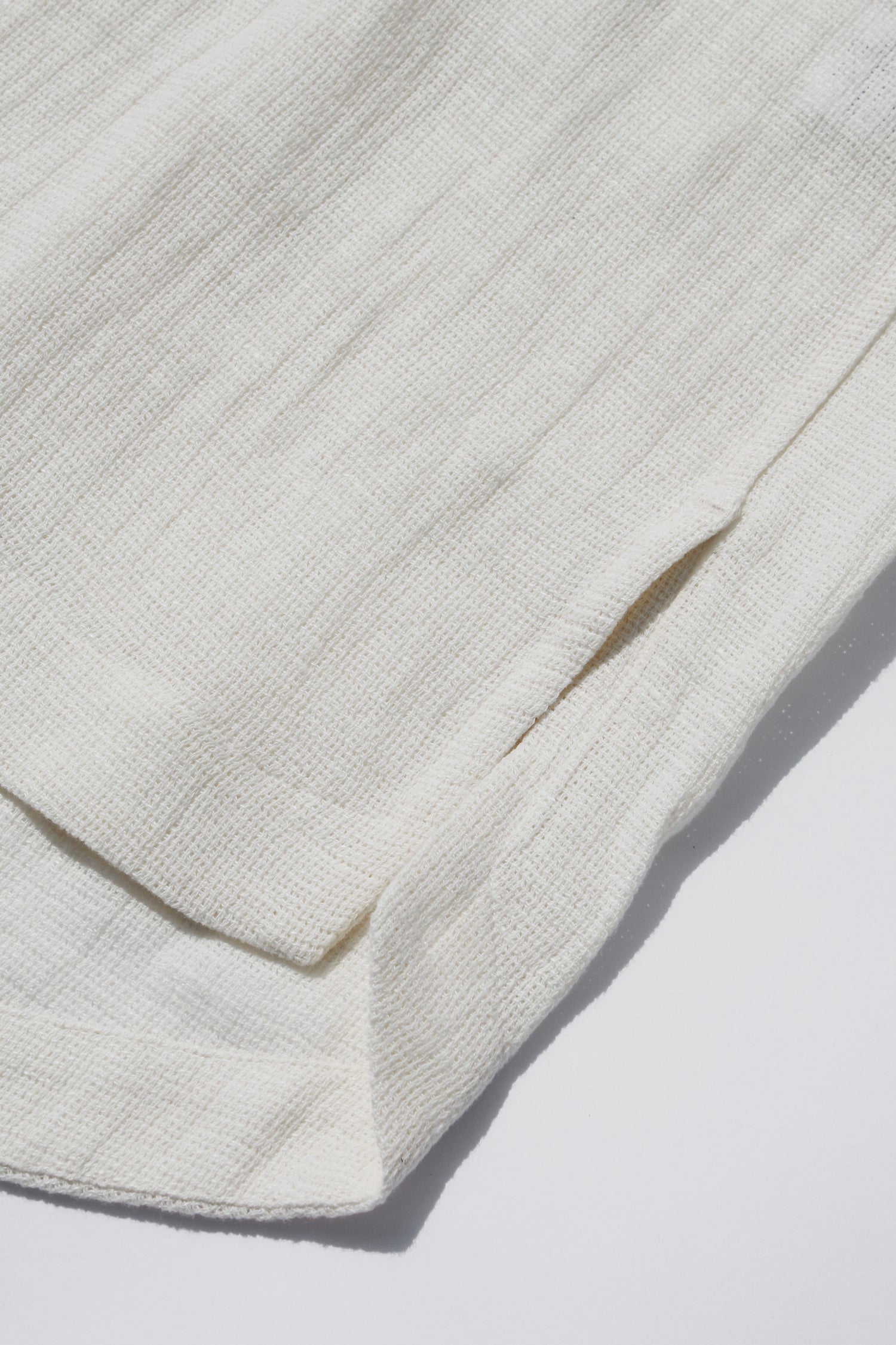 リネンコットンを使用した、パナマメッシュ素材のチュニックシャツ。身幅を広くとったリラクシーなシルエット。長めの着丈でアウターとのレイヤードが楽しめる。後ろ身丈が少し長く、裾に短めのスリットが入ります。同素材のロングシャツもご用意。