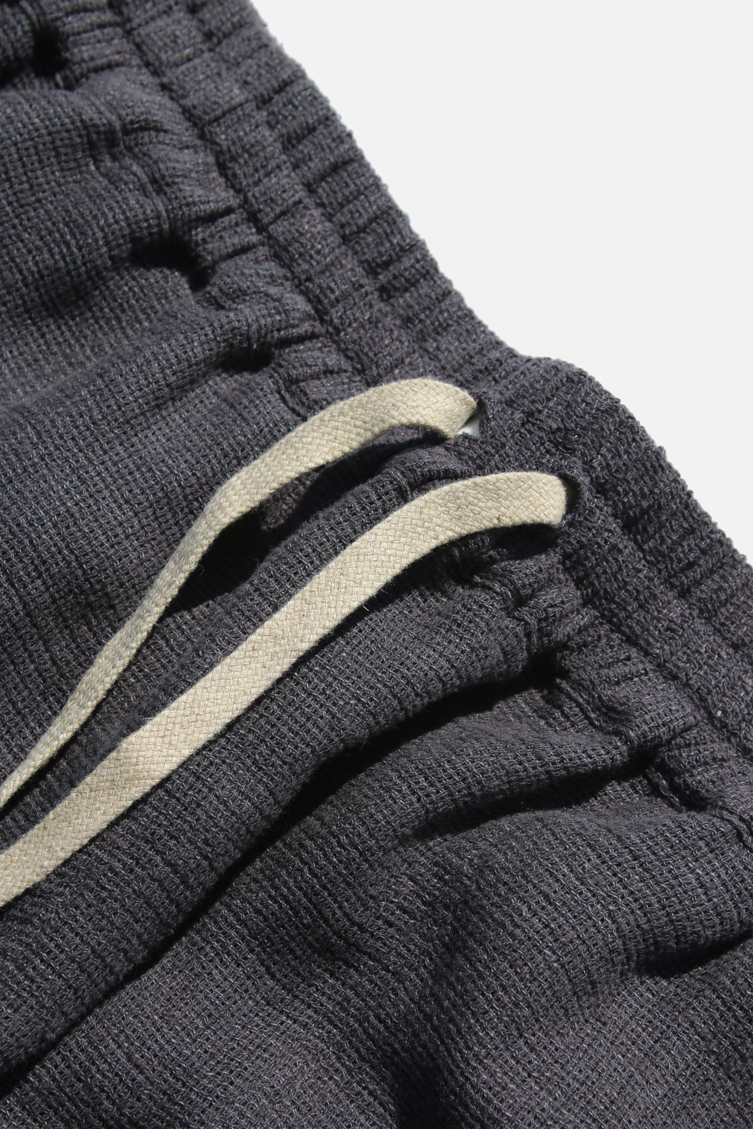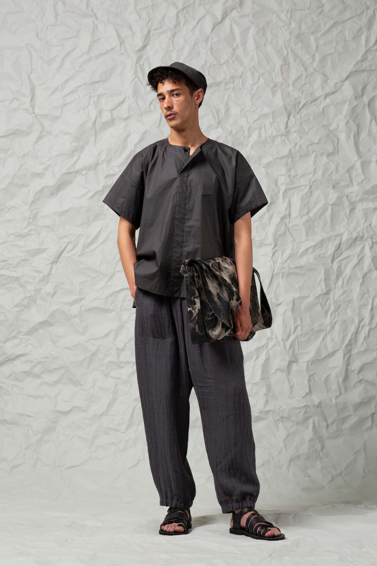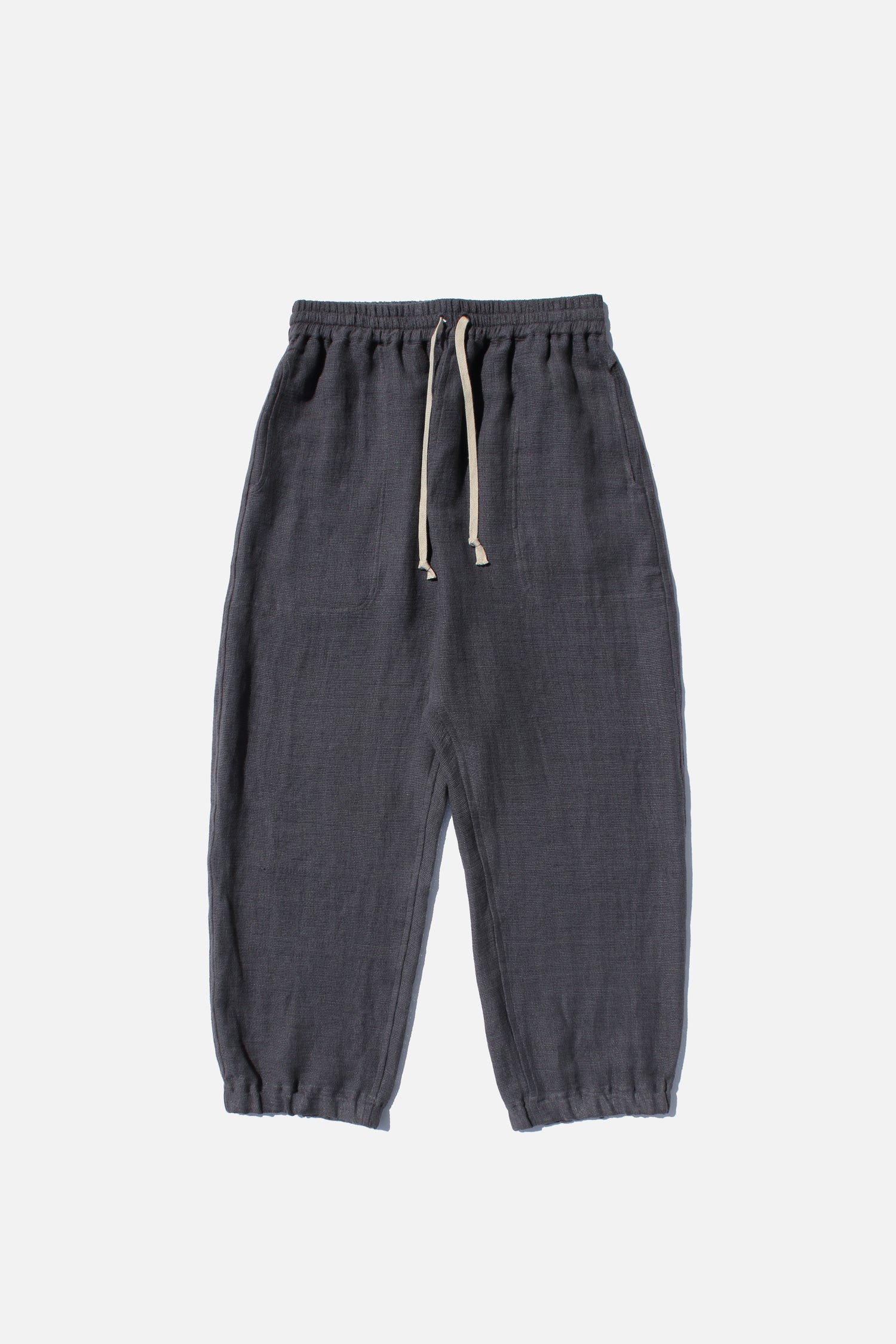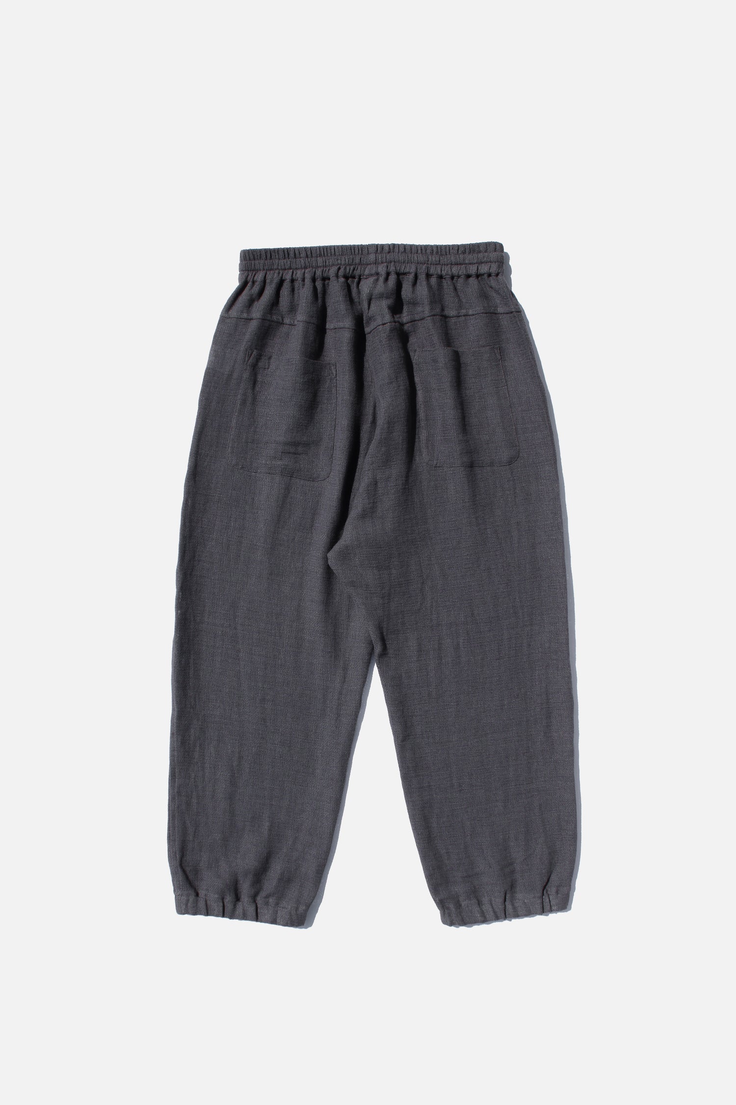 コットンの丈夫さとリネンのしなやかさを併せ持った生地を使用したトラックパンツ。ウエスト部分にはゴムと紐が付いており、ベルトを使わずに着用することができます。便利なサイドポケットも付いています。
