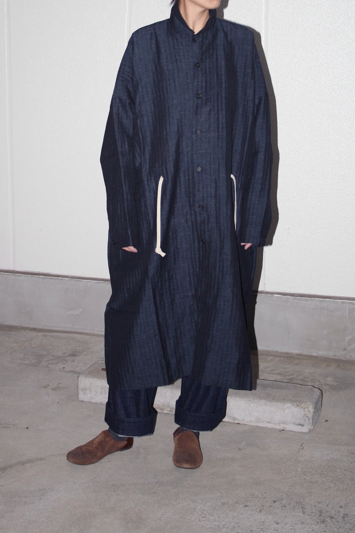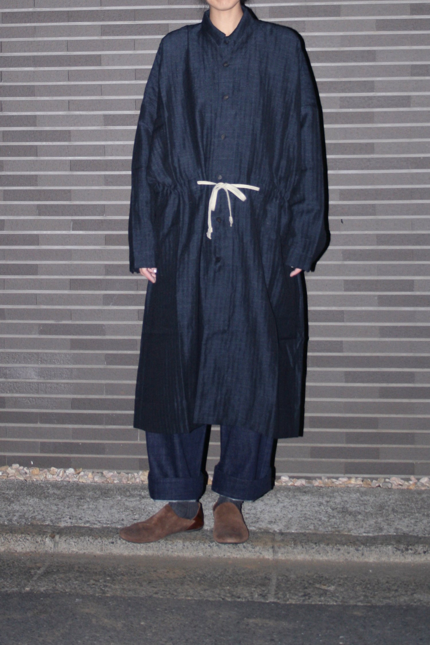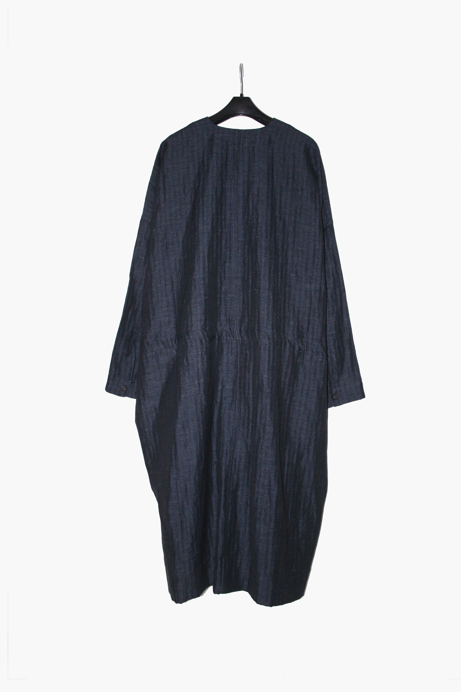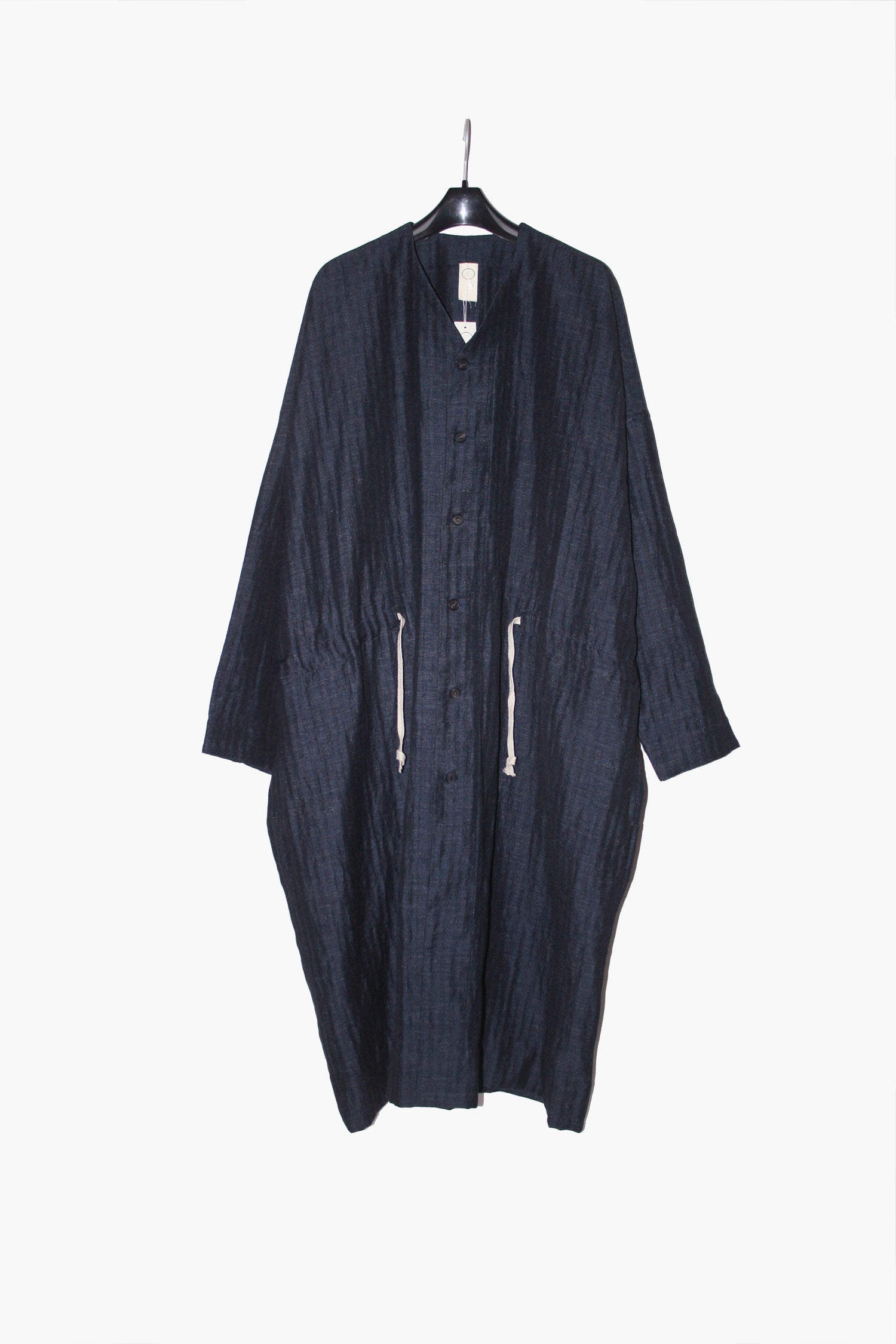 ソフトヘリンボーンの質感が上品なVネックノーカラーロングシャツ。上質なバージンウールリネンブレンドのオリジナル生地。フロントはブラックボタン仕様。ウエストはドローコードでシルエットやボリュームの調整も可能。袖口にはボタンアジャストもデザイン。両サイドにはユーティリティハンドポケットも搭載。コートのように着用して頂けるロングシャツになります。