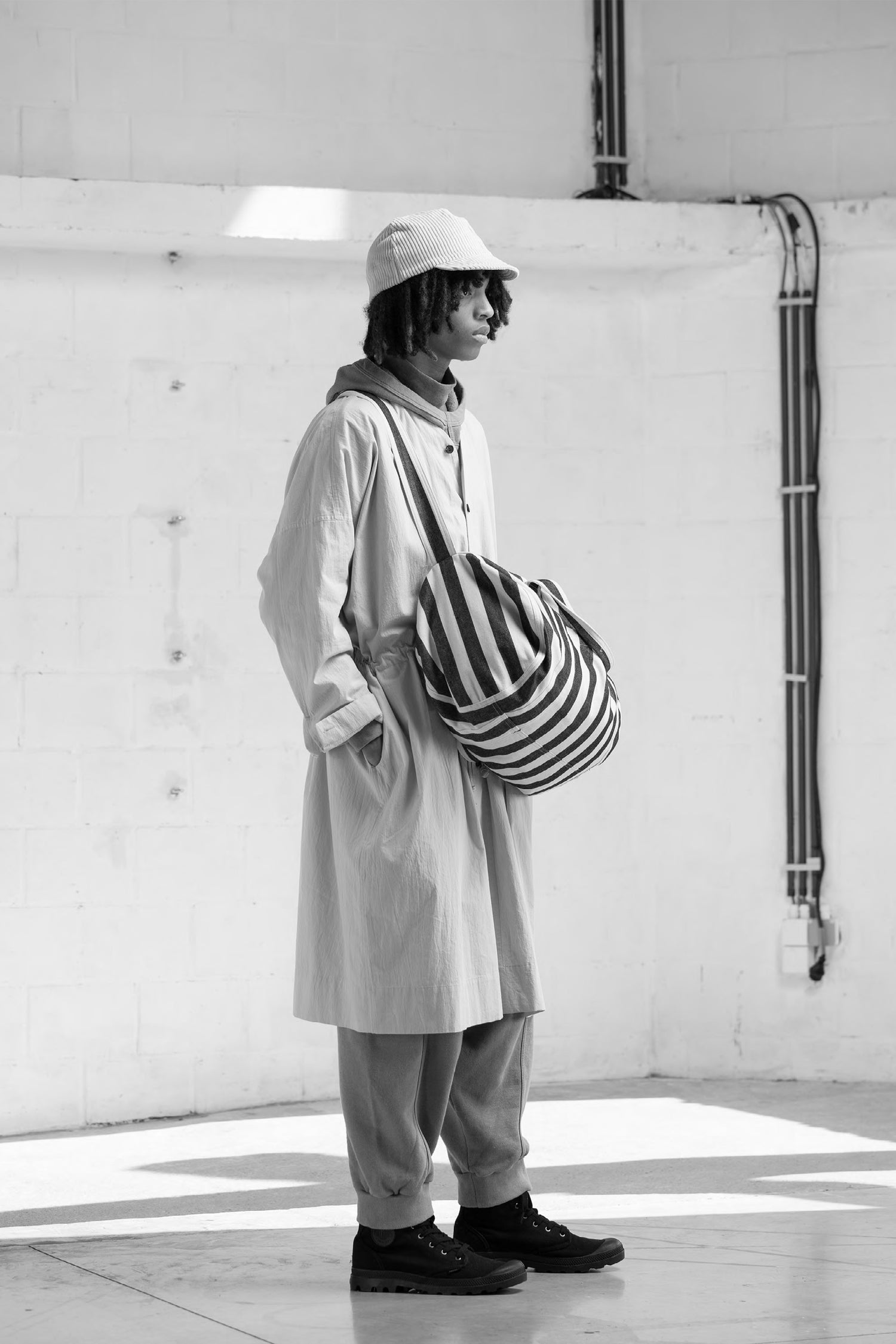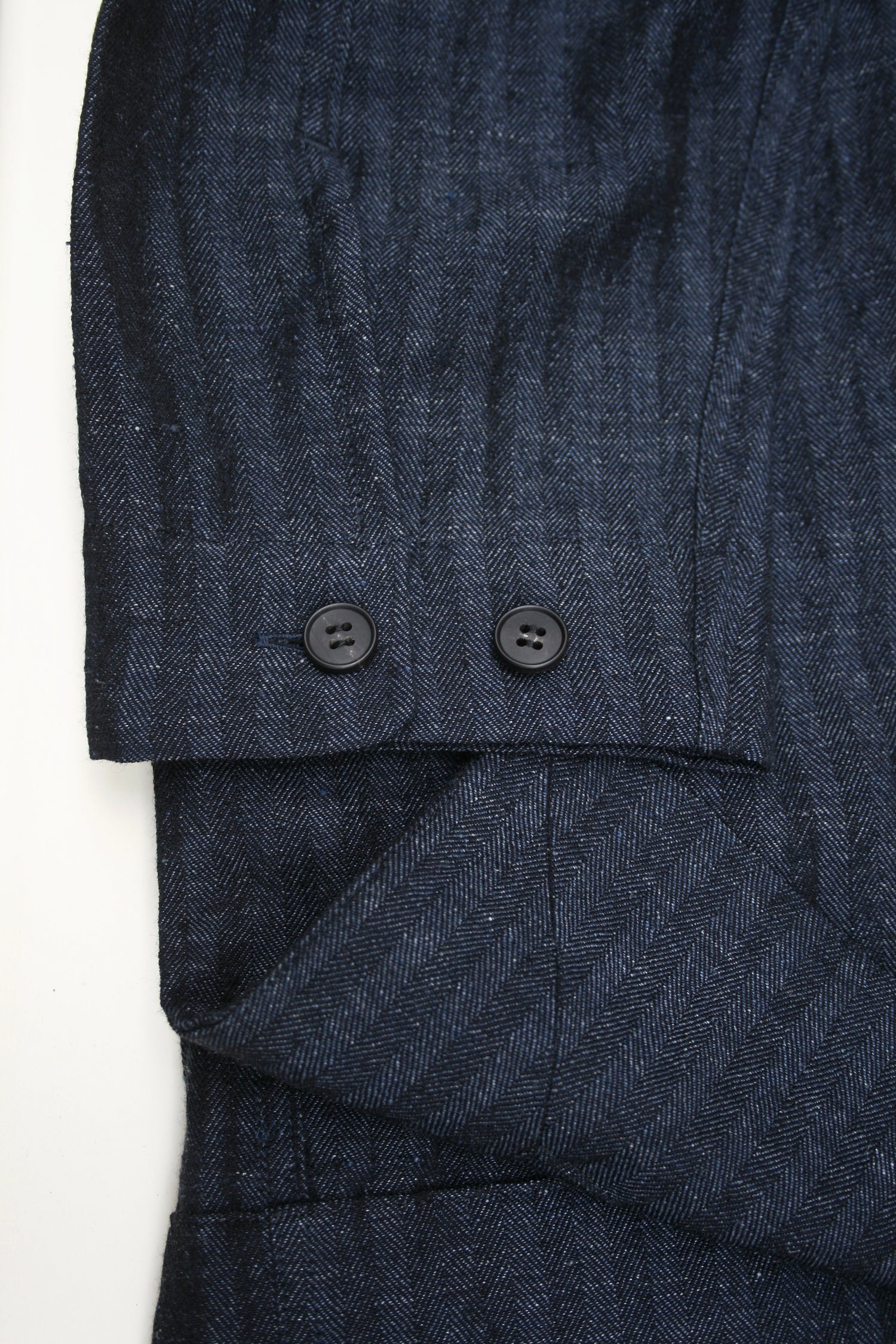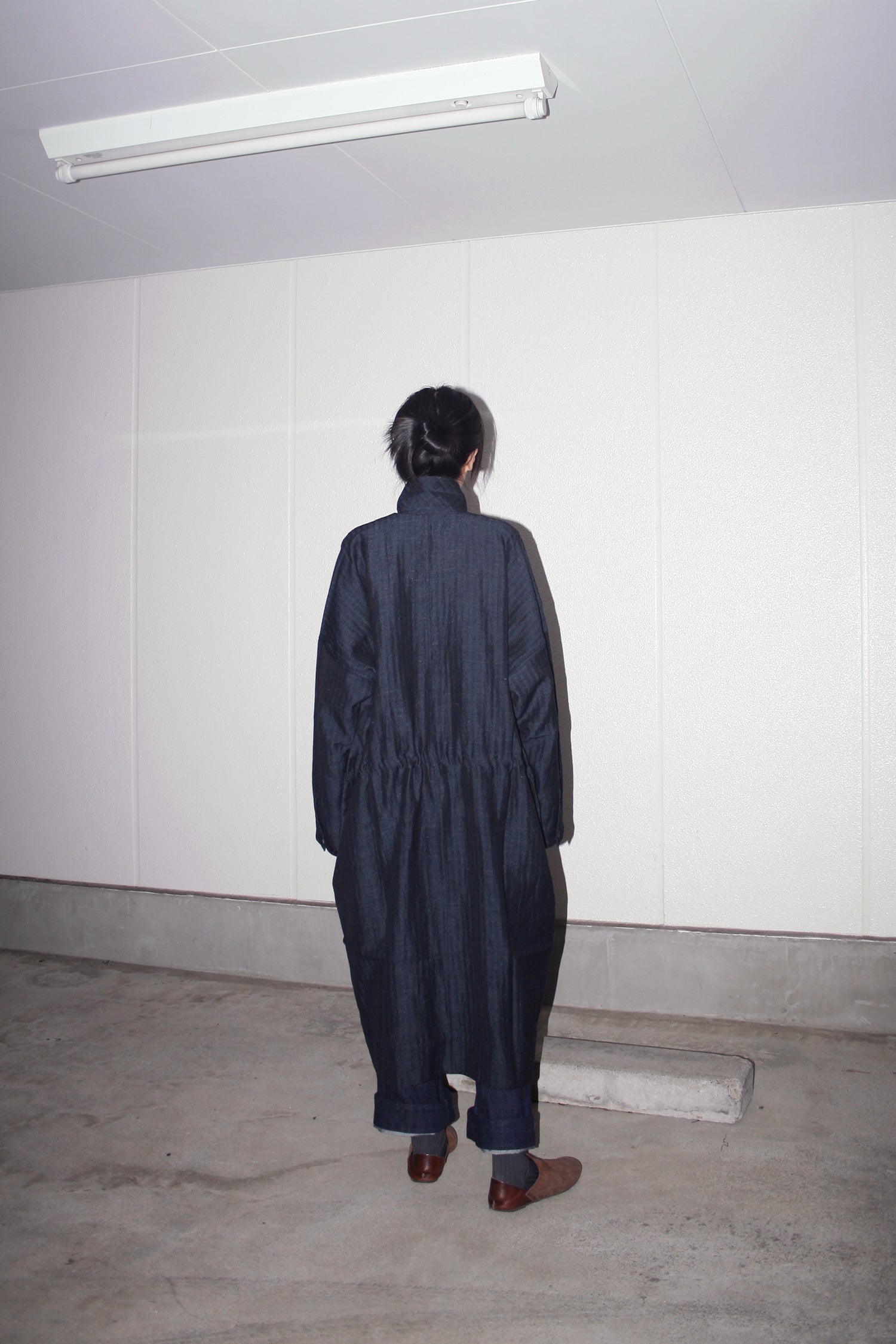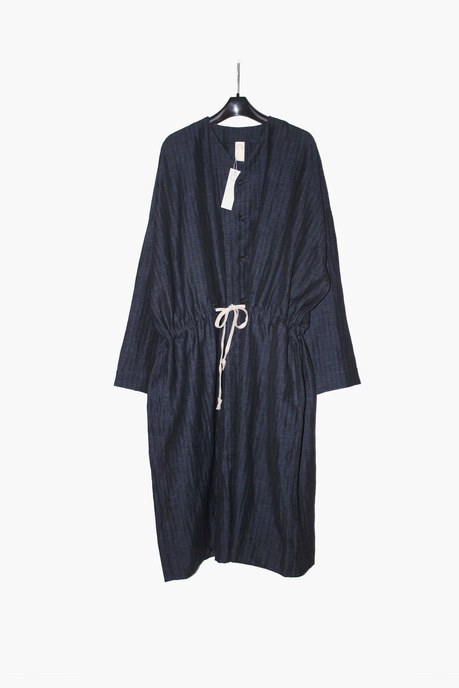 ソフトヘリンボーンの質感が上品なVネックノーカラーロングシャツ。上質なバージンウールリネンブレンドのオリジナル生地。フロントはブラックボタン仕様。ウエストはドローコードでシルエットやボリュームの調整も可能。袖口にはボタンアジャストもデザイン。両サイドにはユーティリティハンドポケットも搭載。コートのように着用して頂けるロングシャツになります。