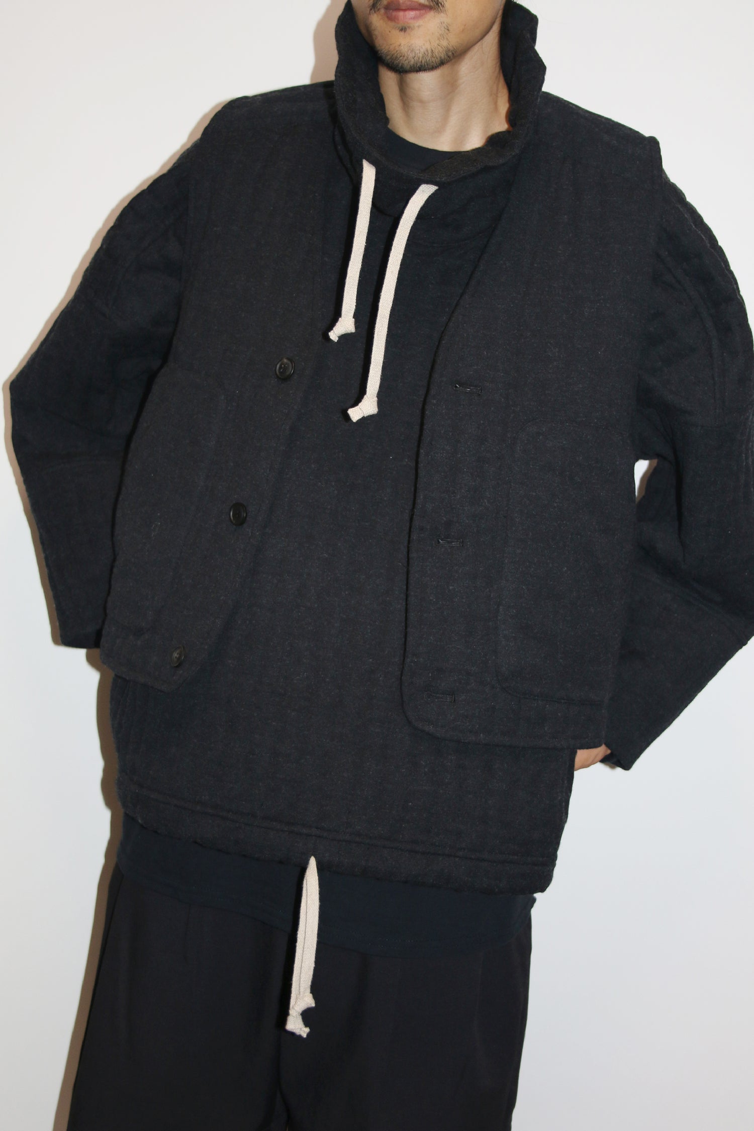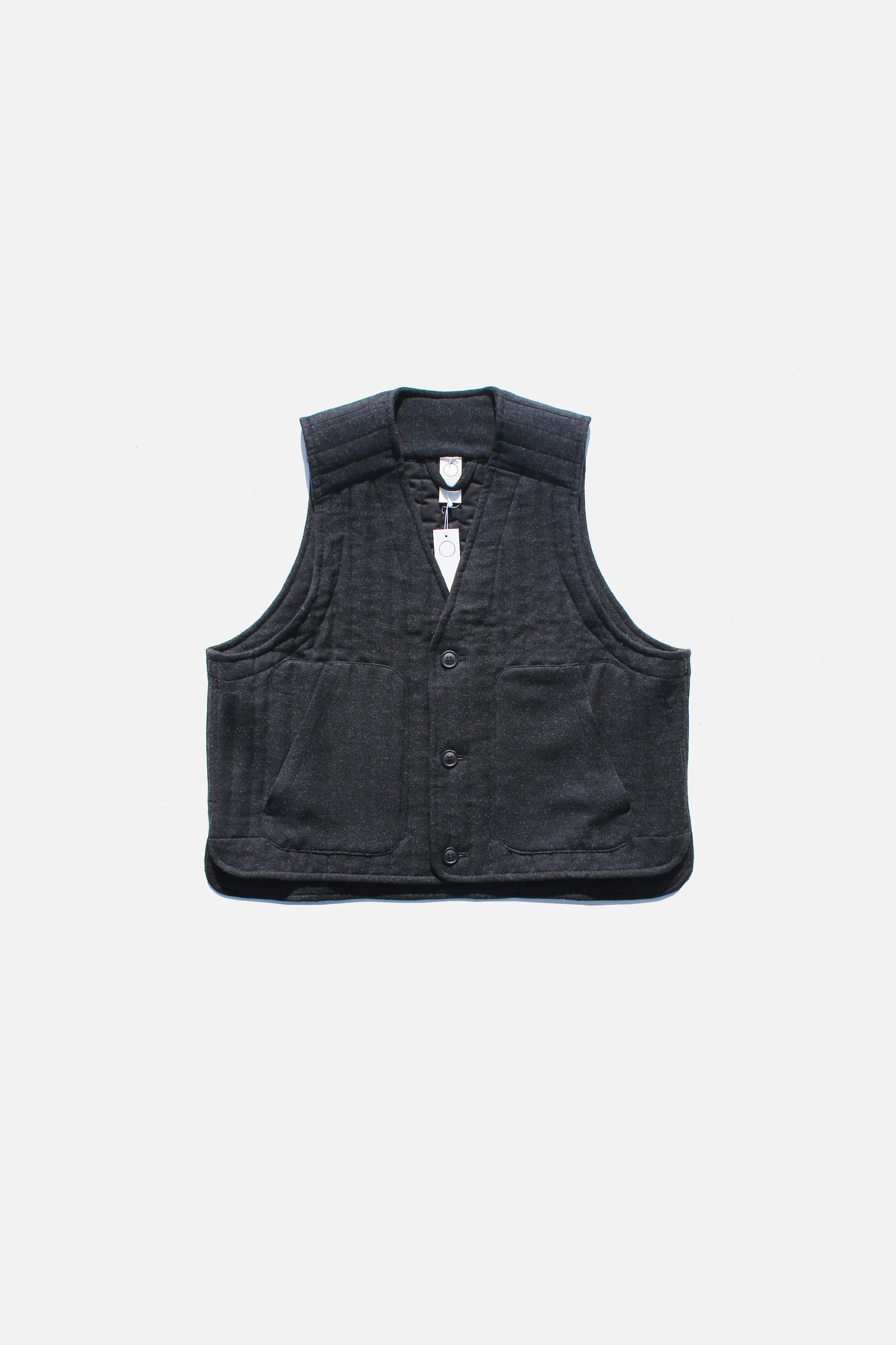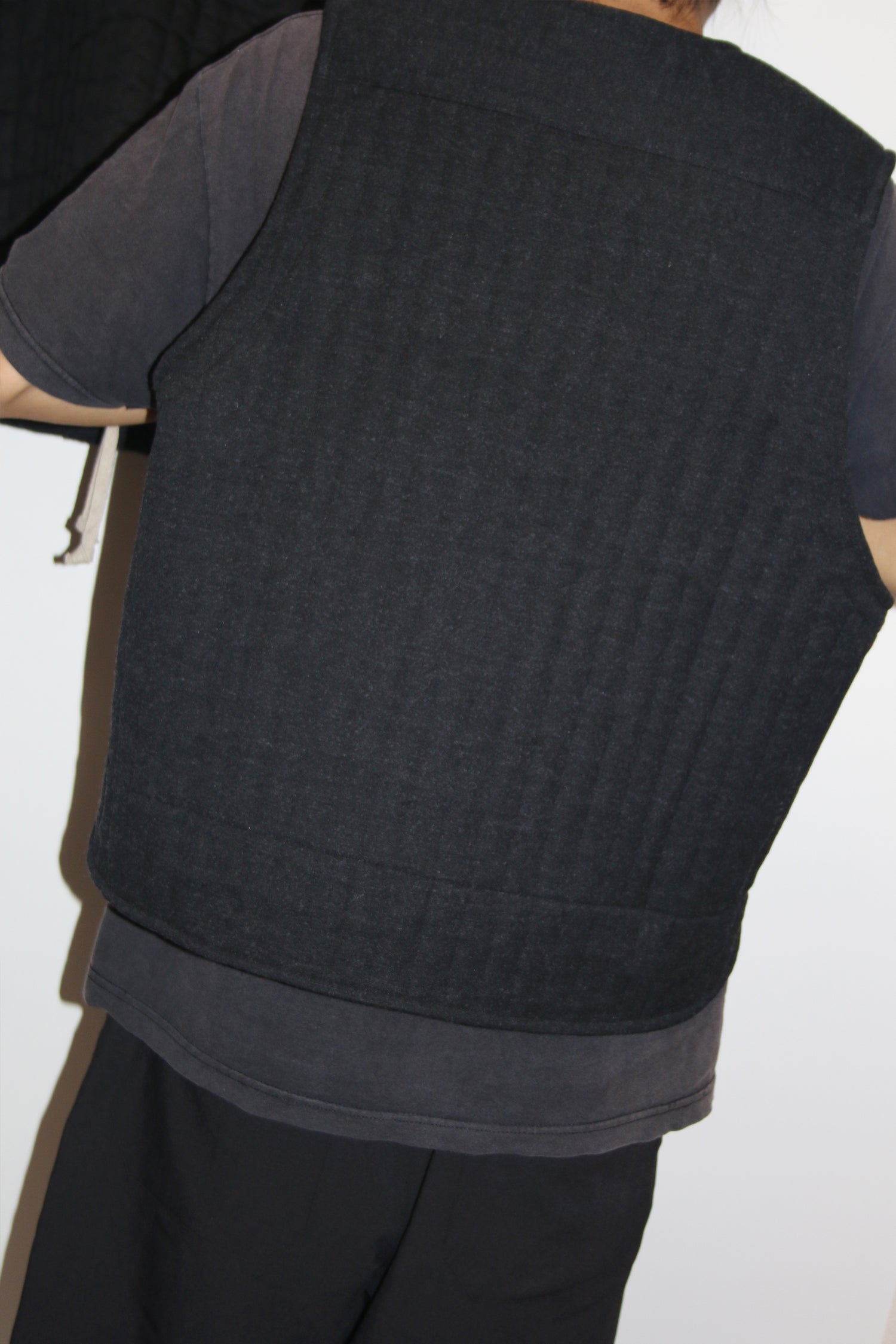 ビスコース、ウール、カシミヤの、上質な素材を使用したボディウォーマーベスト。程よいゆとりがあって着やすく、両サイドに嬉しいポケットがついています。アウターライクに着ることができ、ミドルレイヤーとしても使えます。ワイドパンツとセットアップもお勧め。