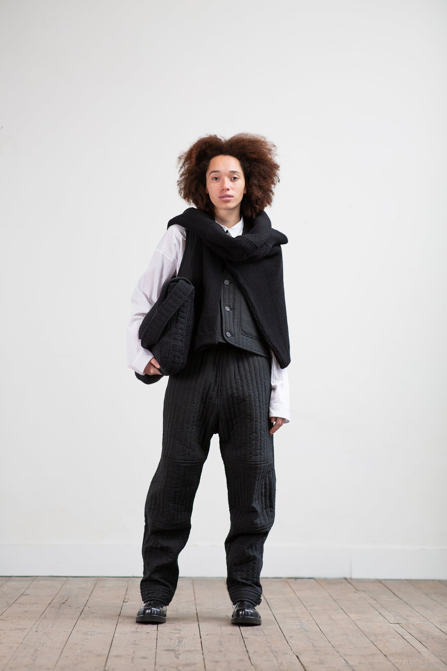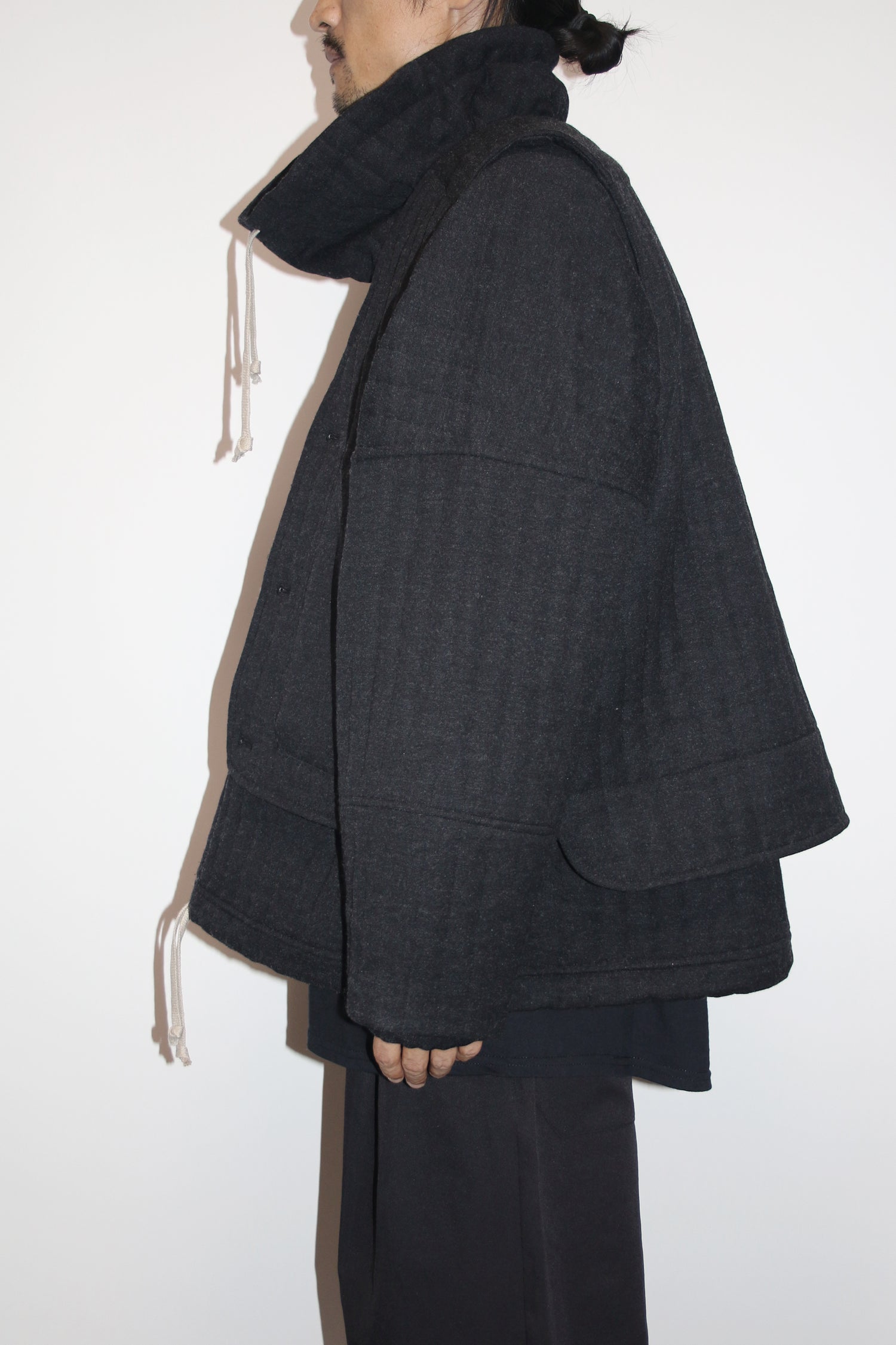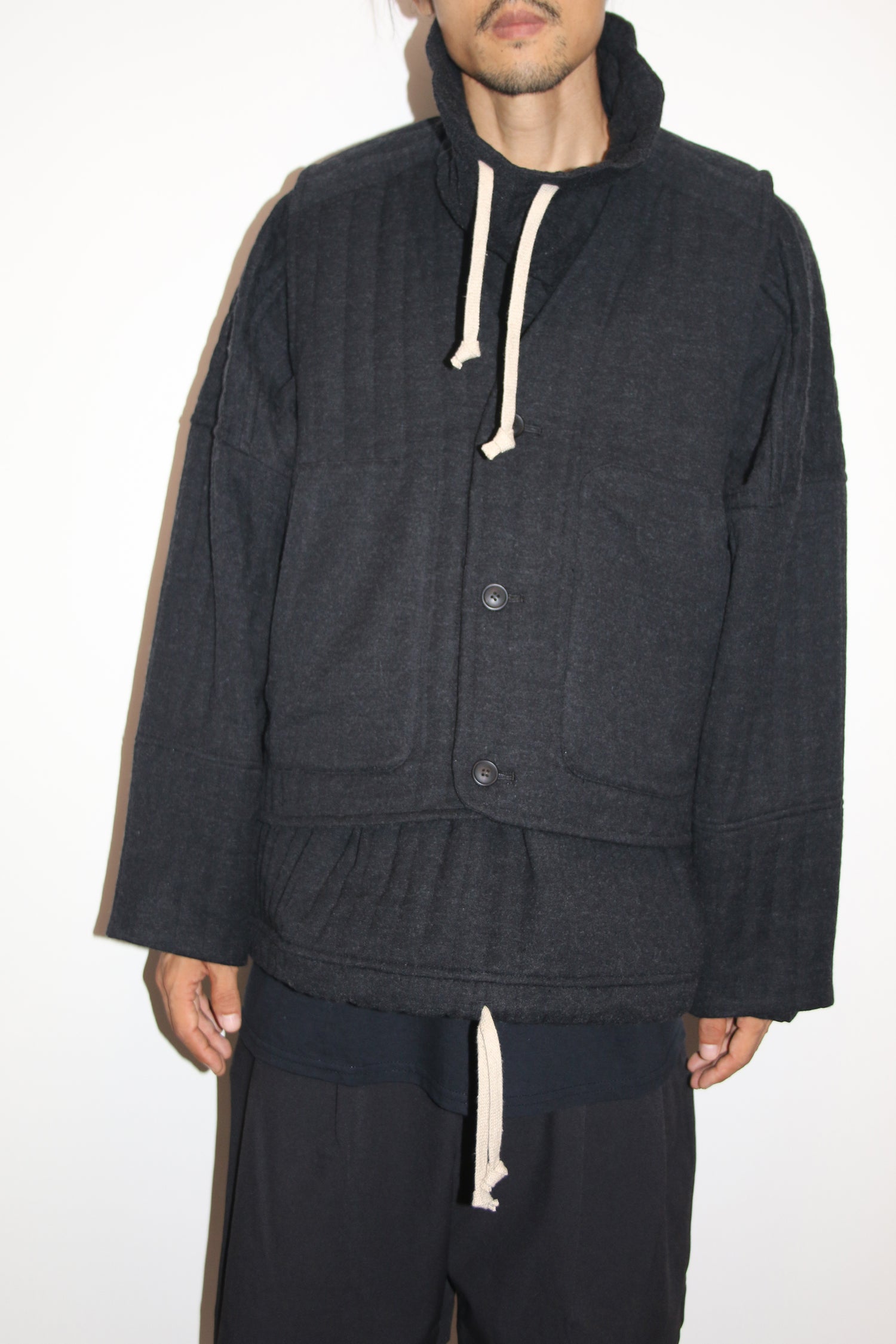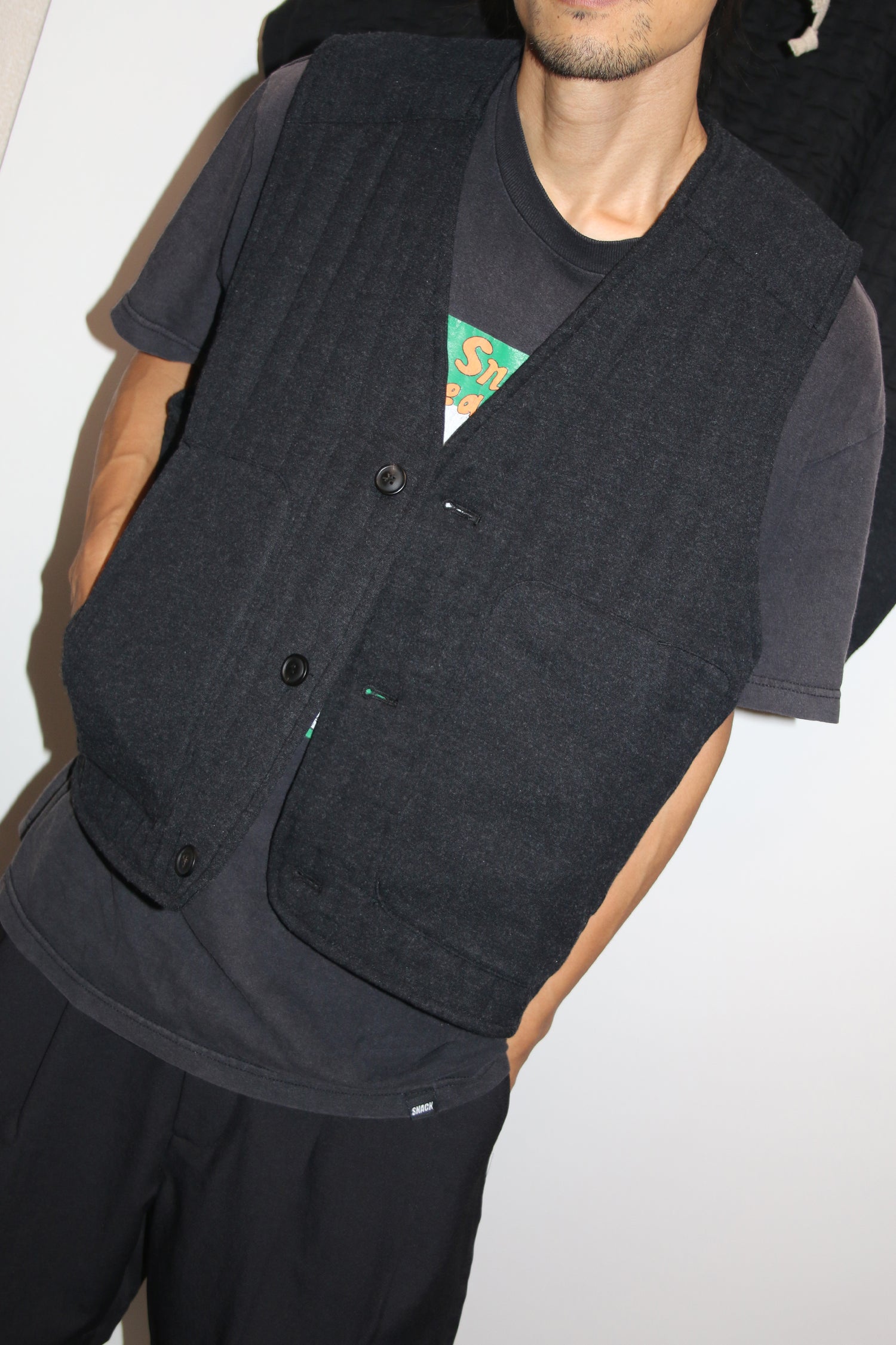 ビスコース、ウール、カシミヤの、上質な素材を使用したボディウォーマーベスト。程よいゆとりがあって着やすく、両サイドに嬉しいポケットがついています。アウターライクに着ることができ、ミドルレイヤーとしても使えます。ワイドパンツとセットアップもお勧め。