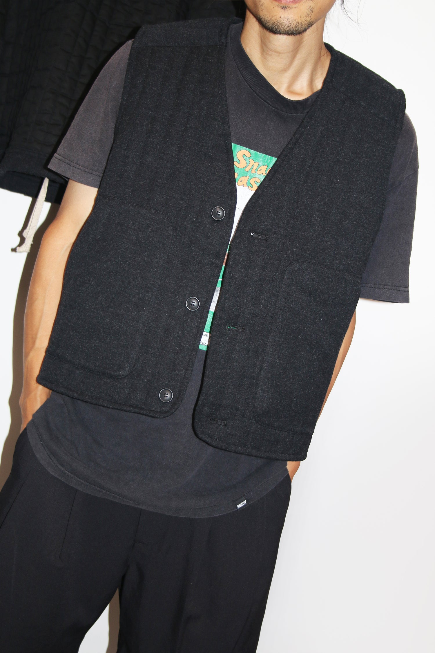 A fascinating body warmer vest of the current situation: reverse button, weather change, this is vacation, cheers to a great time. Finished with front patch pockets.