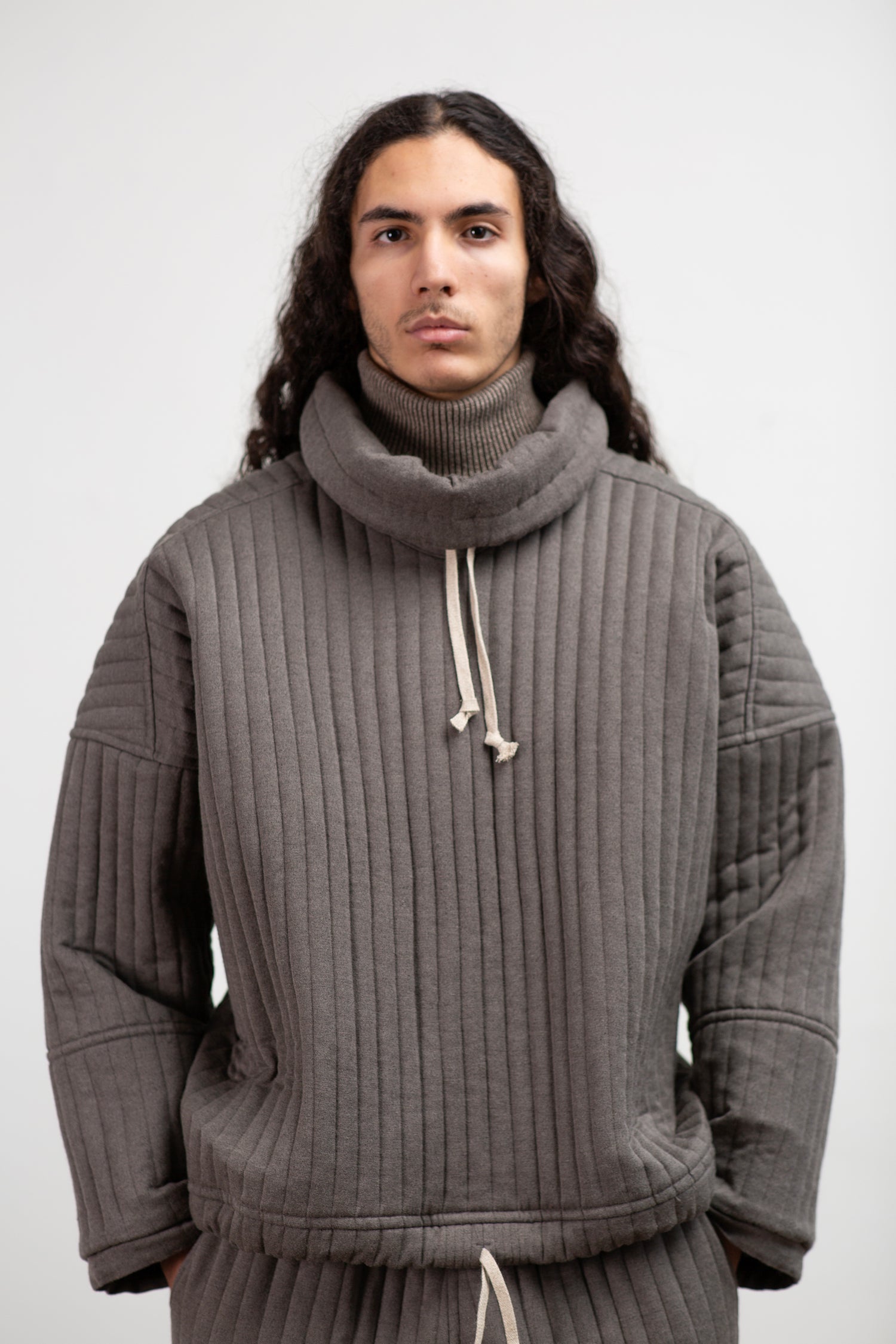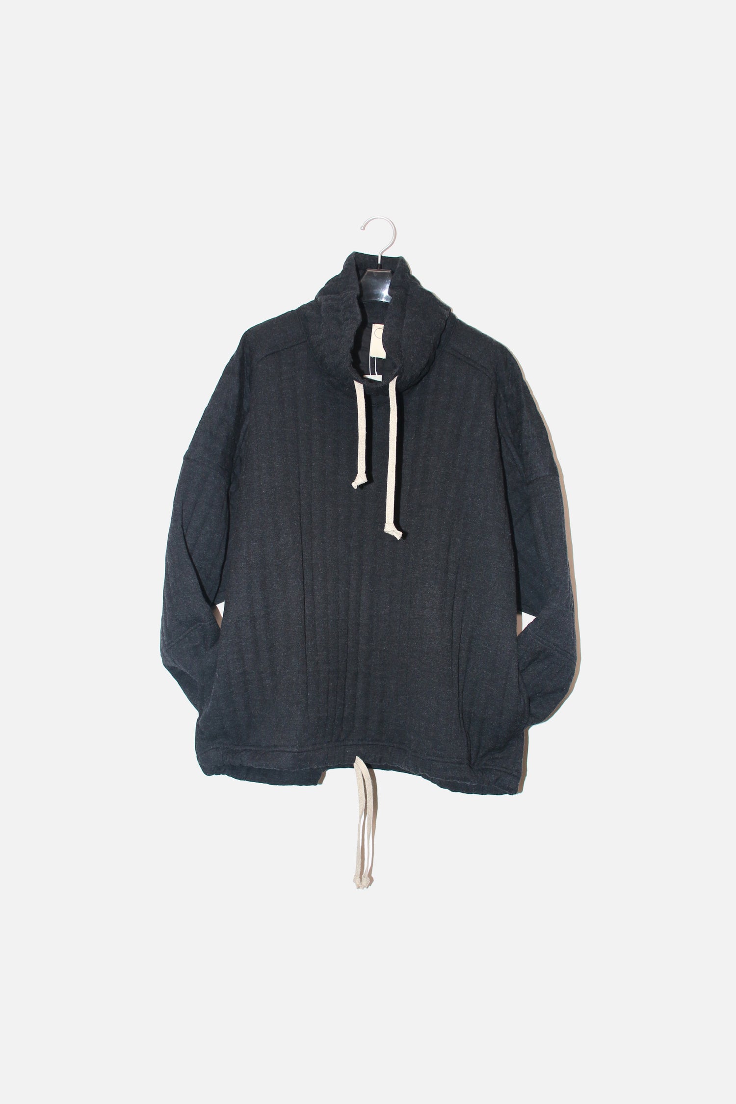 Relaxed fit high-neck pullover in anthracite. The warmth is good, and the warmth is felt through the material. Finished with dropped shoulder, neck, cuff and hem drawcord. Unisex.