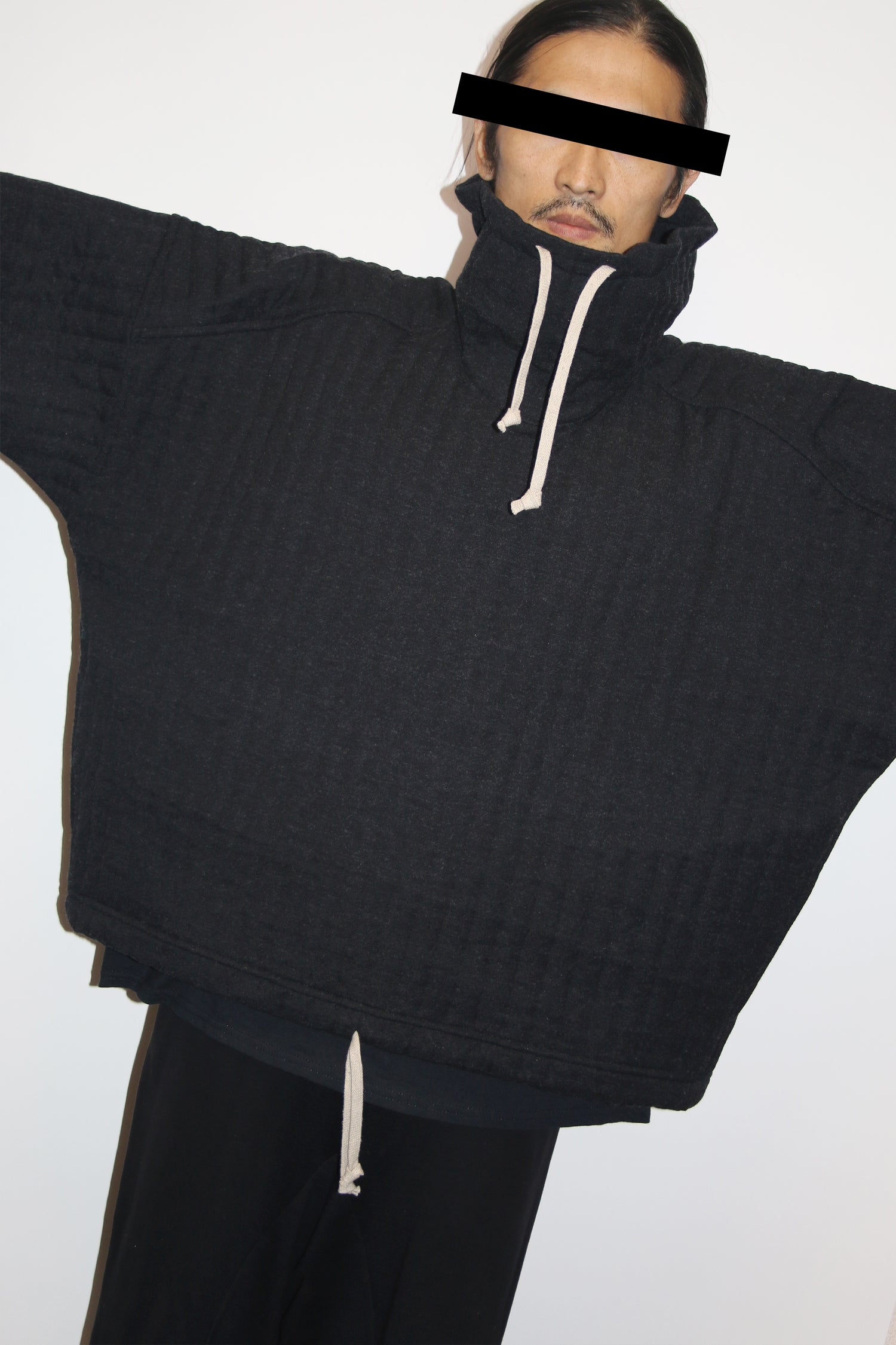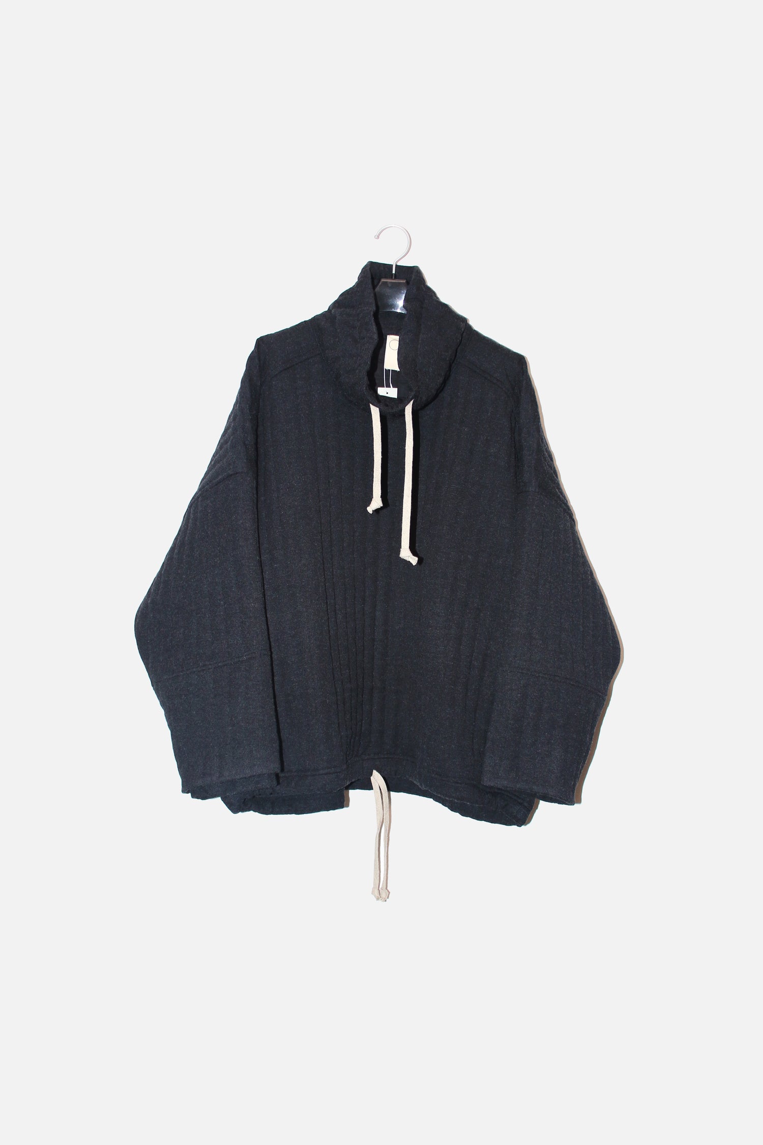オーバーサイズに設定したハイネックプルオーバーです。ビスコース、ウール、カシミヤ混の生地を使用しております。ソフトな肌触りと保温性のある生地です。ネック、袖口、裾のドローコードによるシルエットの可変と防風性の向上。一枚でもインナーとしても幅広くお使いいただける一着です。