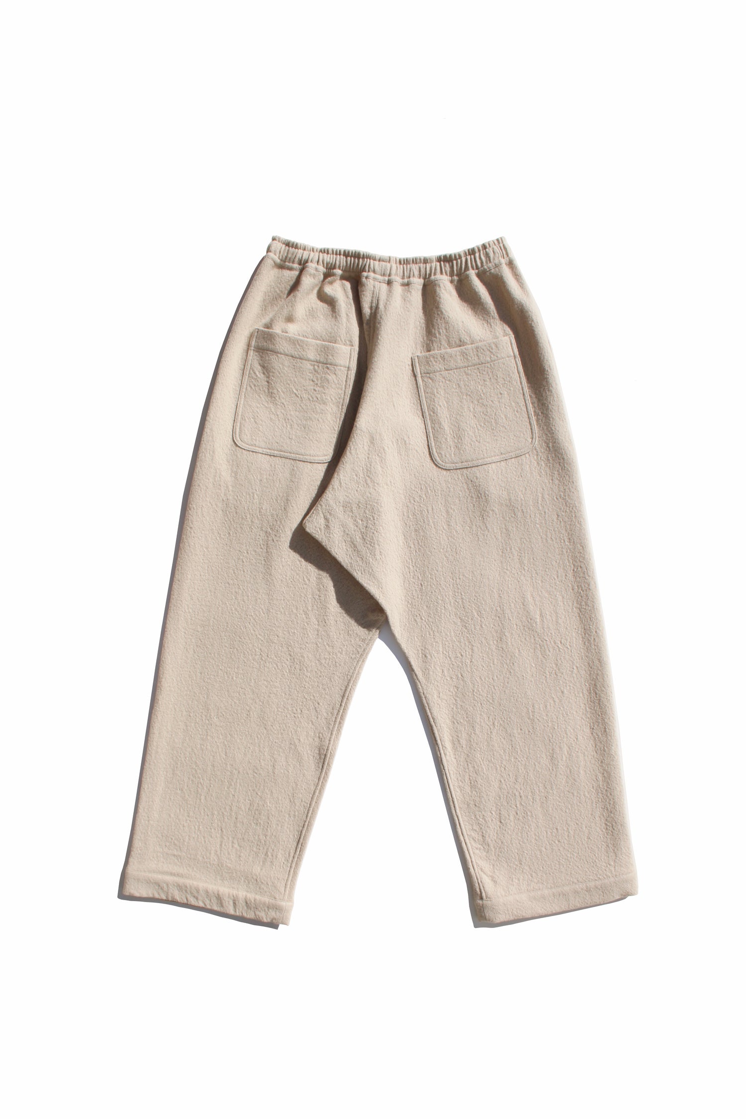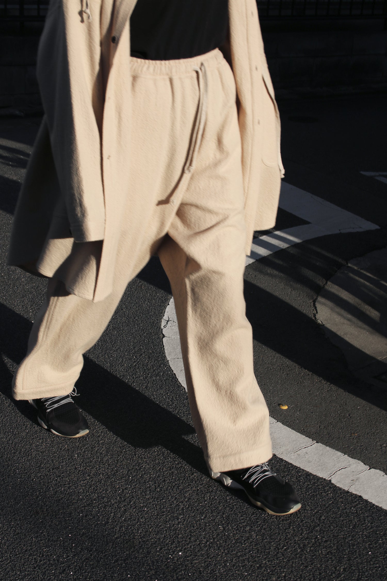 上質なウールツイルを使用したワイドイージーパンツ。起毛感のあるテディーウールツイル生地で着用時、ふわっとした肌触りが特徴。保温性に優れ、秋冬に最適な素材感。ストレートのワイドシルエット。両サイドポケットとヒップポケット付き。ウエスト部分はゴムとドローコードで、ストレスフリーな履き心地に。ユニセックスで着用可能。色目はARMY GREENとBEIGEの二色をご用意いたしました。同素材でパーカーのご用意がございます。