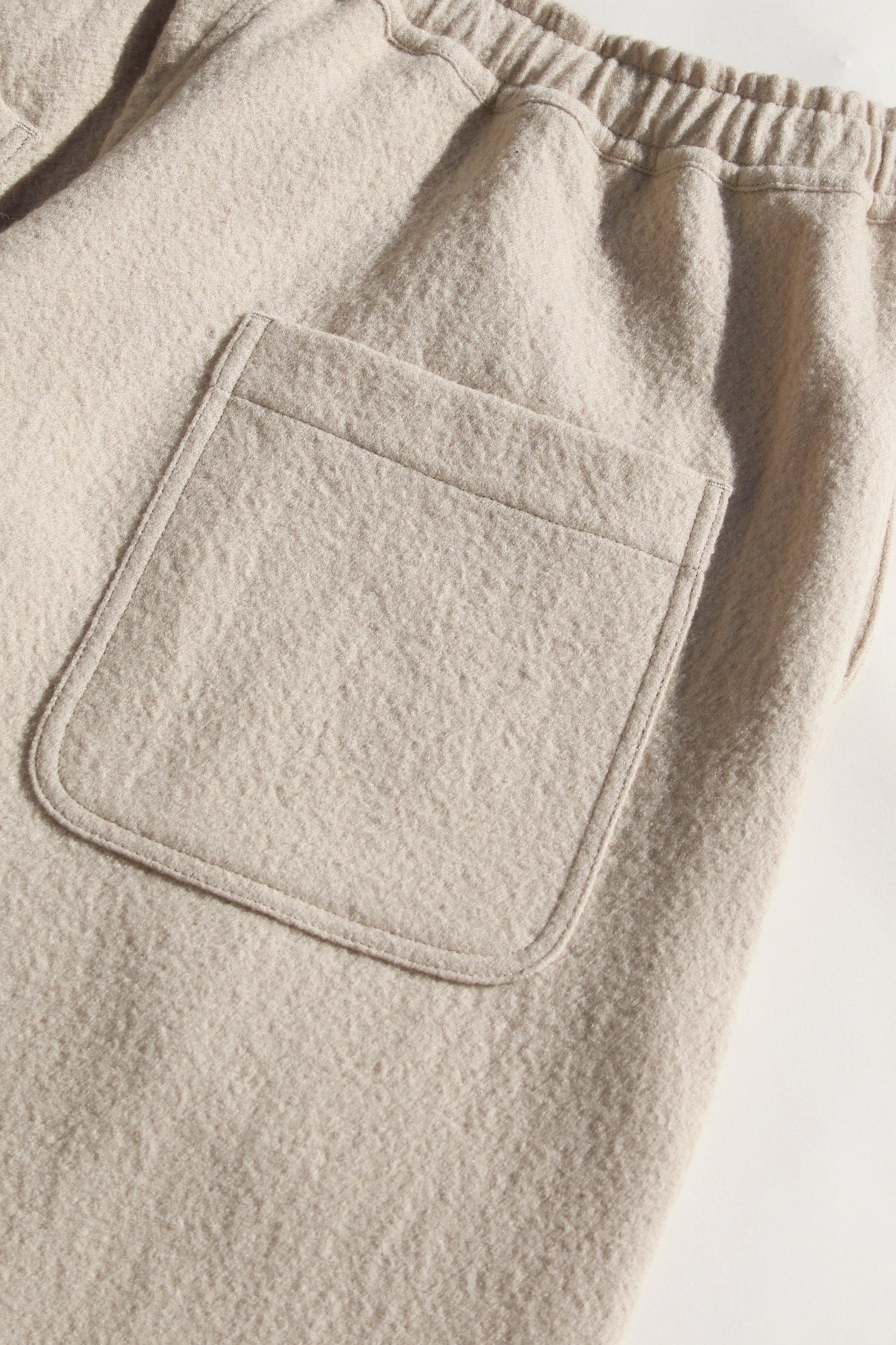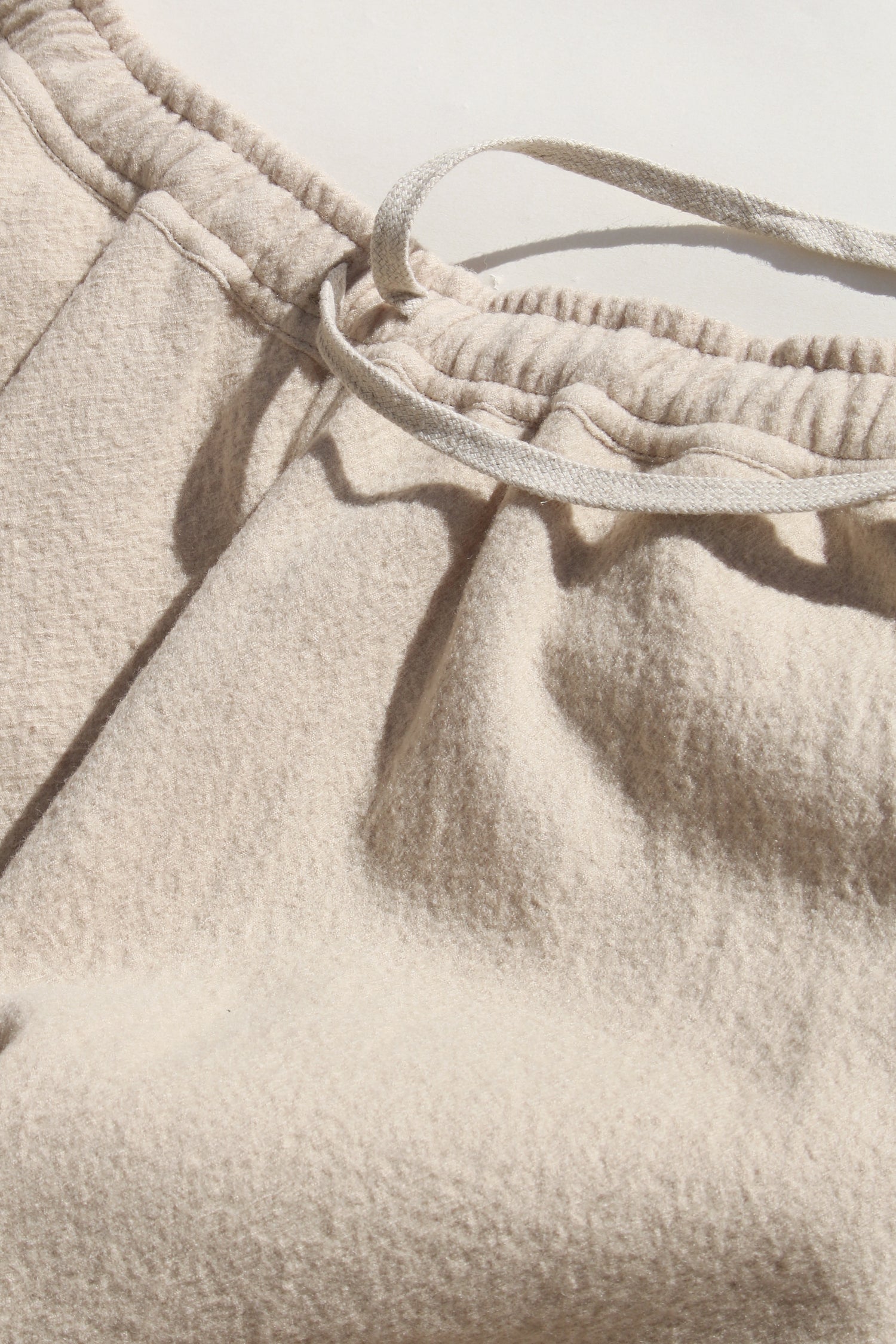 DETAILSRelaxed-fit wide leg easy pants for cold climate, well constructed and elaborated in lightweight teddy wool twill. Detailed with two side pockets, two back pockets and elasticated waist with external cotton drawcord.