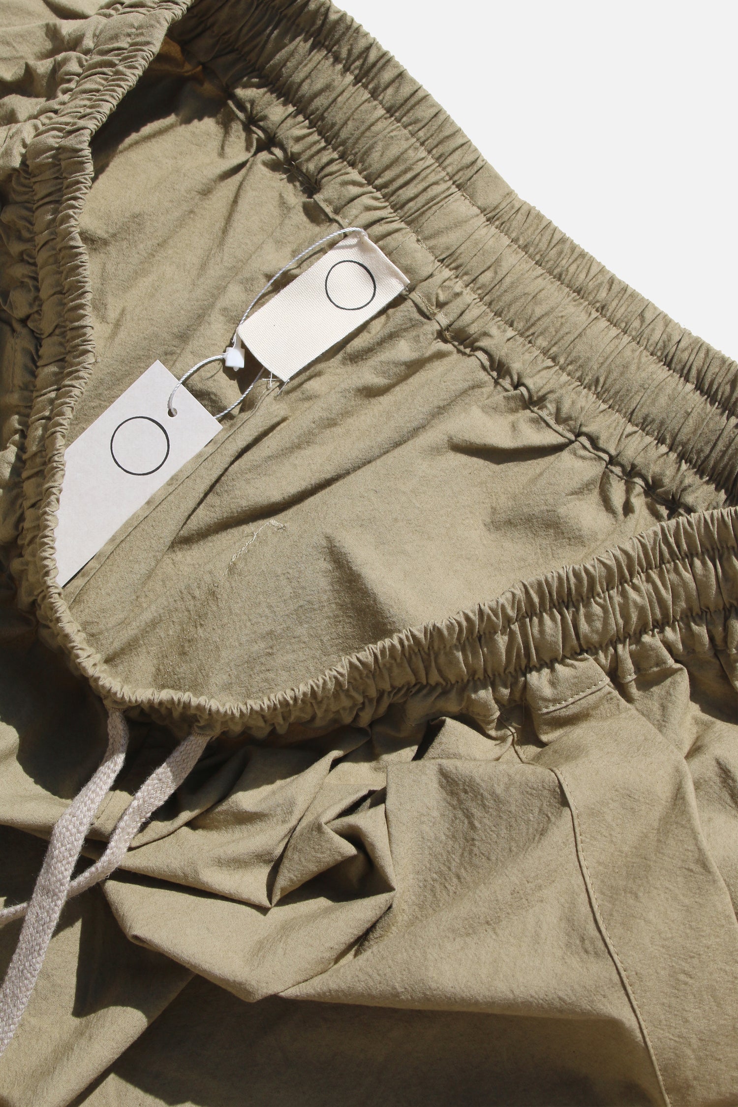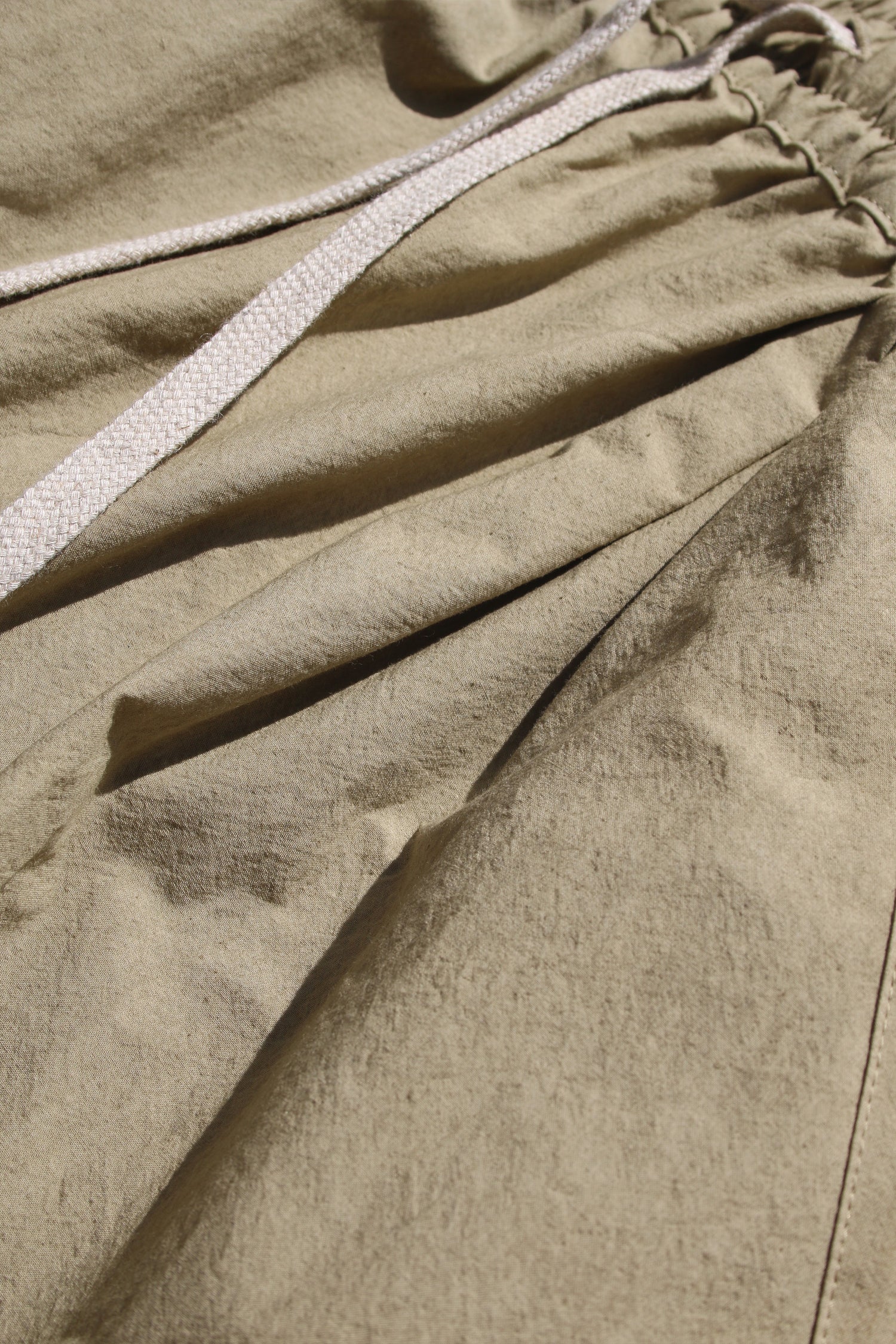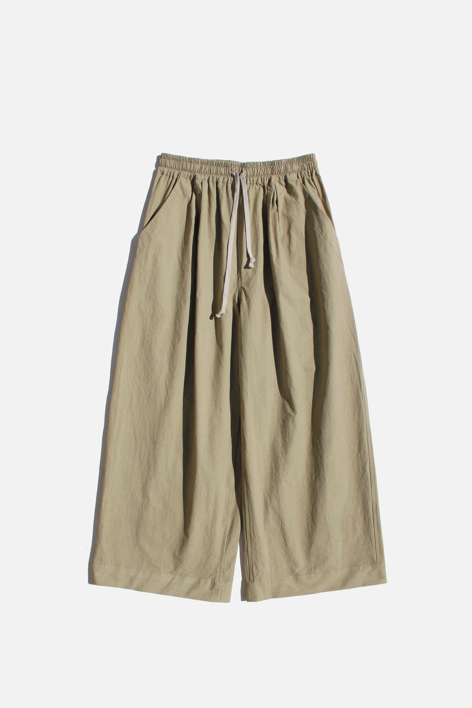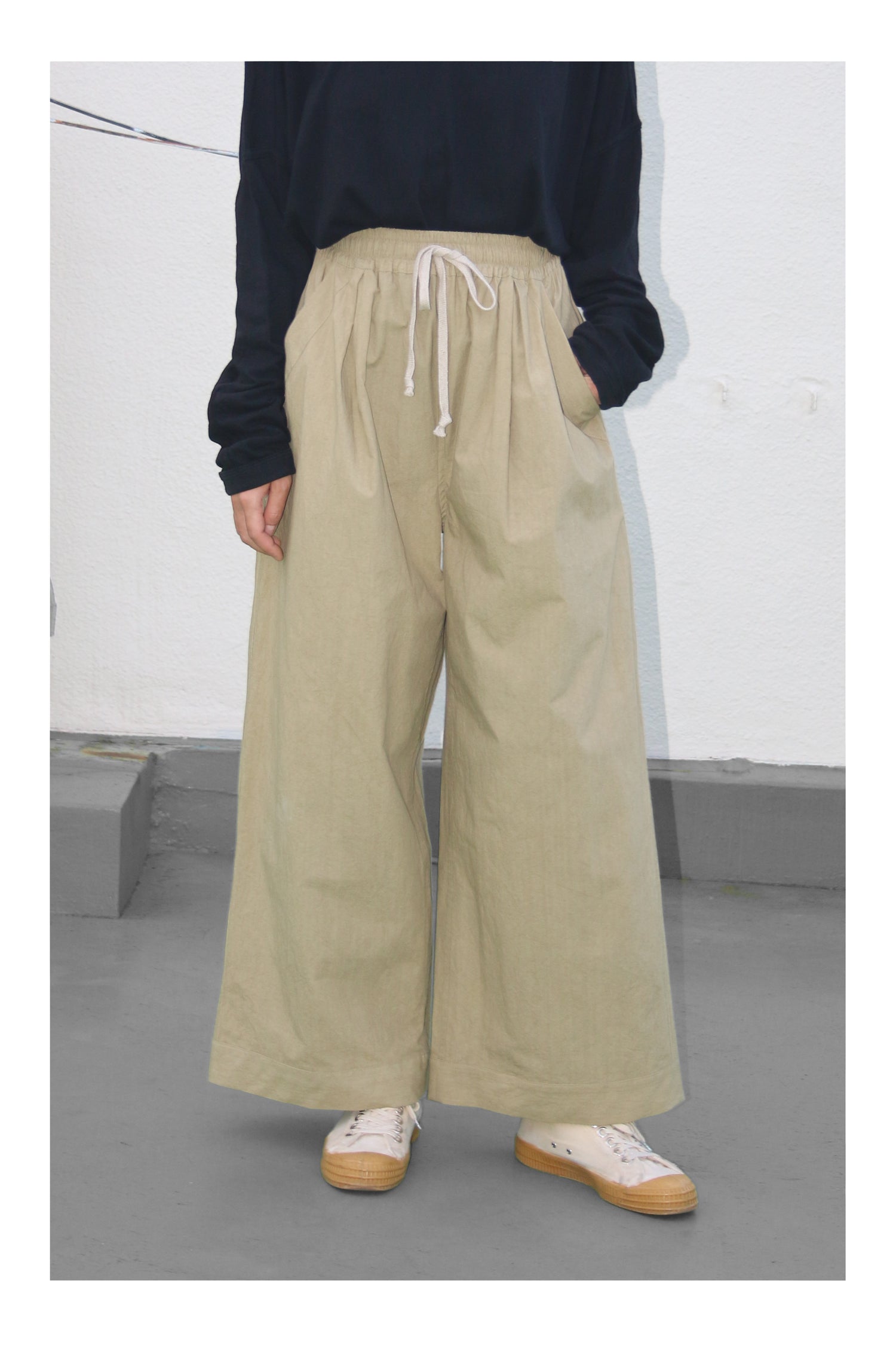 Loose-fit easy pants in khaki-beige found in the Mediterranean air. Made using Incredibly soft Japanese cotton. It, now, fits perfectly on long shirts. Features wide legs and oversized pockets.