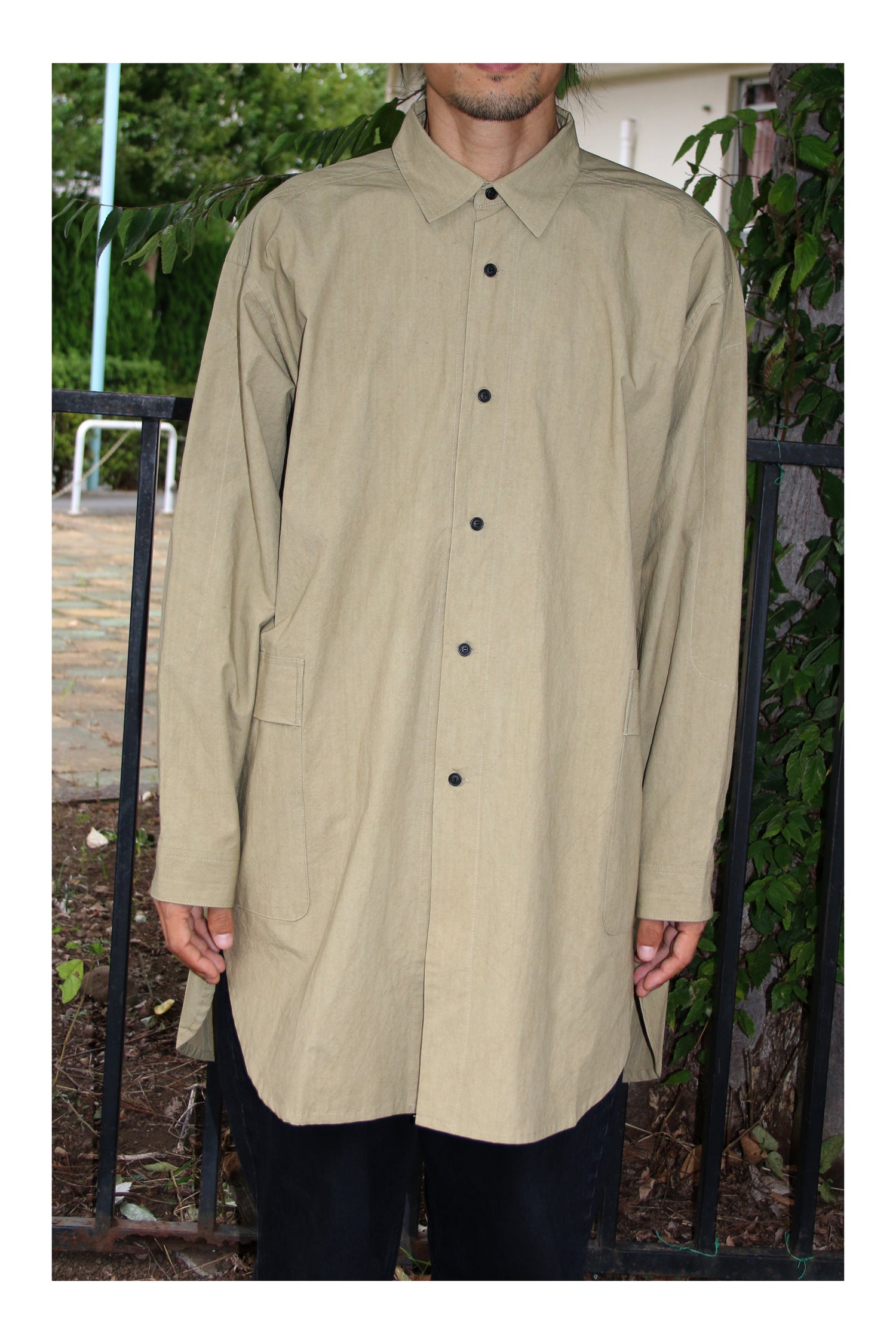 Relaxed fit long shirt influenced from Mediterranean merchants, western European skilled workers and much more. Cut by using ultrafine dense cotton with a soft handfeel and easy unisex shapes. Feature: garment washed slightly-wrinkled detail, long length with a dropped back hem and side slits, oversized patch pockets. It's hand-dyed fabric, there may be individual differences in the texture of the dyeing.