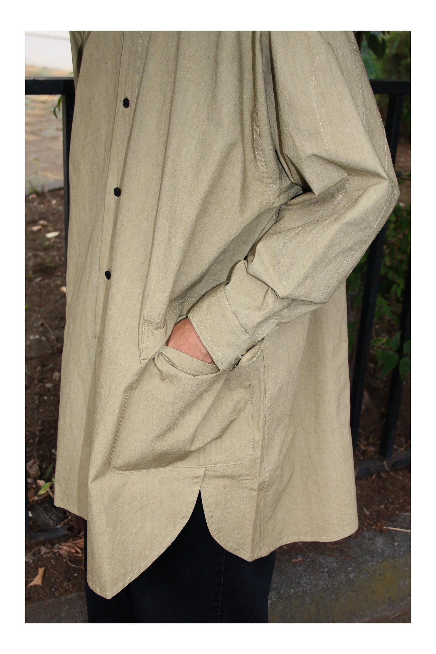 オーバーサイズに設定したロングシャツです。100%コットン。洗いざらしの柔らかい雰囲気と自然なシワ感、サラッとした肌触りが特徴です。肩・身幅広めに膝上の着丈のゆったりシルエット。サイドには便利なポケット付き。シャツとしてはもちろん、これからの季節の羽織としても活躍します。カーキベージュ、ブラックの2色展開。ユニセックスアイテムになります。手染めの為、染色の風合いに個体差が生じる場合があります。