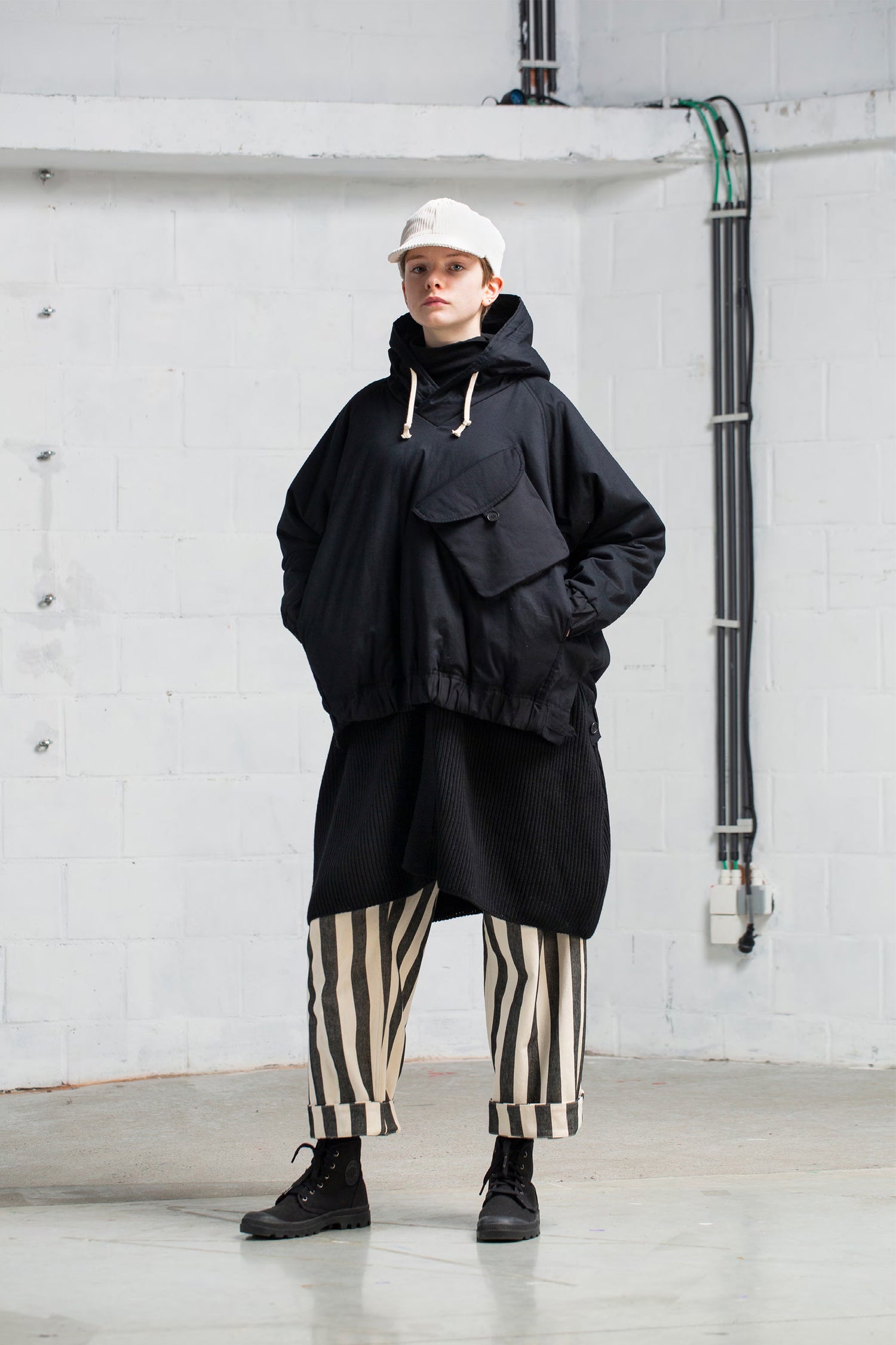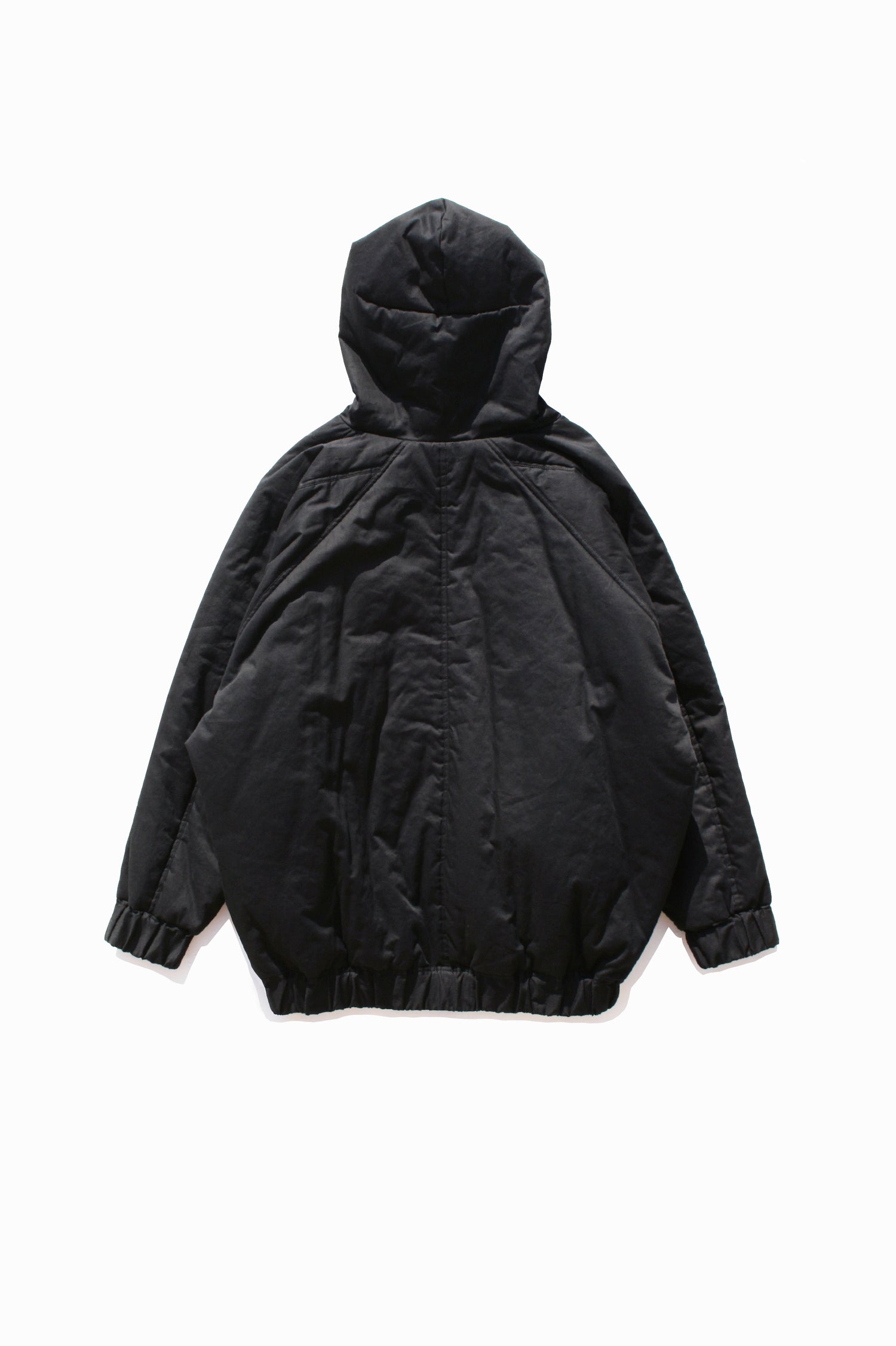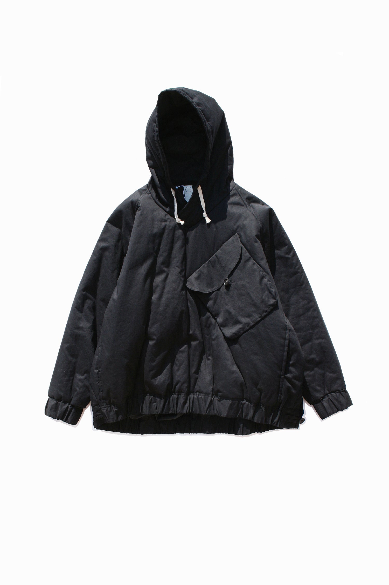 オリジナルの撥水素材ポプリン生地を使用した、軽い中綿入りのプルオーバー。防寒性や防風性を備えた秋冬のフーディジャケット。身幅やスリーブはゆったりとしたシルエットになります。左胸にフラップポケットをアシンメトリーに配置。ウエストにハンドポケットも搭載しています。裾にアジャストボタン付きのサイドスリット、フードのドローコードでボリュームやシルエットの調整も可能です。袖口・裾にゴムを施し、動きやすさを確保。