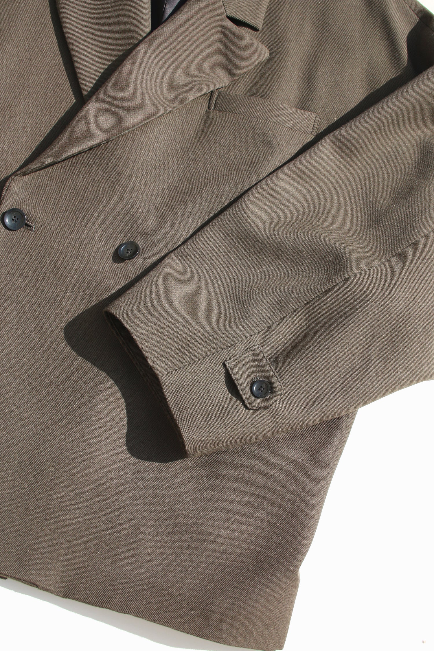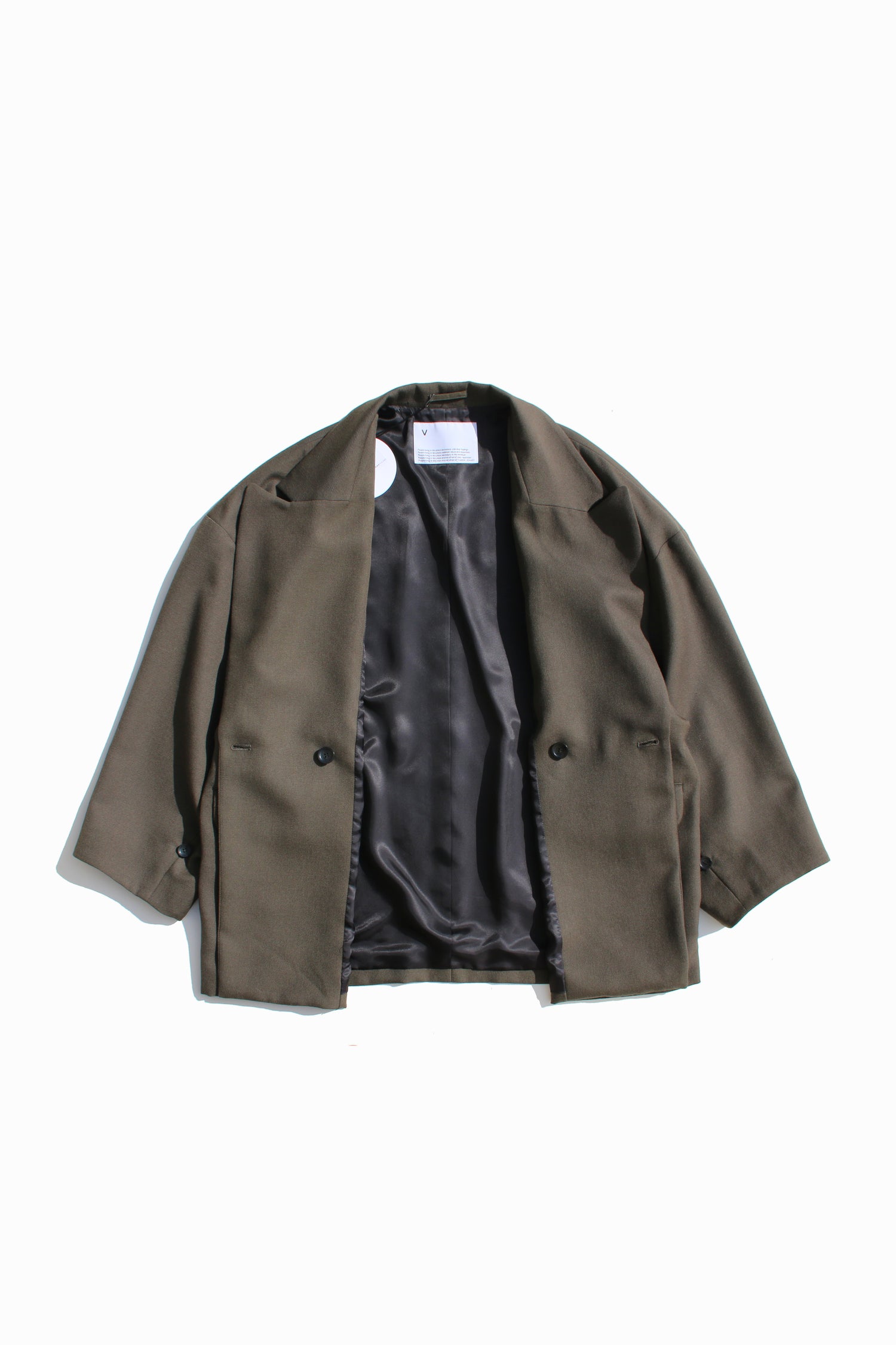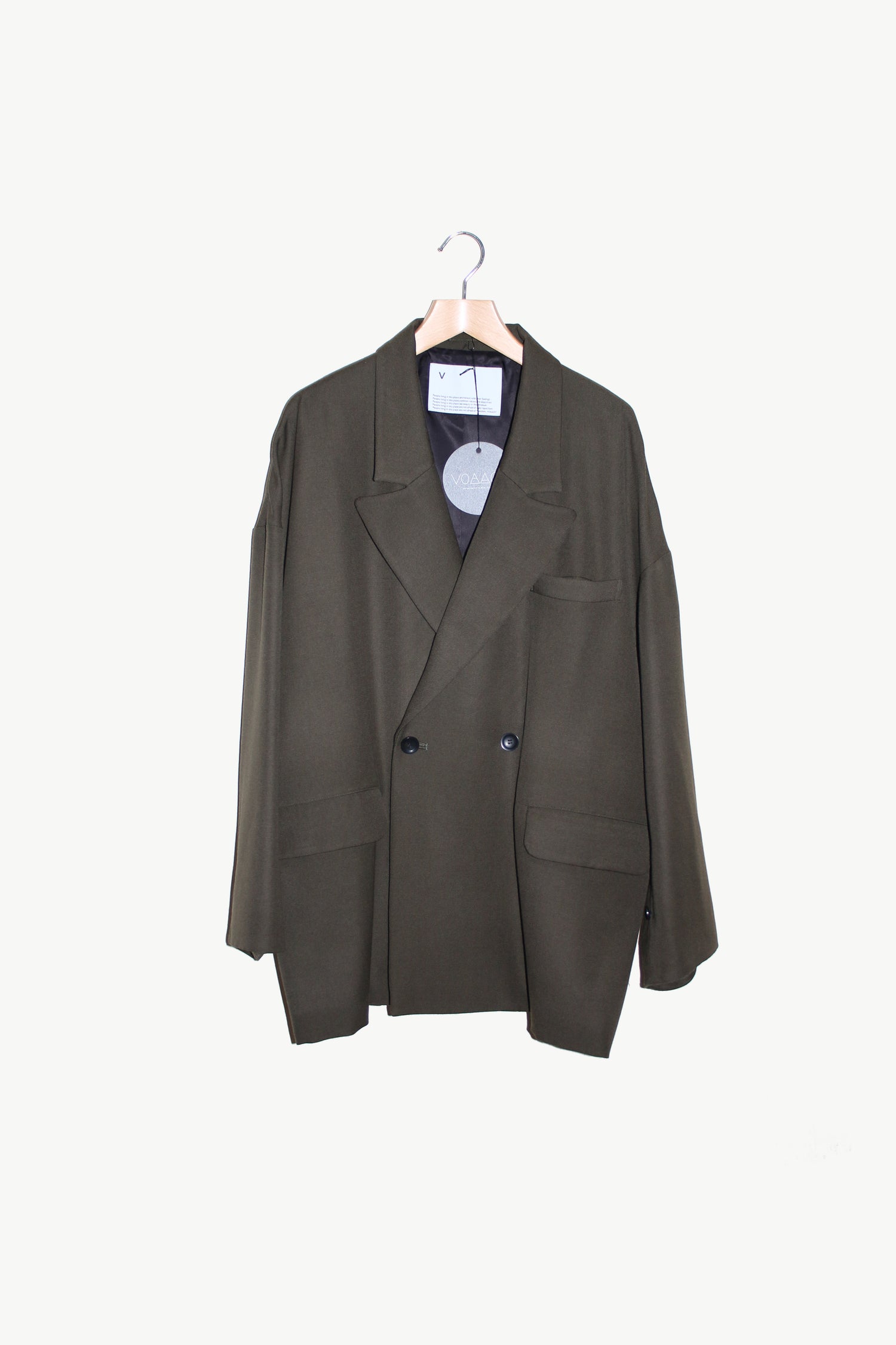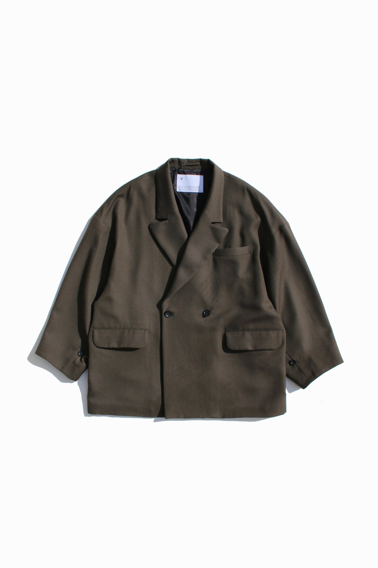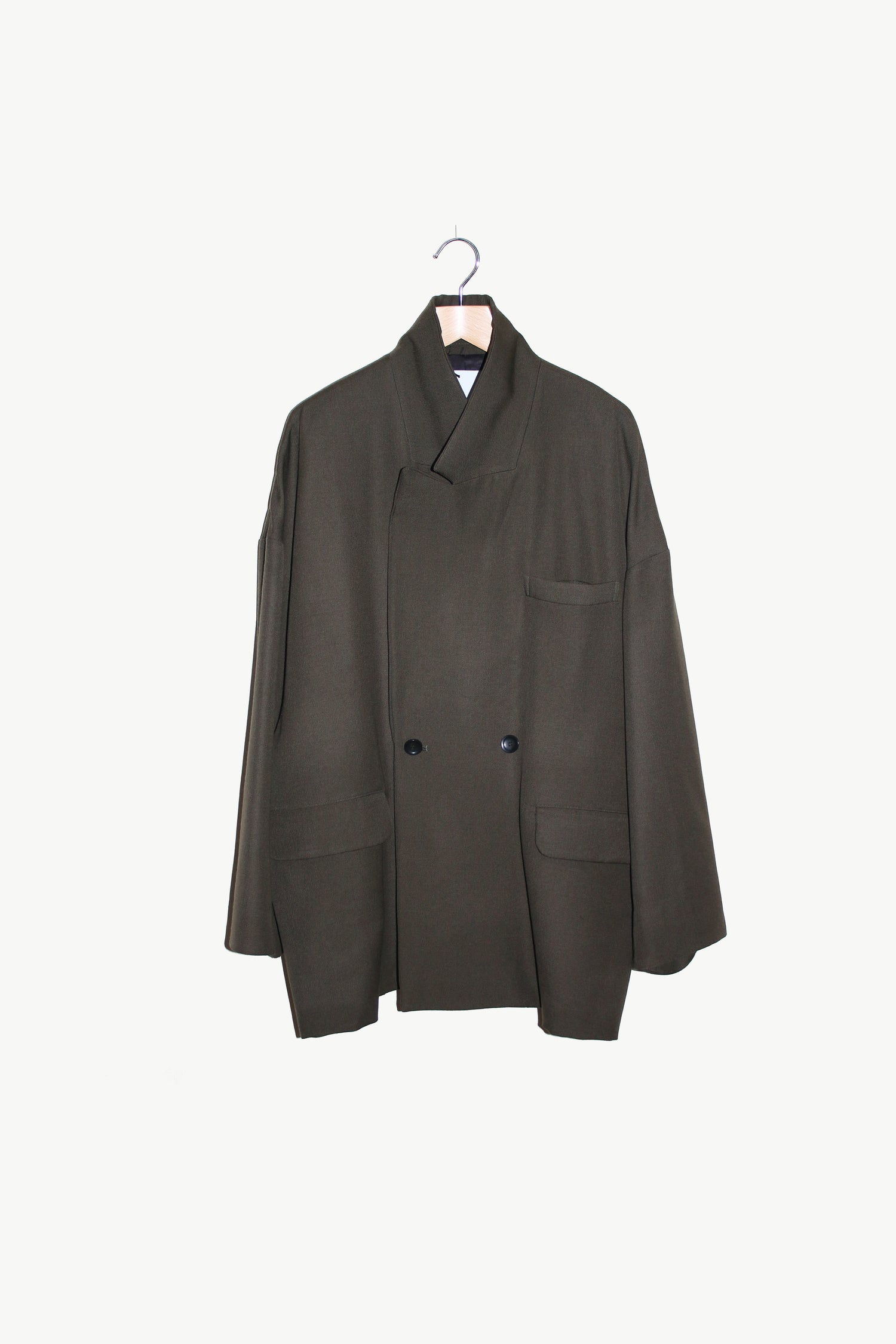 DETAILSDouble-button wider jacket crafted by prime wool from Bishu region in Aichi. Featuring: impactful olive, dropped shoulder and offbeat pockets.