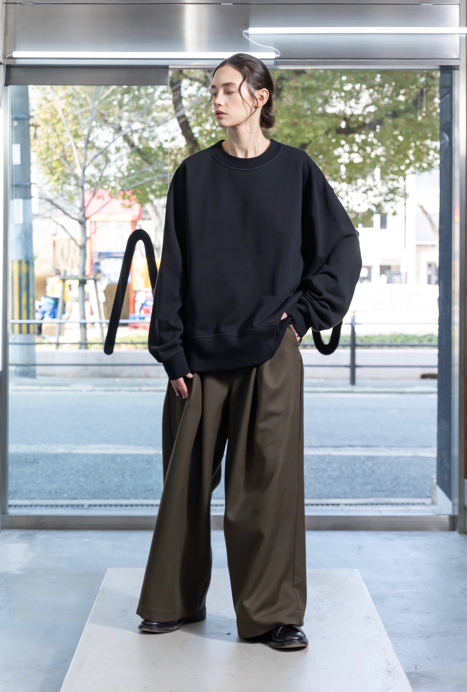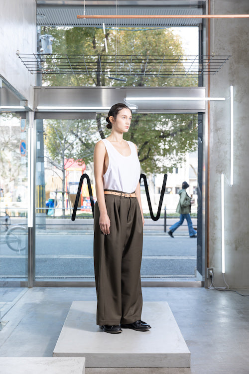 Tucked pants comes with prime wool from Bishu, Aichi. Featuring: impactful olive, clean line, loose design, an unique cinch at the back and the pockets.