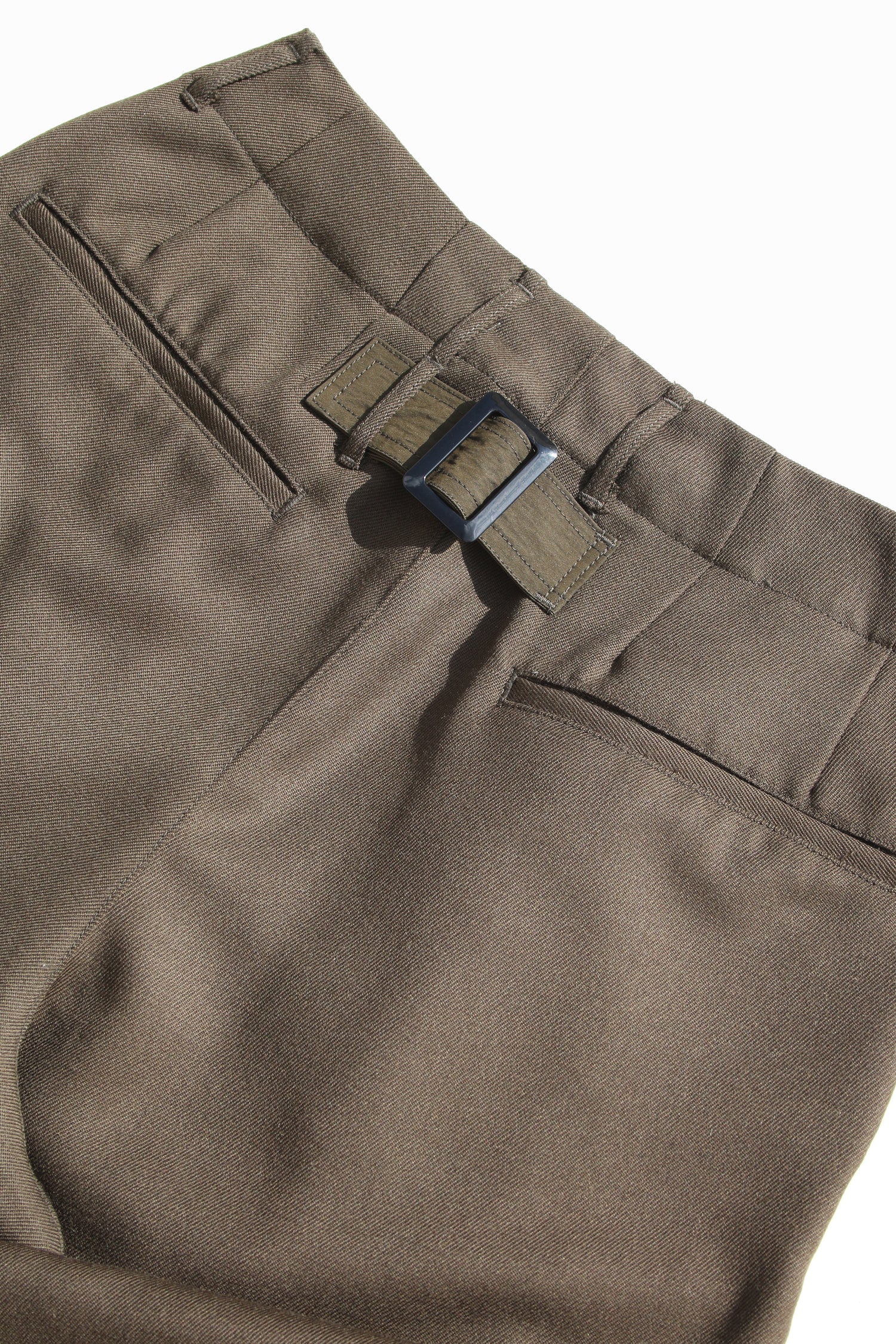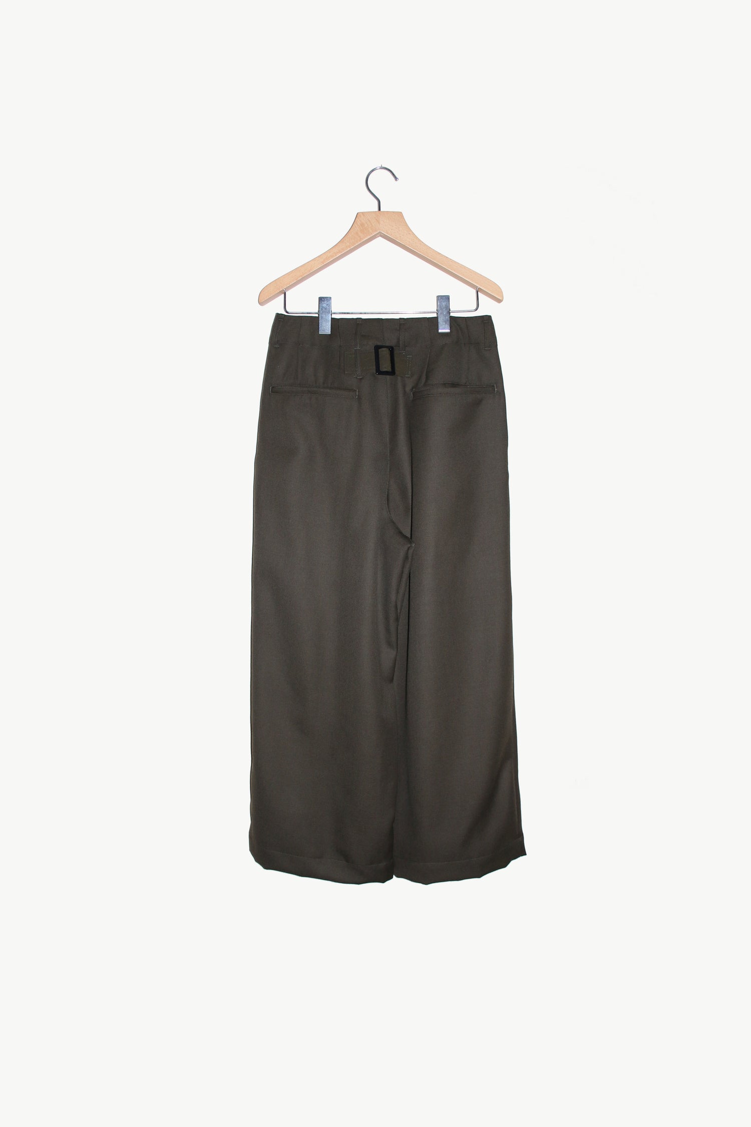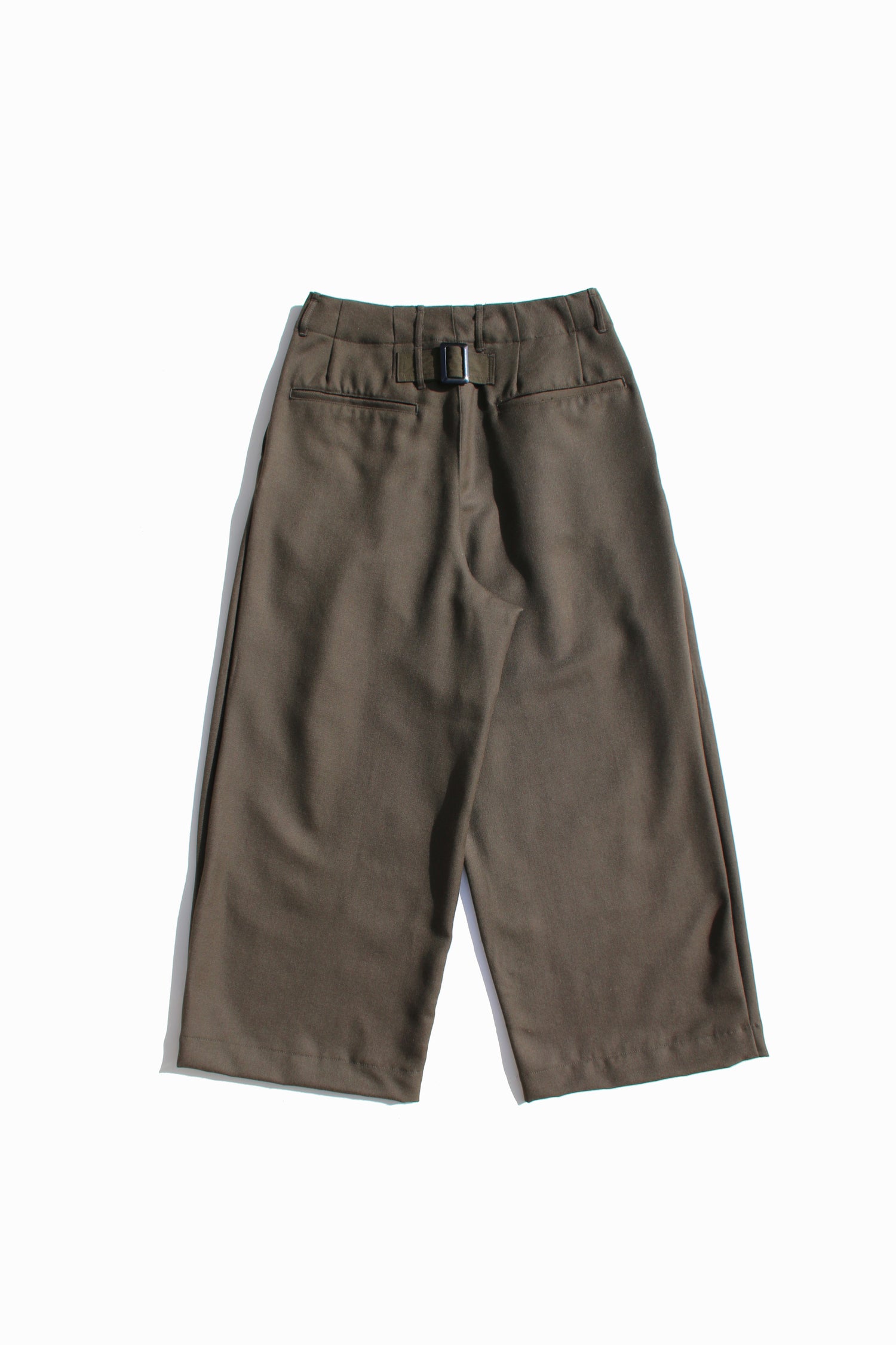 DETAILSTucked pants comes with prime wool from Bishu, Aichi. Featuring: impactful olive, clean line, loose design, an unique cinch at the back and the pockets.