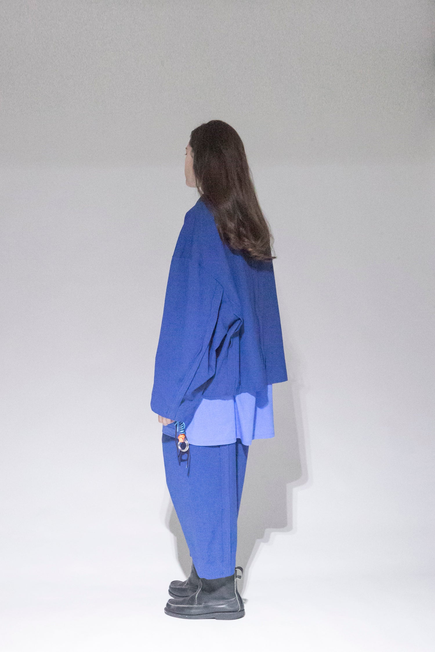 ジャケットのサイズ感やディティールをワークブルゾンに落とし込みました。中肉のポプリンにオーバーダイ後、天日干しワッシャーを加えたビンテージテイストの素材を使用したシリーズ。 VOAAOVのオリジナル素材です。カジュアルになりすぎない大胆なディテールやシルエットが特徴です。長めの袖に広い袖口で程よい抜け感を演出。程よくリラックスの4ボタン、2ポケット。同素材の5分丈パンツとのセットアップが可能です。