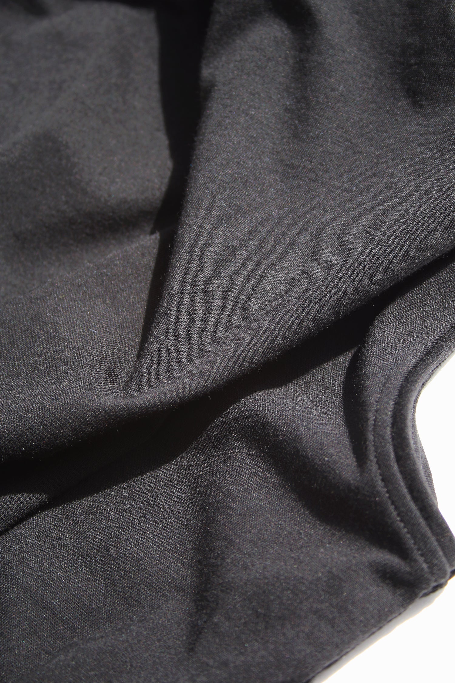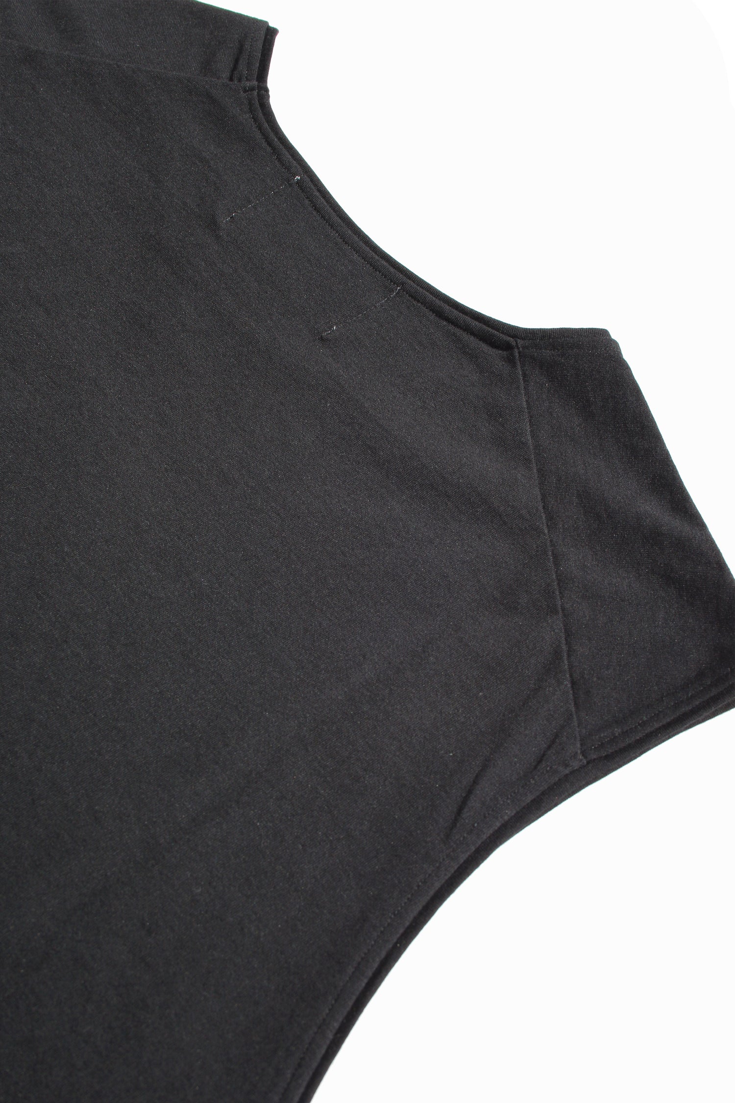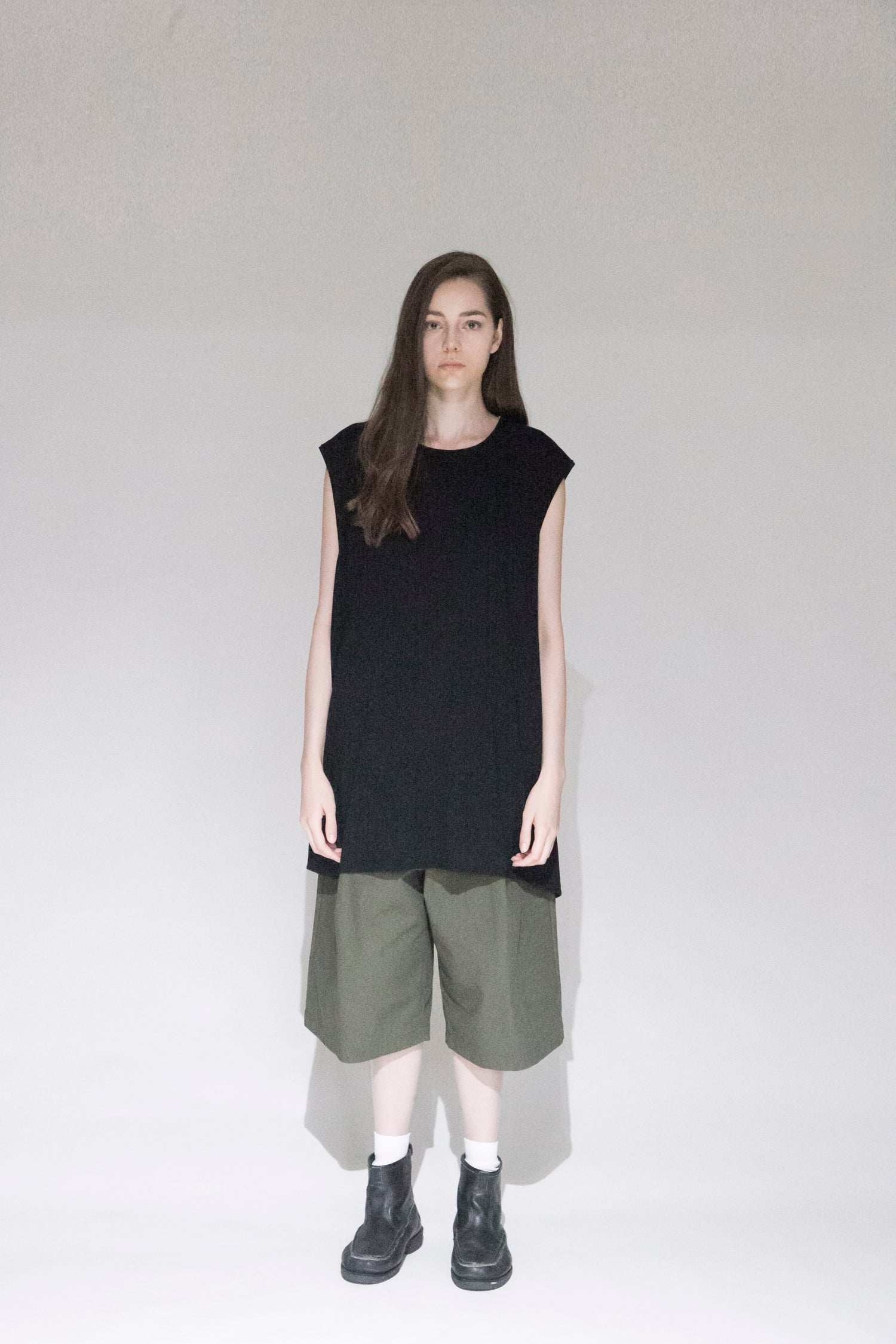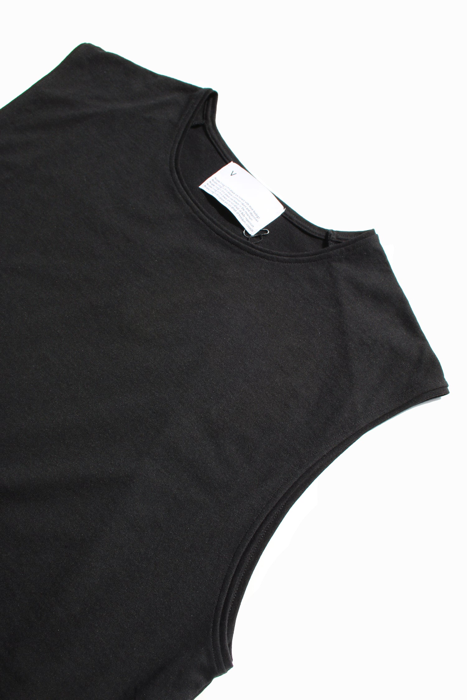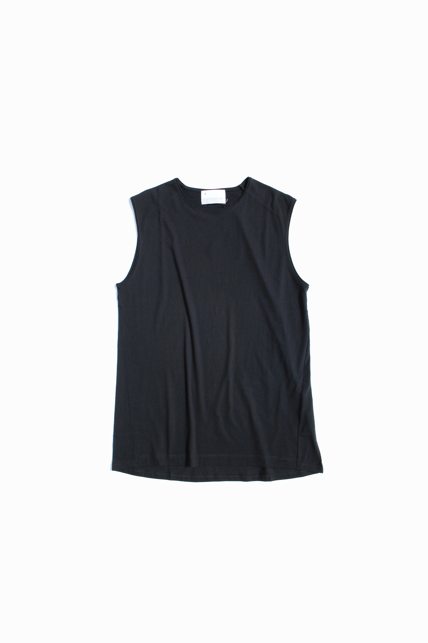 肌触りの良いテンセルモダール天竺を使用したトップス。前後裾の異仕様や、はみ出しバインダーなど、細かなディティールと モダールのドレープを生かしたサイズ感が特徴のノースリーブトップス。カラーはブラック、ブルーの2色からお選びいただけます。後ろ丈が長め。着回し力抜群な日常使いしやすい一枚です。