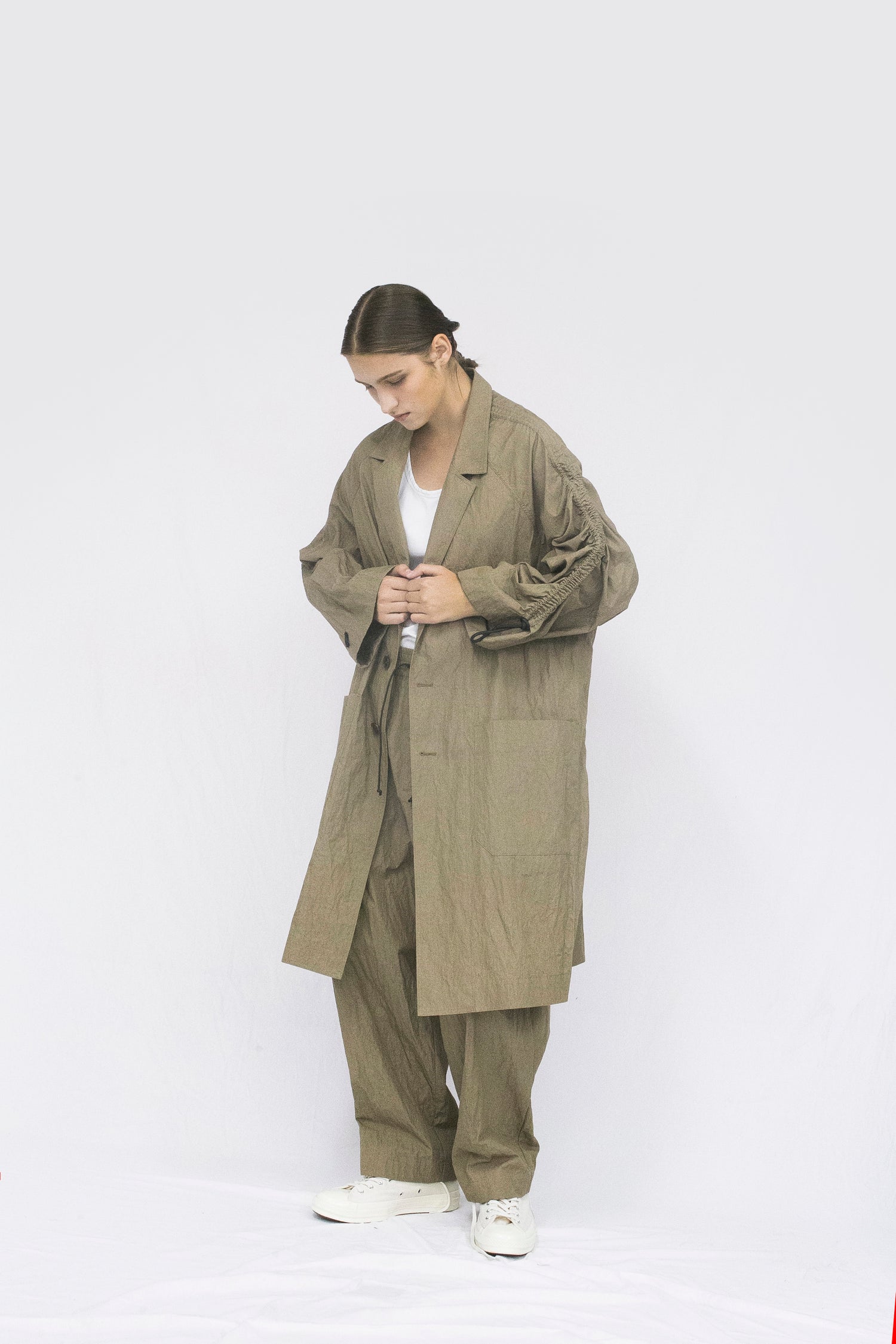 Through altering the materiality of everyday garments, VOAAOV created a soft and light coat in cotton and nylon blend which brings the right balance of density and elasticity to great effect. Two large pockets take up a new kind of space. The free stirring rope on the arms is a key component of the oversized coat philosophy: having a dialogue between possibility and pleasure.