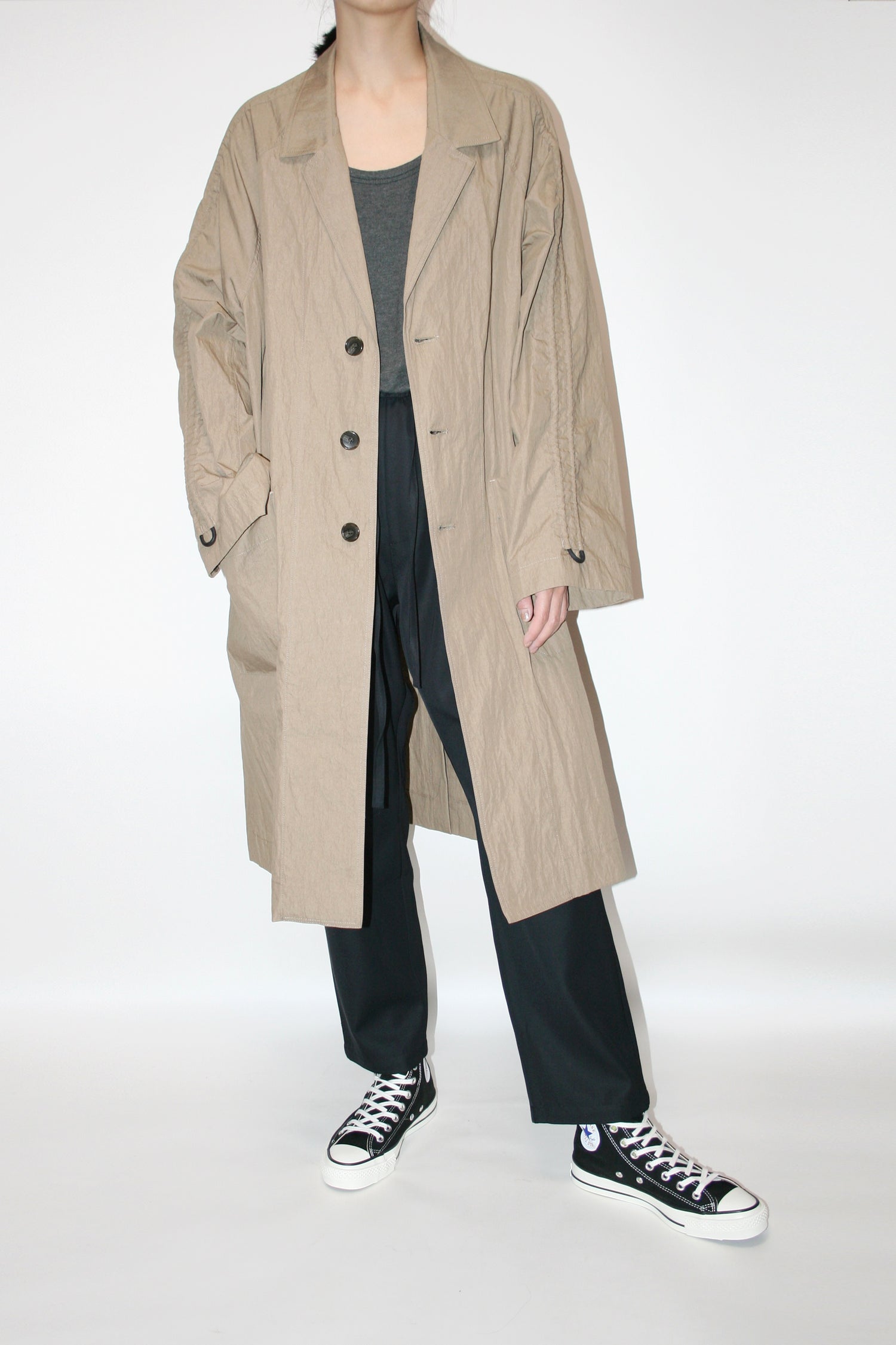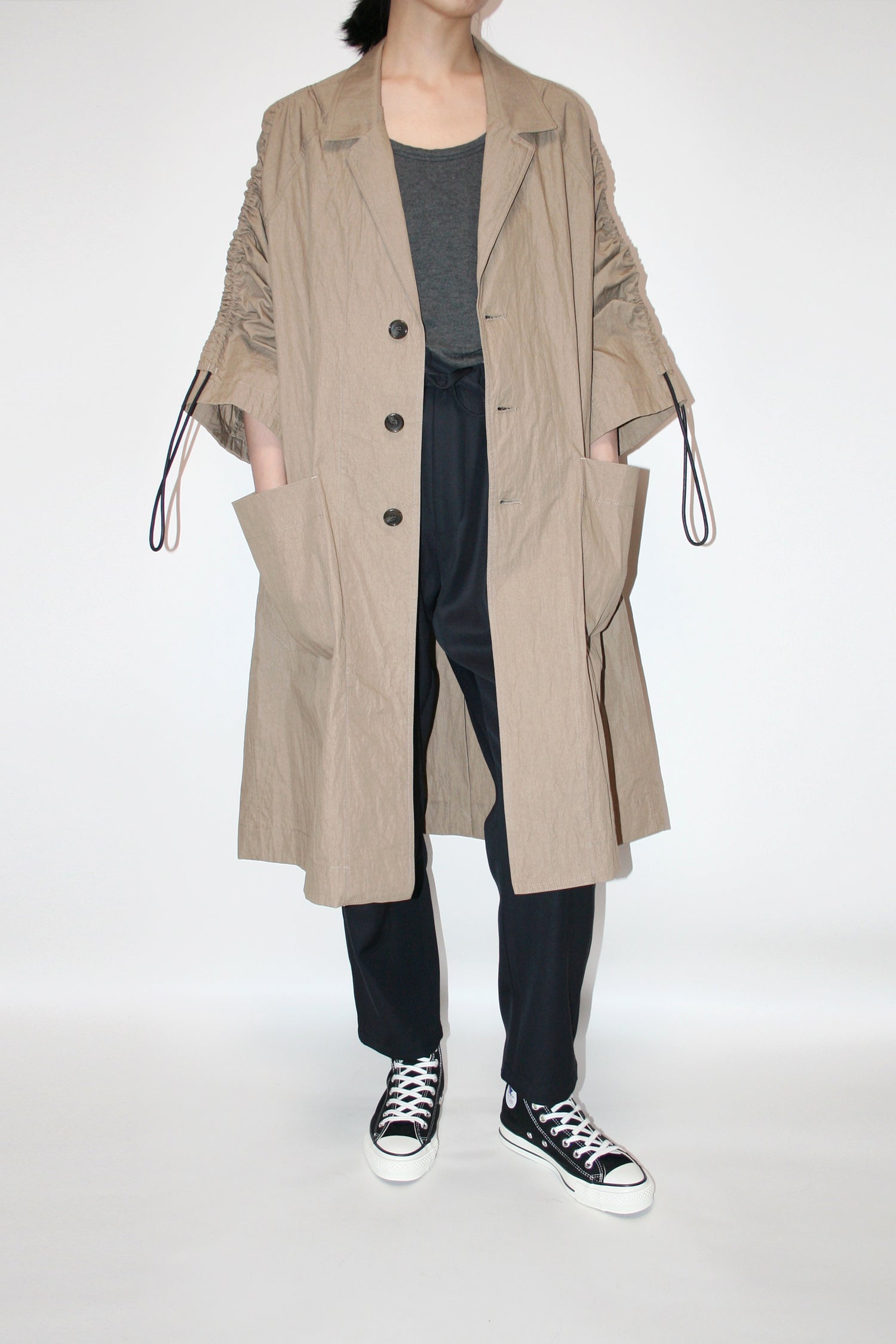 肩から袖にかけてのシャーリングテープが特徴のミドルショップコート。シャーリングテープがポイントです。袖の長さに変化をつけてアレンジできます。ヴィンテージのように使い込んだ風合いのリュードバックハーフ加工を施し、ムラ染めのような風合いと、ナイロン混紡で、適度なハリ感と強度が特徴の素材です。通年着られそうな軽めの素材感。1枚着ただけでオシャレに見えて、これからの時期に大活躍間違いなしです。