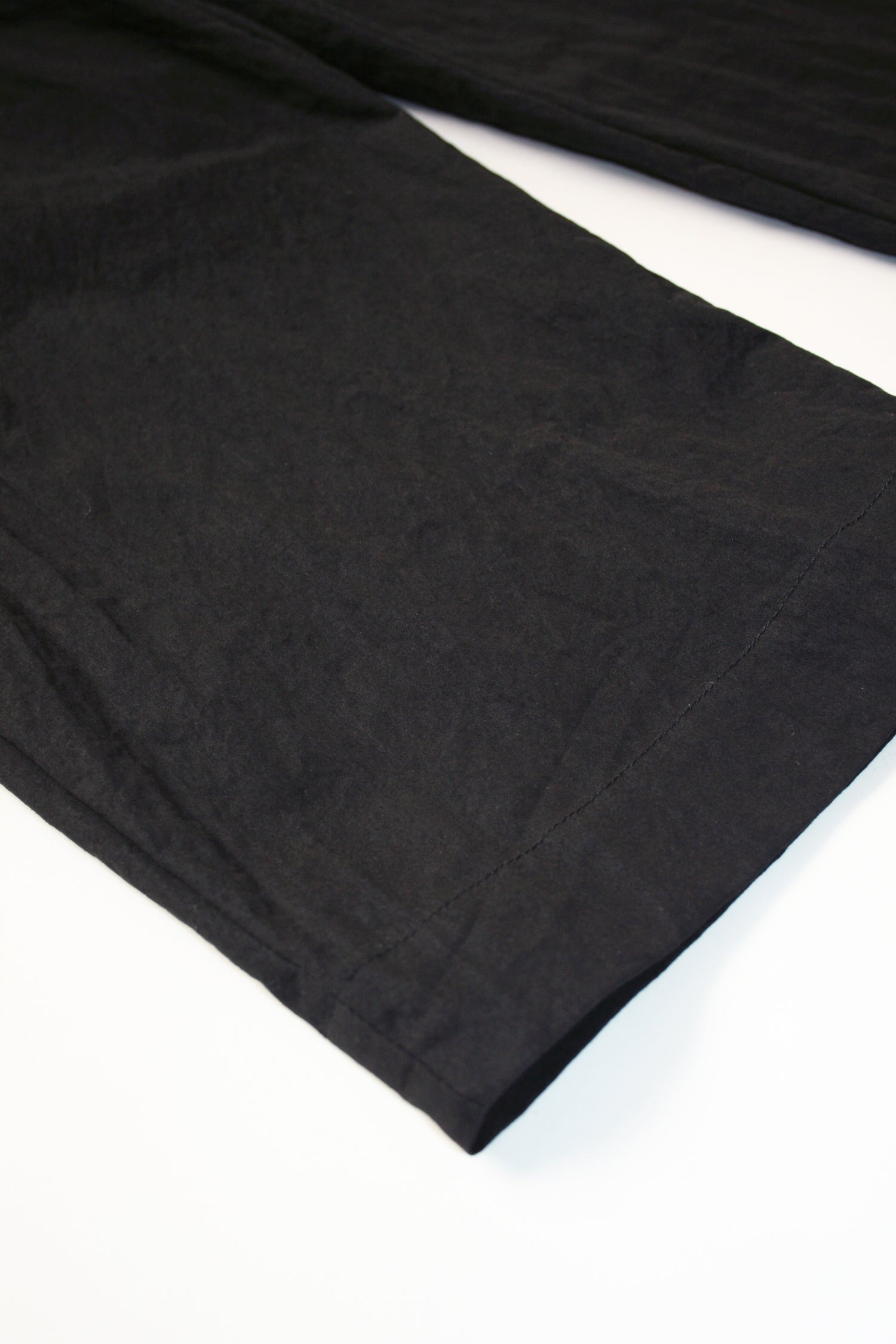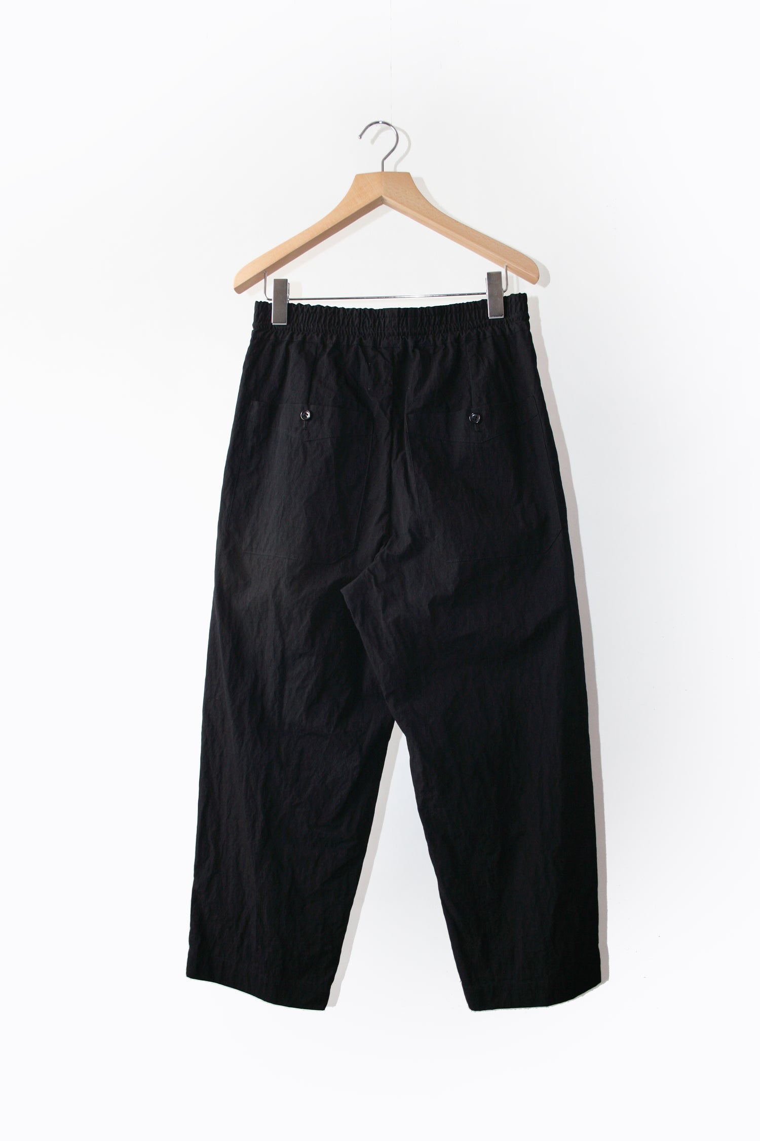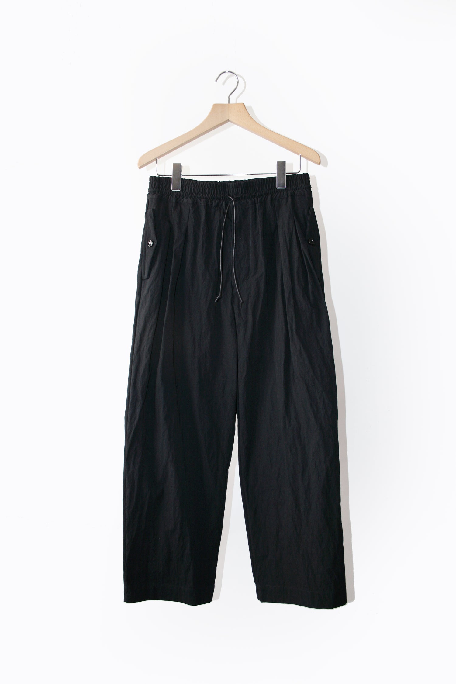 Through altering the materiality of everyday garments, VOAAOV crafted this wide uniform pants in cotton and nylon blend together which brings the right balance of density and elasticity to great effect. Also featured are the relaxed legs silhouette in the sense of ‘lighter and durable’, two slanted pockets in the front and two patch pockets at the back, and a rubber band waist with a drawcord. This unisex tapered pants therefore filled a need in someone’s lives.
