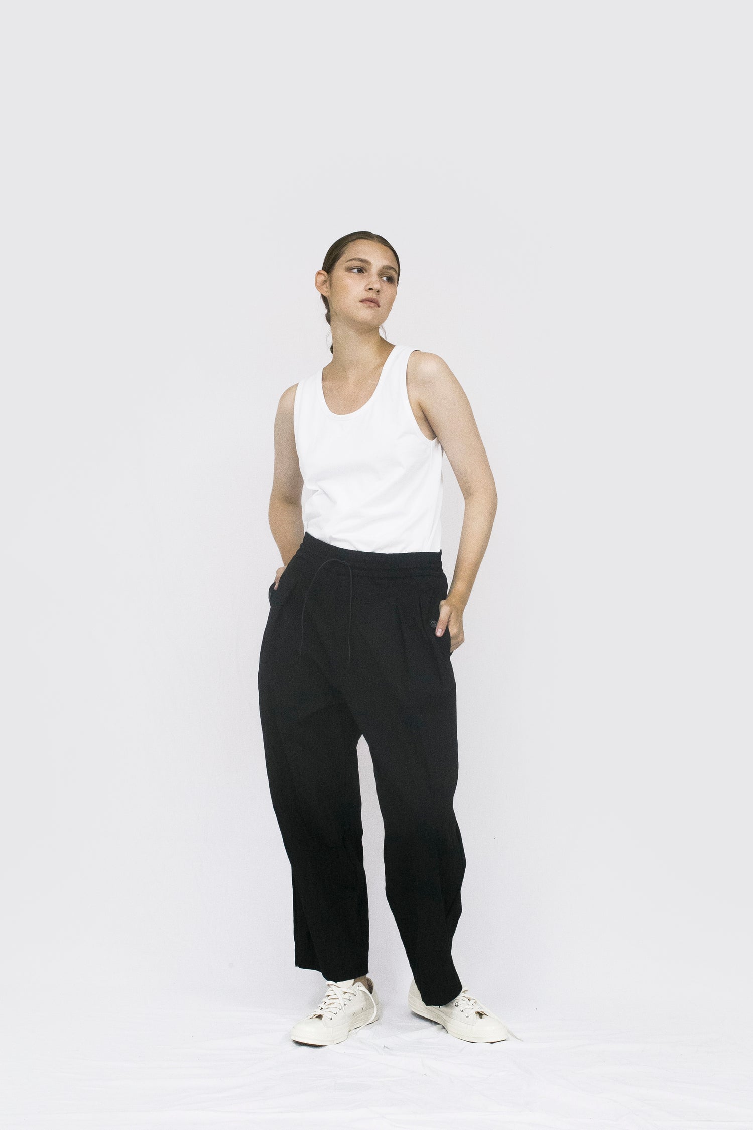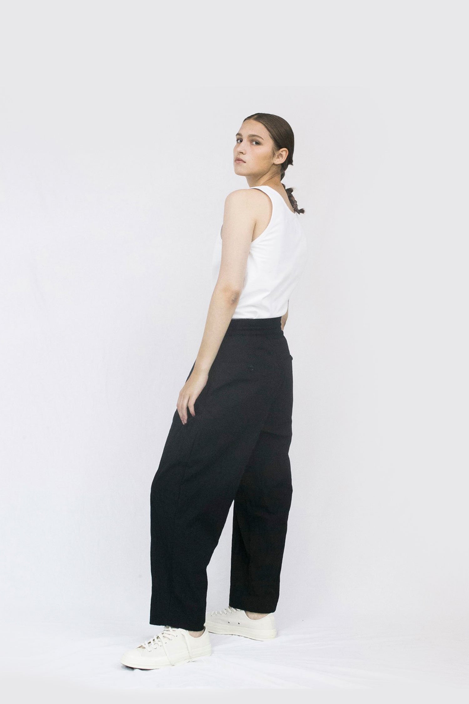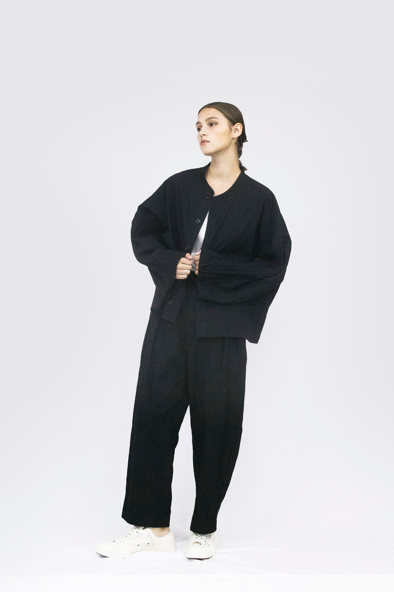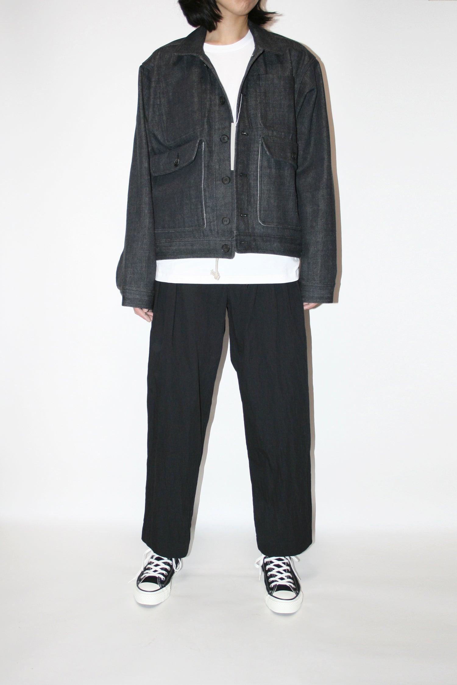 Through altering the materiality of everyday garments, VOAAOV crafted this wide uniform pants in cotton and nylon blend together which brings the right balance of density and elasticity to great effect. Also featured are the relaxed legs silhouette in the sense of ‘lighter and durable’, two slanted pockets in the front and two patch pockets at the back, and a rubber band waist with a drawcord. This unisex tapered pants therefore filled a need in someone’s lives.