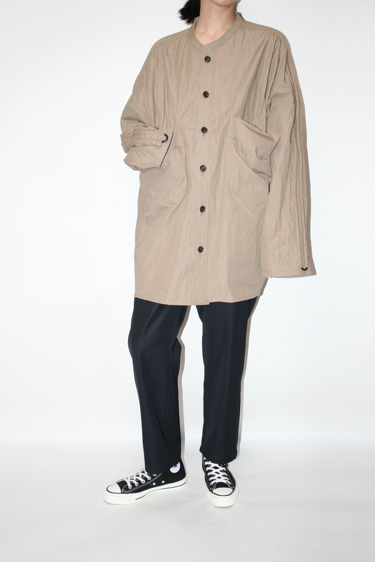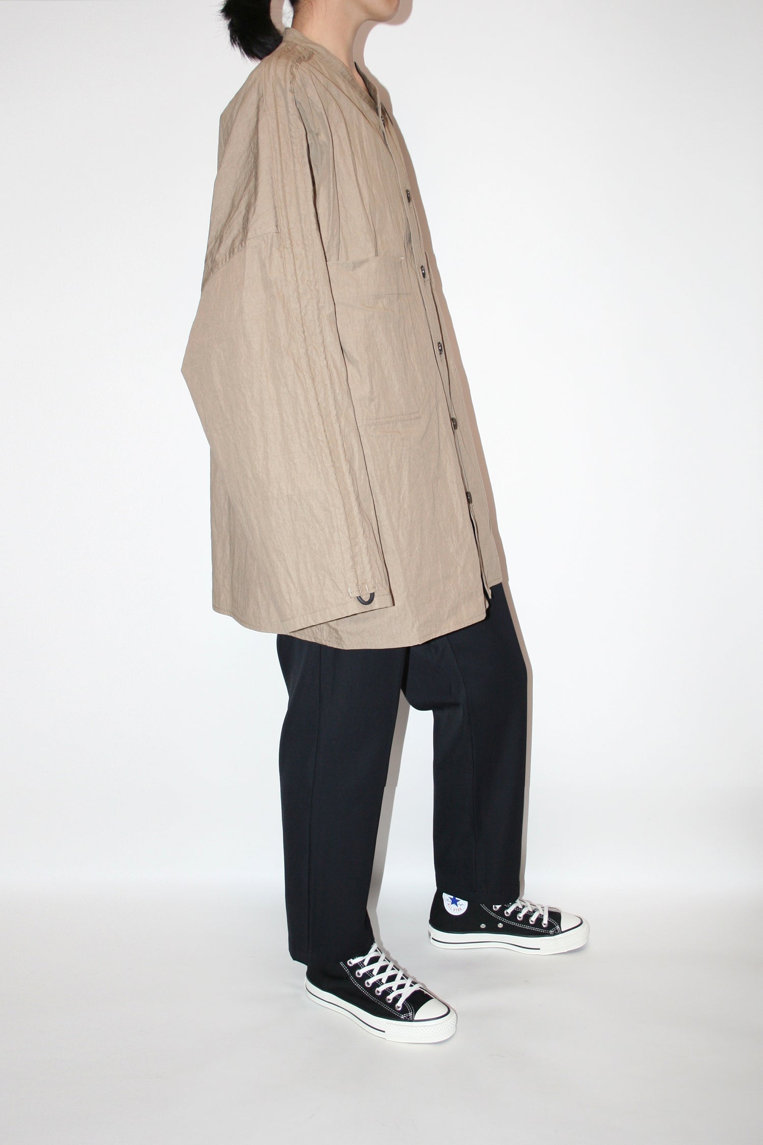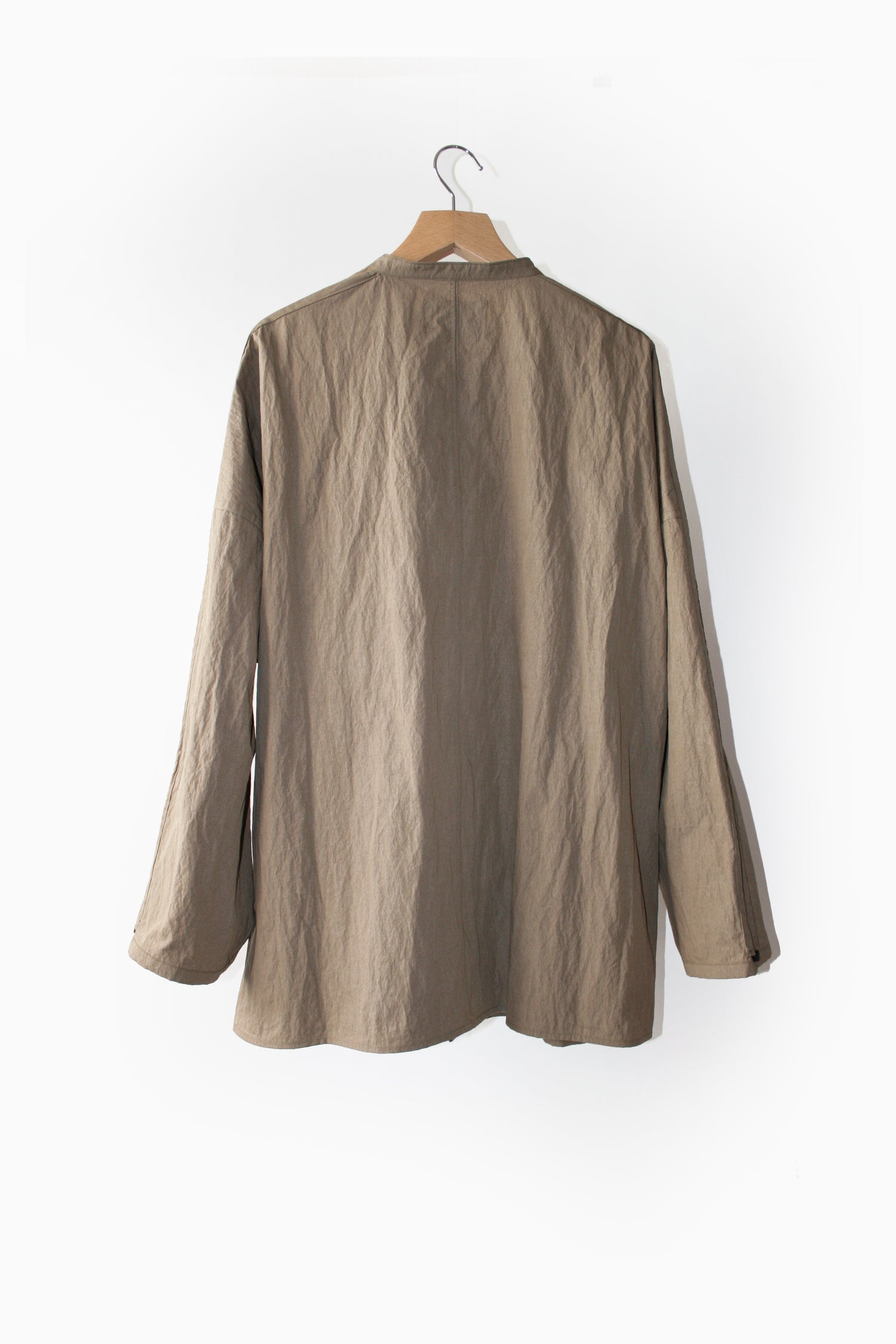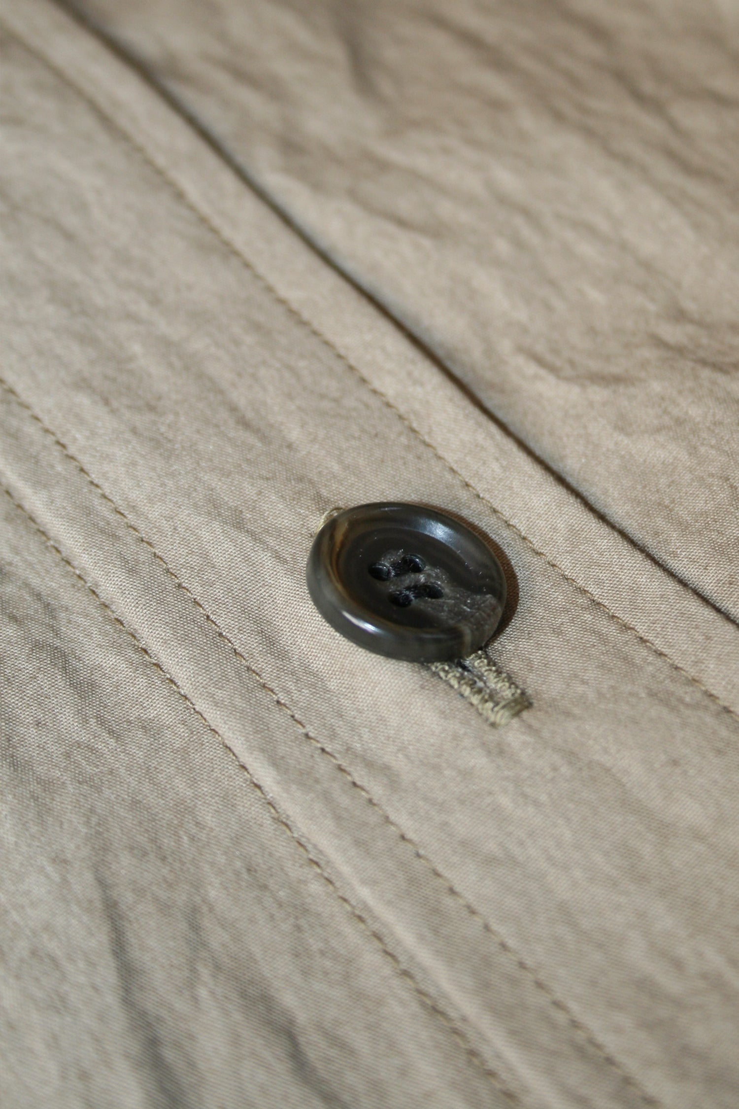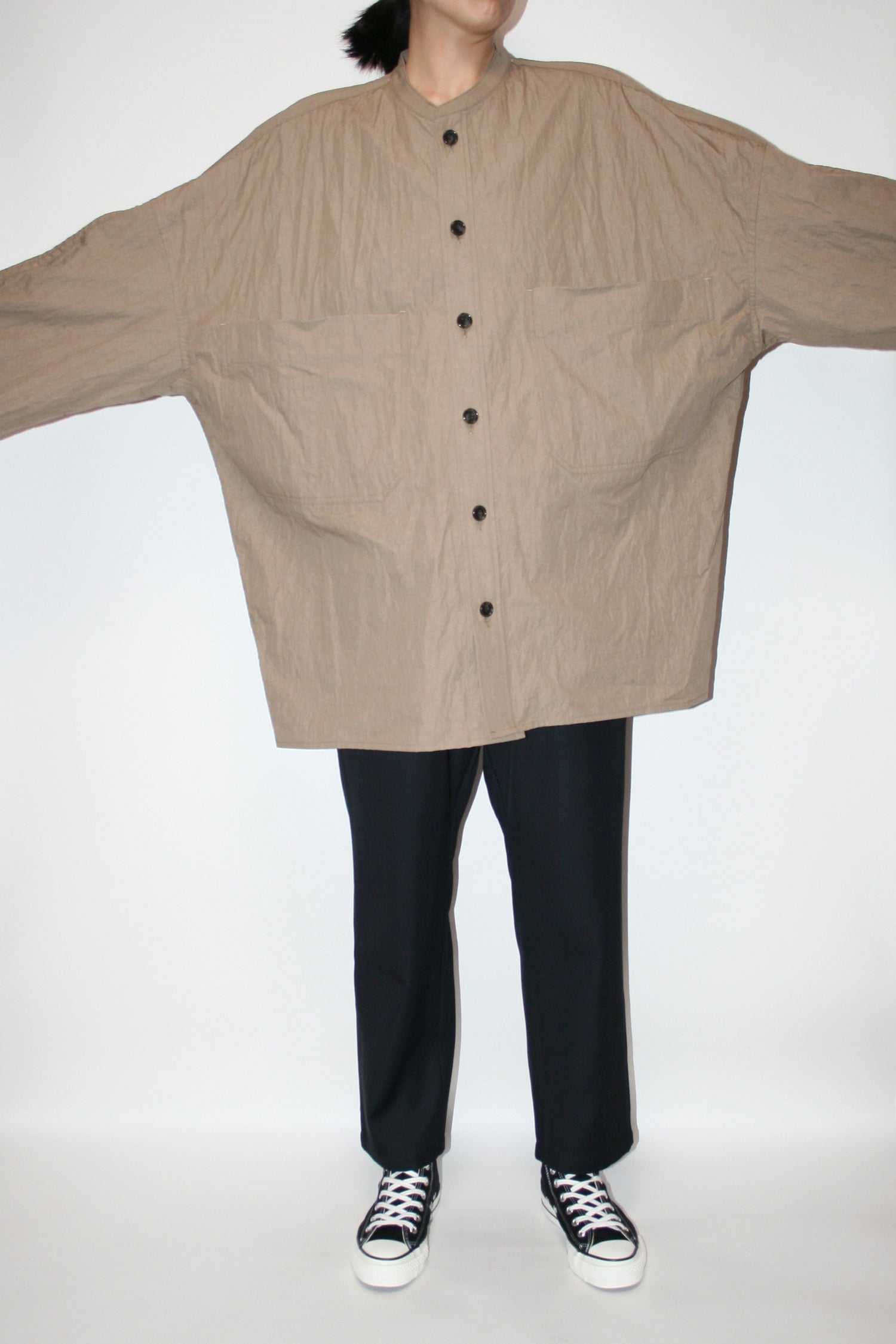 肩から袖にかけてのシャーリングテープが特徴のスタンドカラーシャツ。シャーリングテープがポイントです。袖の長さに変化をつけてアレンジできます。薄手のブルゾン感覚で羽織りとしても。ヴィンテージのように使い込んだ風合いのリュードバックハーフ加工を施し、ムラ染めのような風合いと、ナイロン混紡で、適度なハリ感と強度が特徴の素材です。春夏の一枚着として他と差を出していただけるアイテムです。