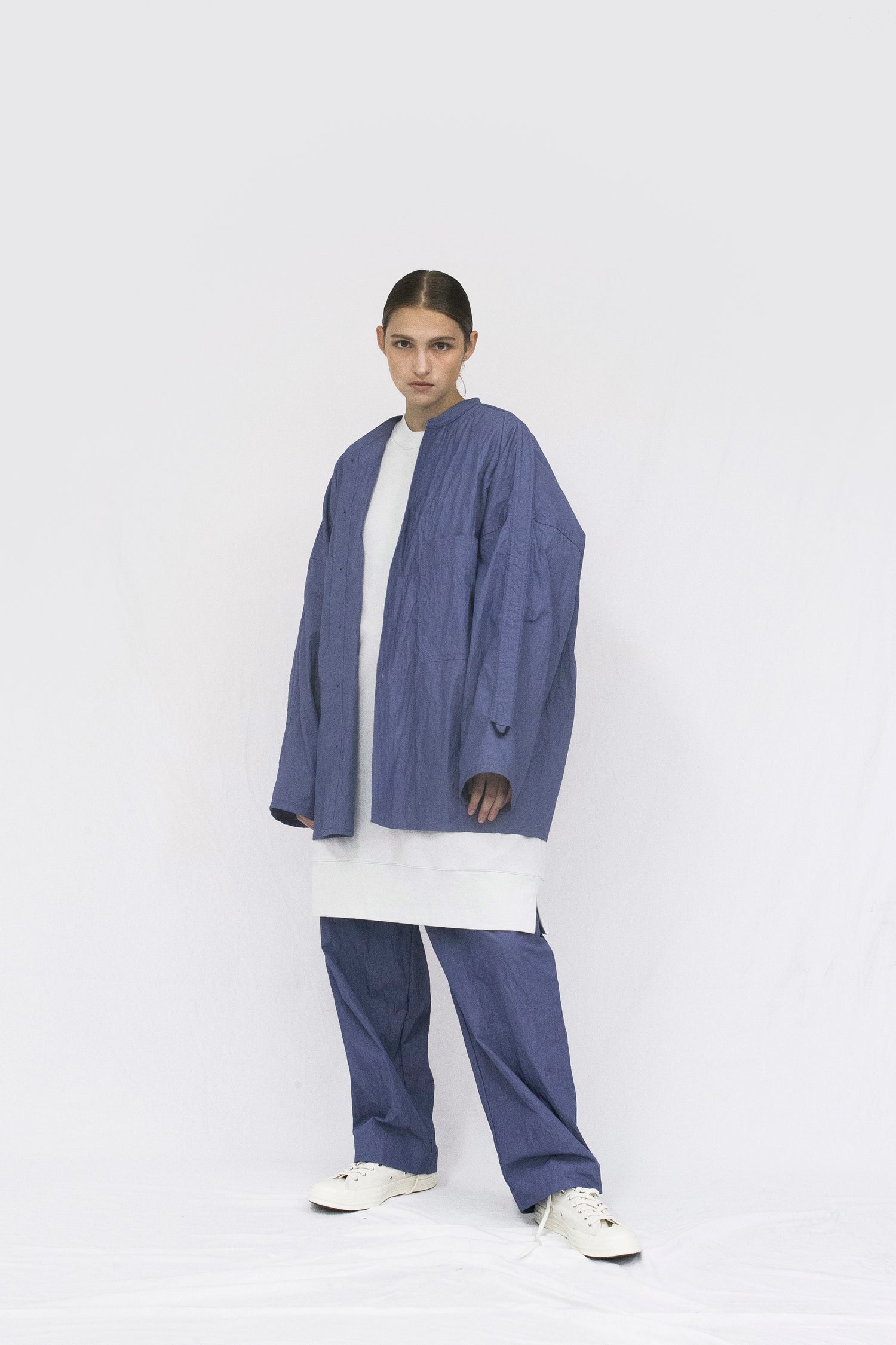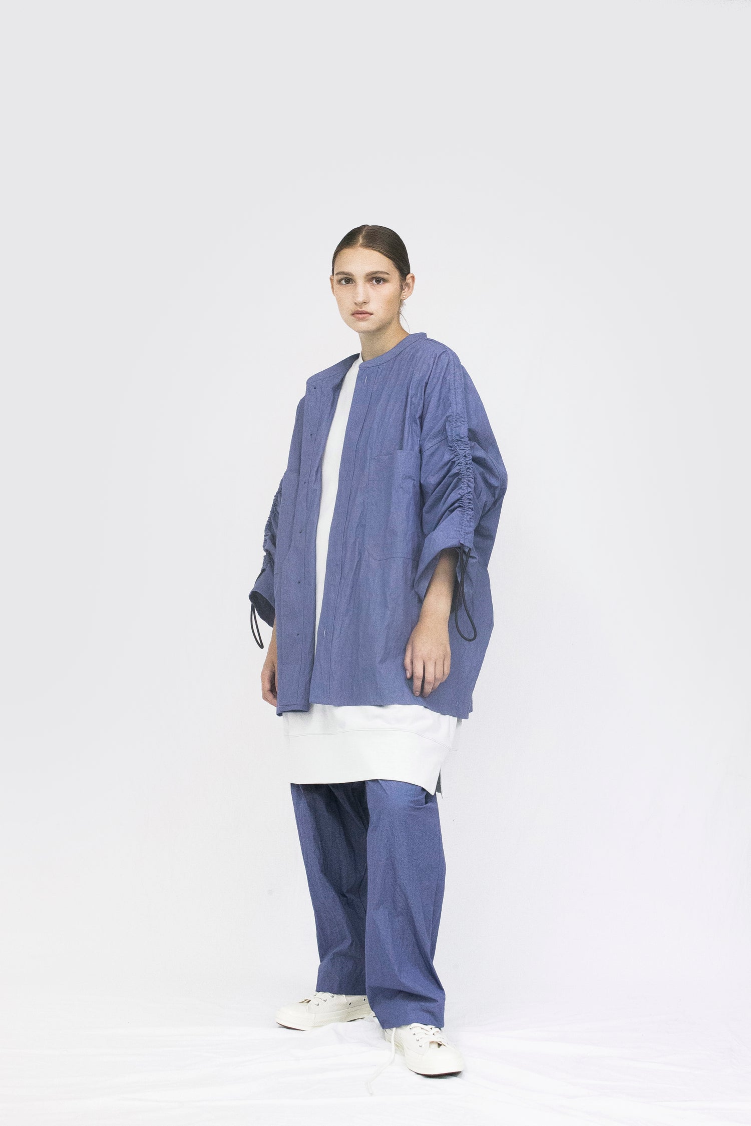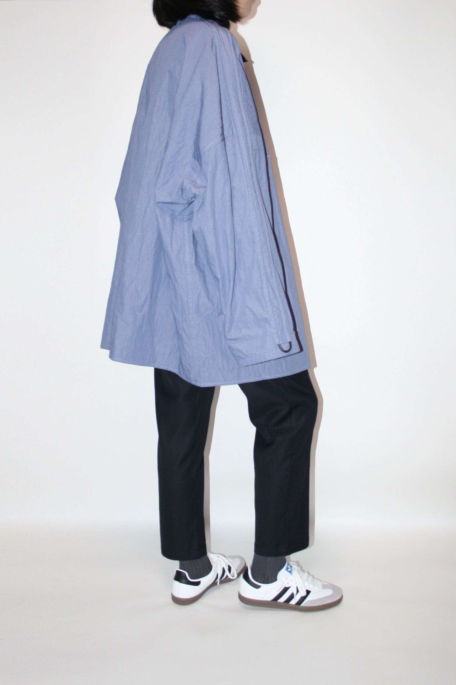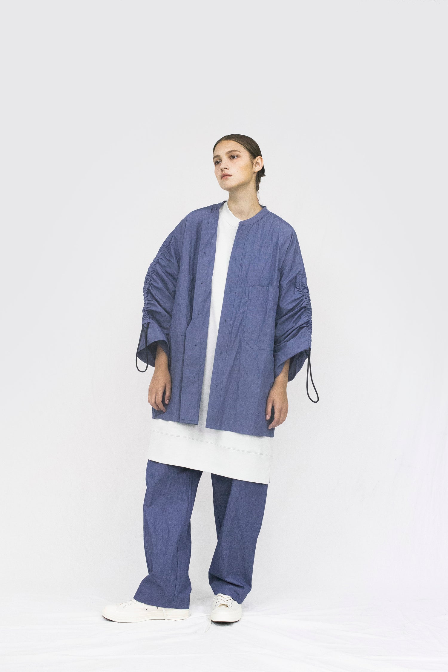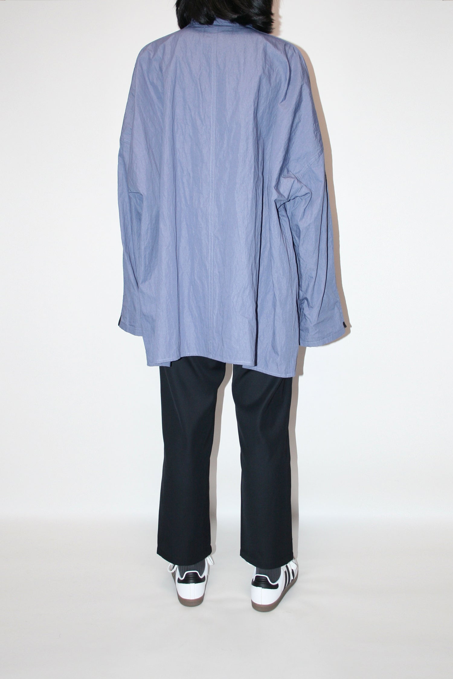 Through altering the materiality of everyday garments, VOAAOV crafted this wide jacket shirt in cotton and nylon blend which brings the right balance of density and elasticity to great effect. Two large pockets take up a new kind of space. The free stirring rope on the arms is a key component of the open collar shirt philosophy: having a dialogue between possibility and pleasure.