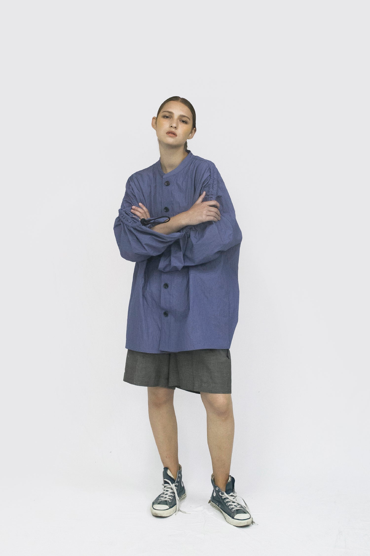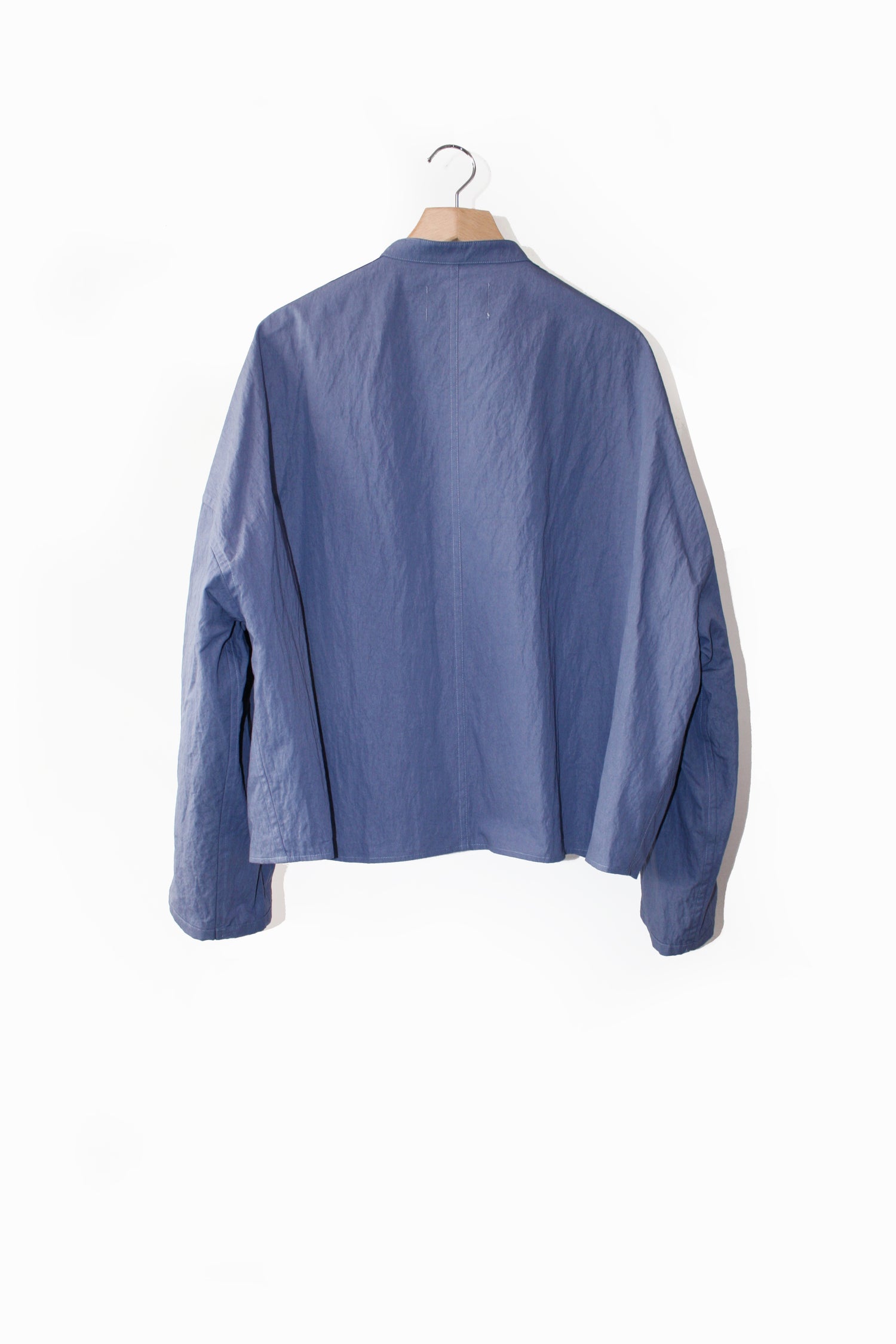 肩から袖にかけてのシャーリングテープが特徴のスタンドカラーシャツ。シャーリングテープがポイントです。袖の長さに変化をつけてアレンジできます。薄手のブルゾン感覚で羽織りとしても。ヴィンテージのように使い込んだ風合いのリュードバックハーフ加工を施し、ムラ染めのような風合いと、ナイロン混紡で、適度なハリ感と強度が特徴の素材です。春夏の一枚着として他と差を出していただけるアイテムです。パープルはVOAAOVのオリジナルカラー。