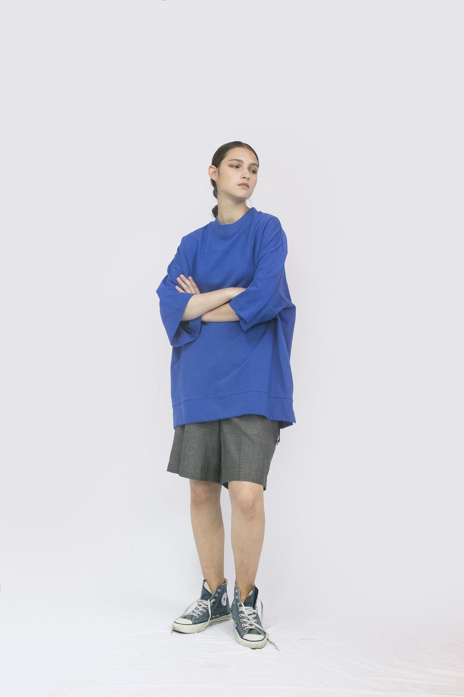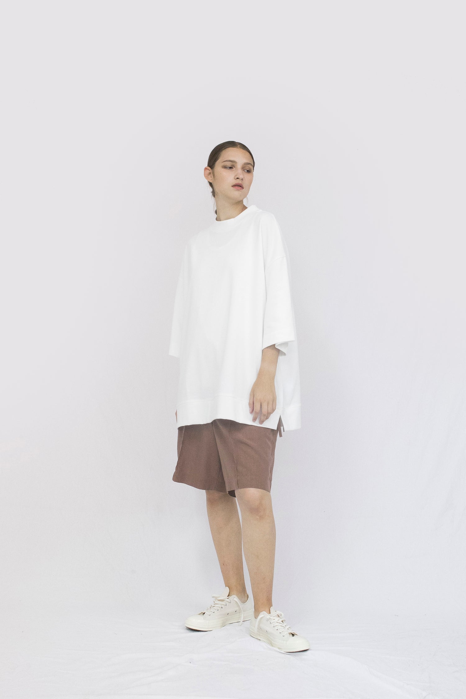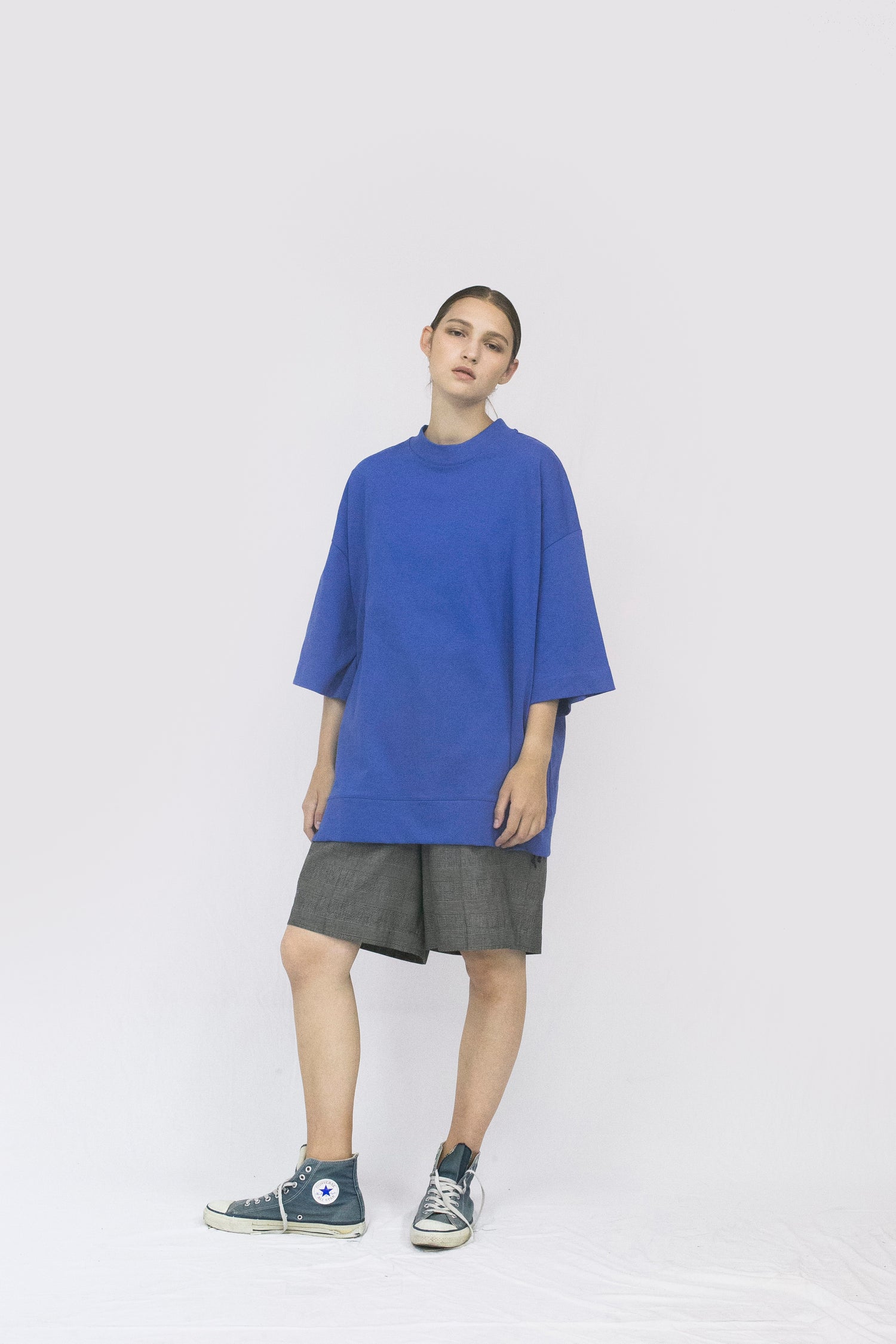 The classic big t-shirt, represented in soft beige, observant white and shy blue, redefines the oversized shape in a narrative perspective. The construction of light cotton, with a good balance of water absorption, elasticity, anti-pilling and washing durability, becomes expedient to any gender, body or performativity.