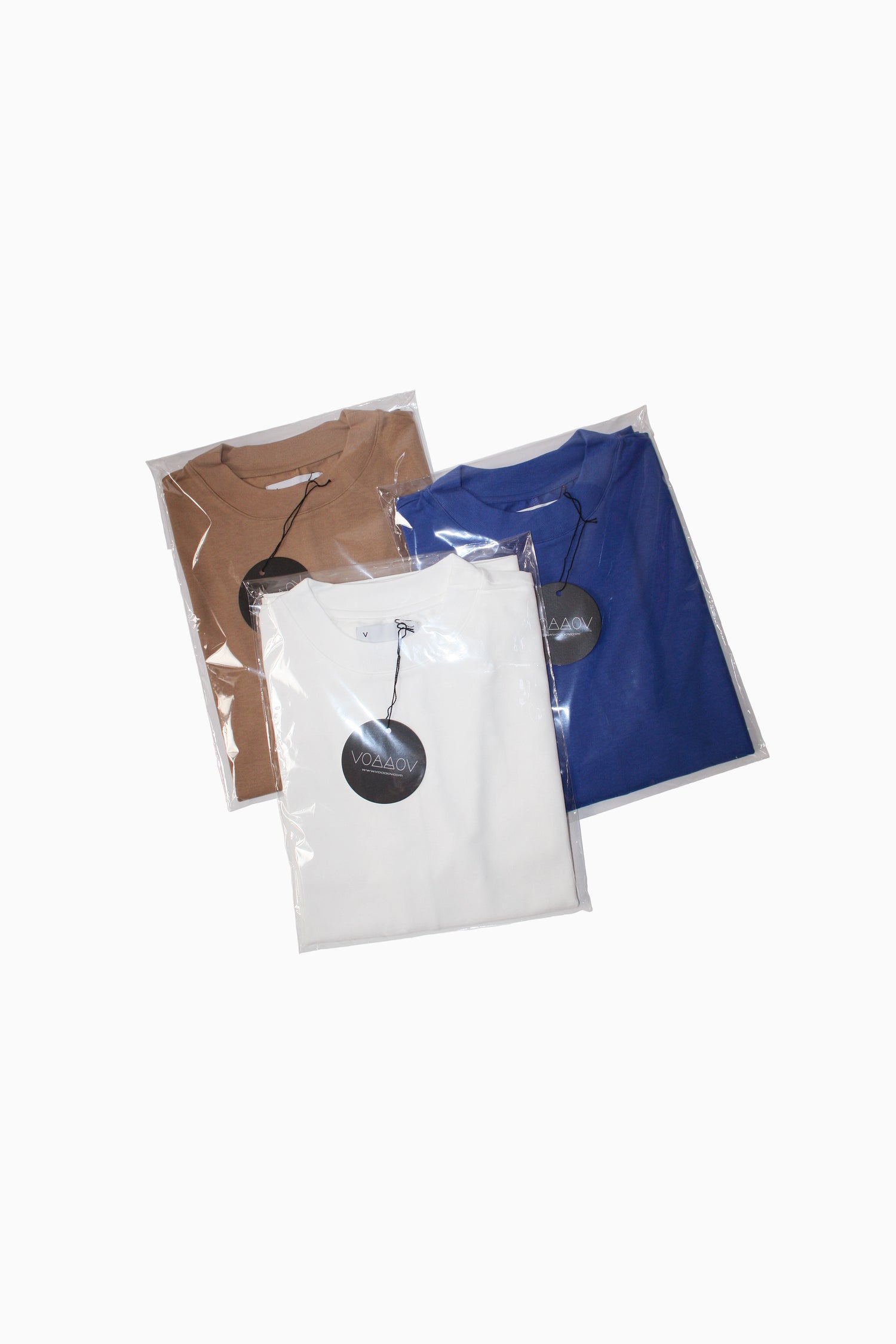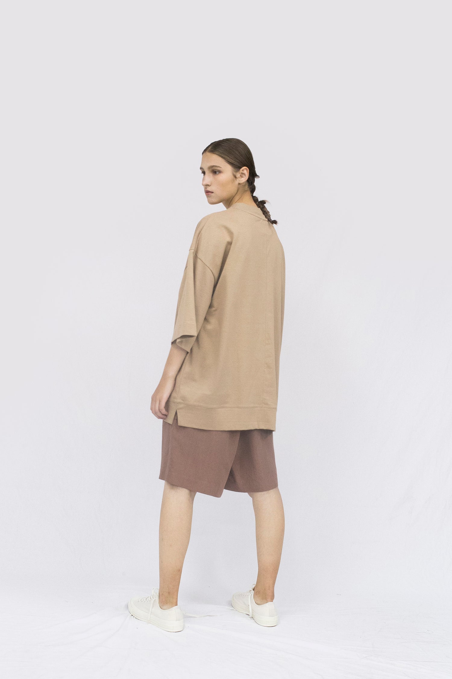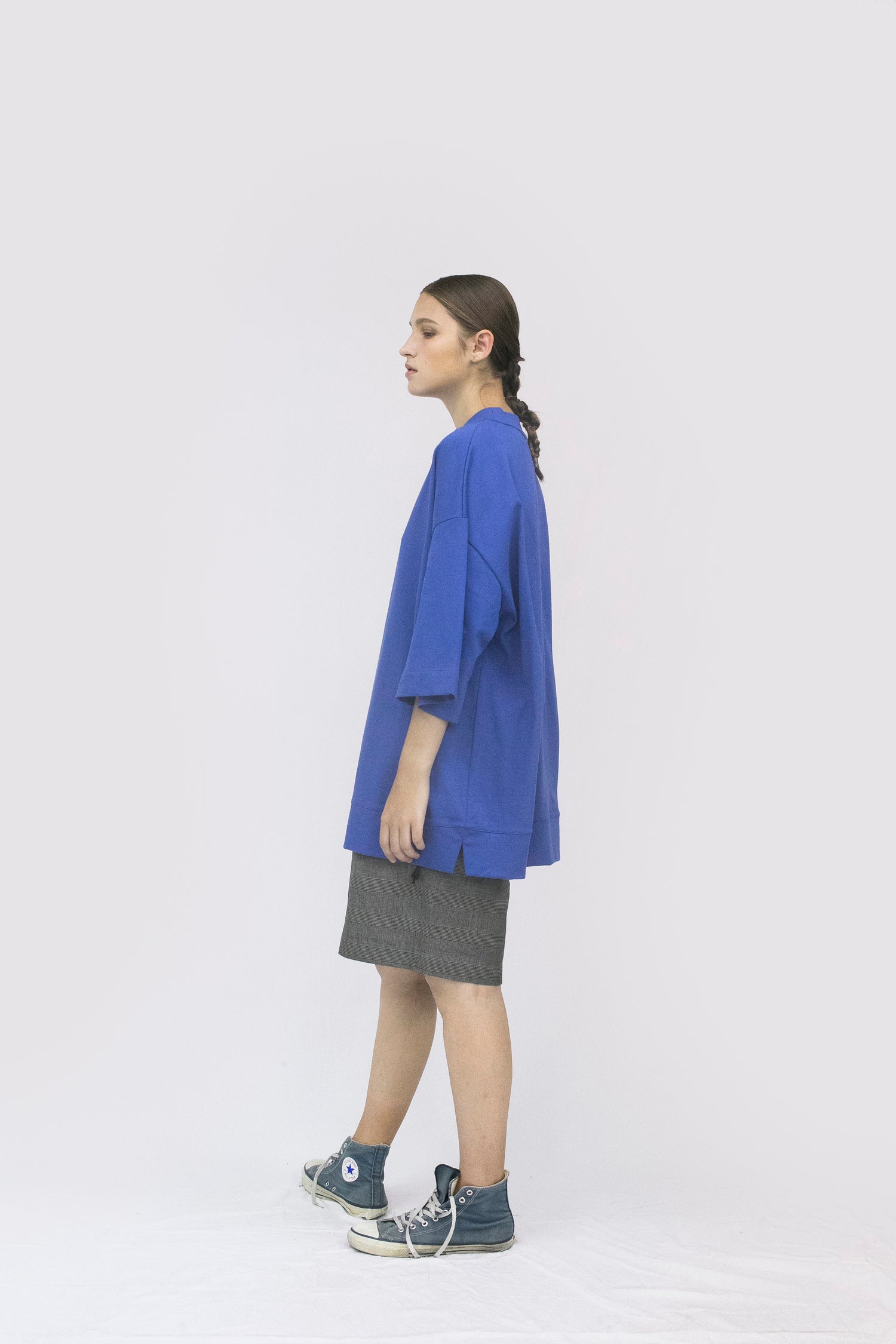 The classic big t-shirt, represented in soft beige, observant white and shy blue, redefines the oversized shape in a narrative perspective. The construction of light cotton, with a good balance of water absorption, elasticity, anti-pilling and washing durability, becomes expedient to any gender, body or performativity.