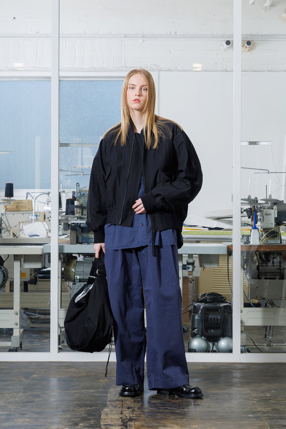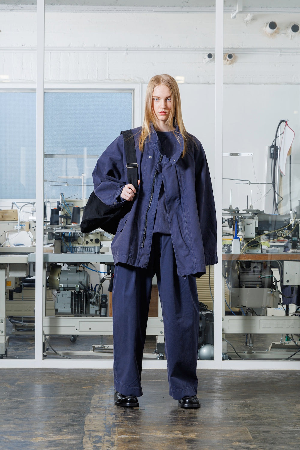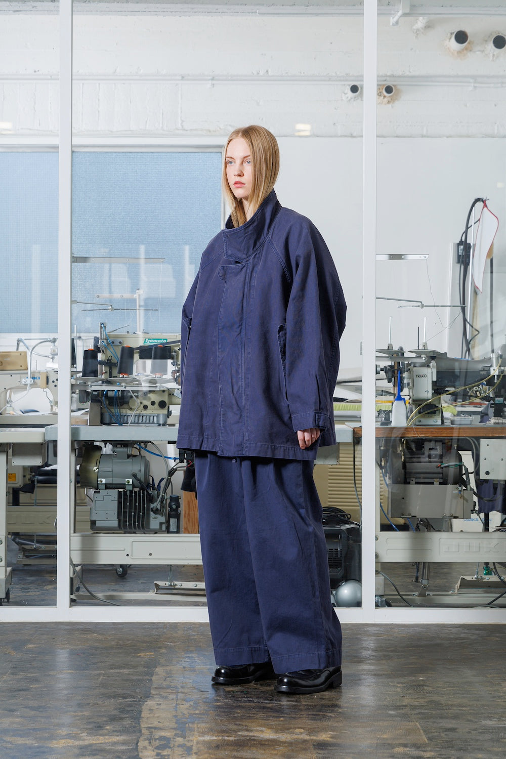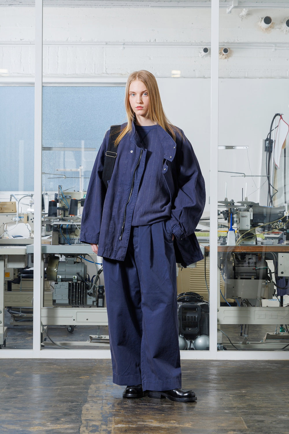 VOAAOV’s two tucks pants made from a twill of density and woven tight. Softness earned when washing’s done. The back, elastic, stretched and wide. Pockets here, both back and side. A piece for all, both rough and kind.