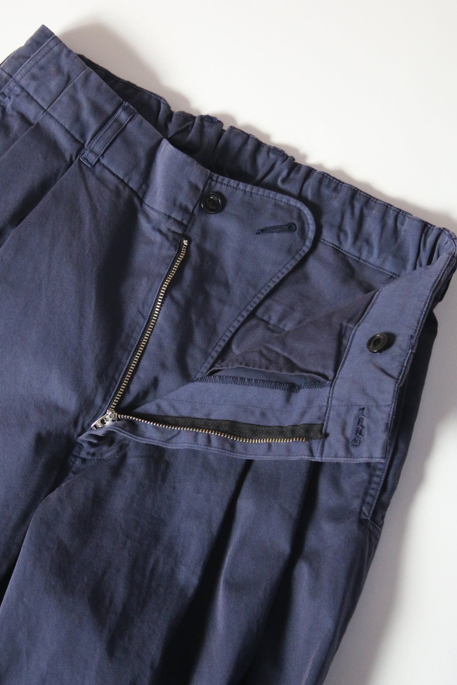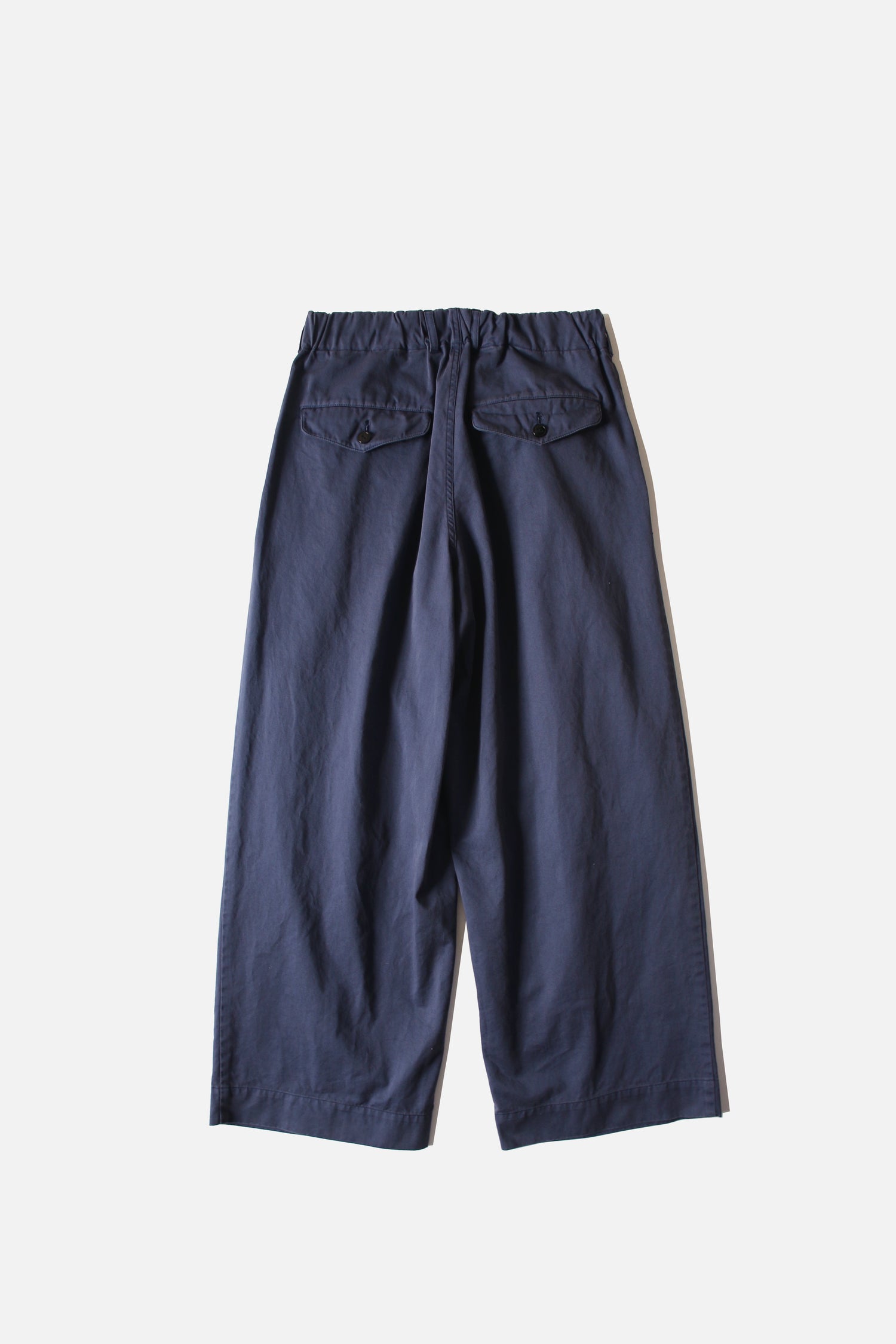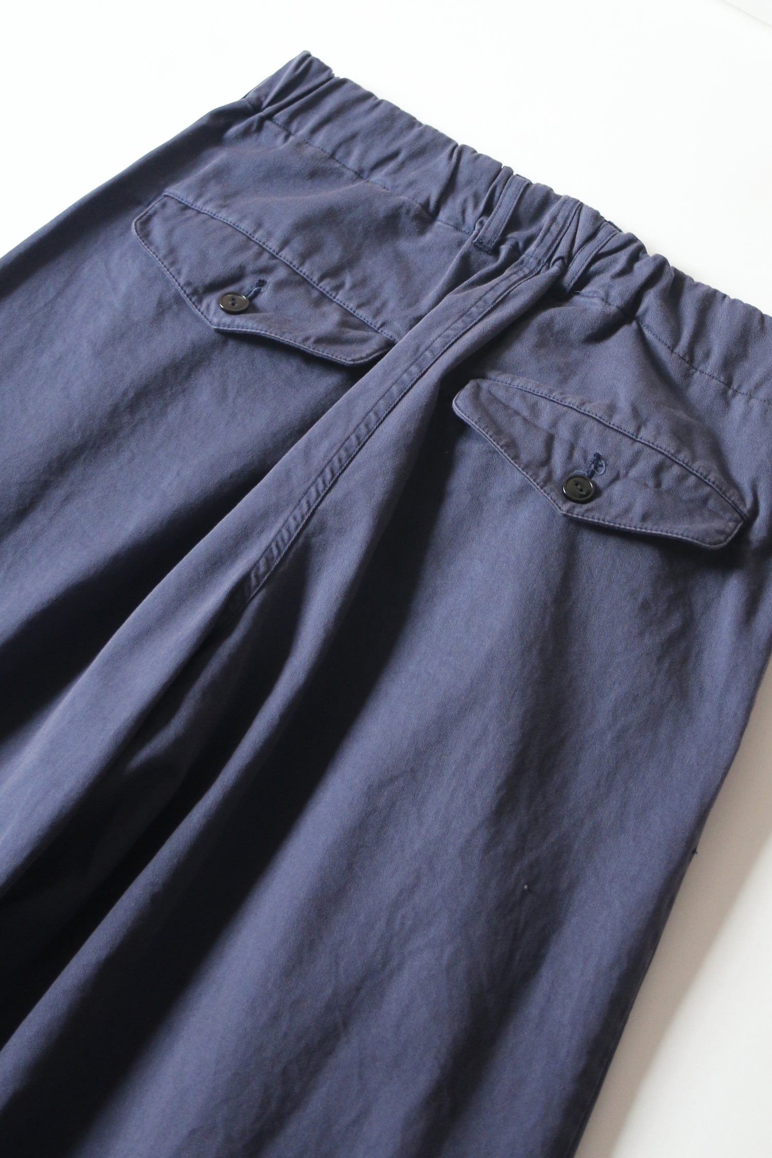 フロント2タック、後身頃ウエストゴム仕様のパンツです。高密度コンパクト糸を使用したツイル素材。製品後に硫化染め&バイオウォッシュを施し、ソフトな肌触りと適度なアタリを持たせました。左右ハンドポケット、後ろ両側フラップポケット。様々なトップス、ワンピースと相性良く、季節を問わず着用していただけます。