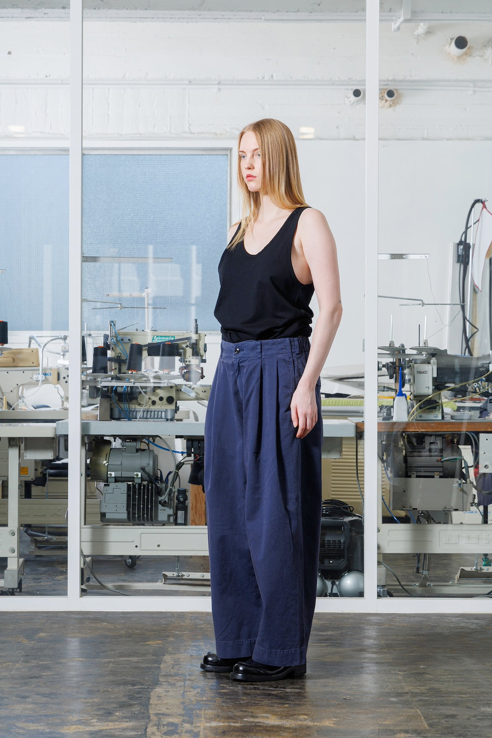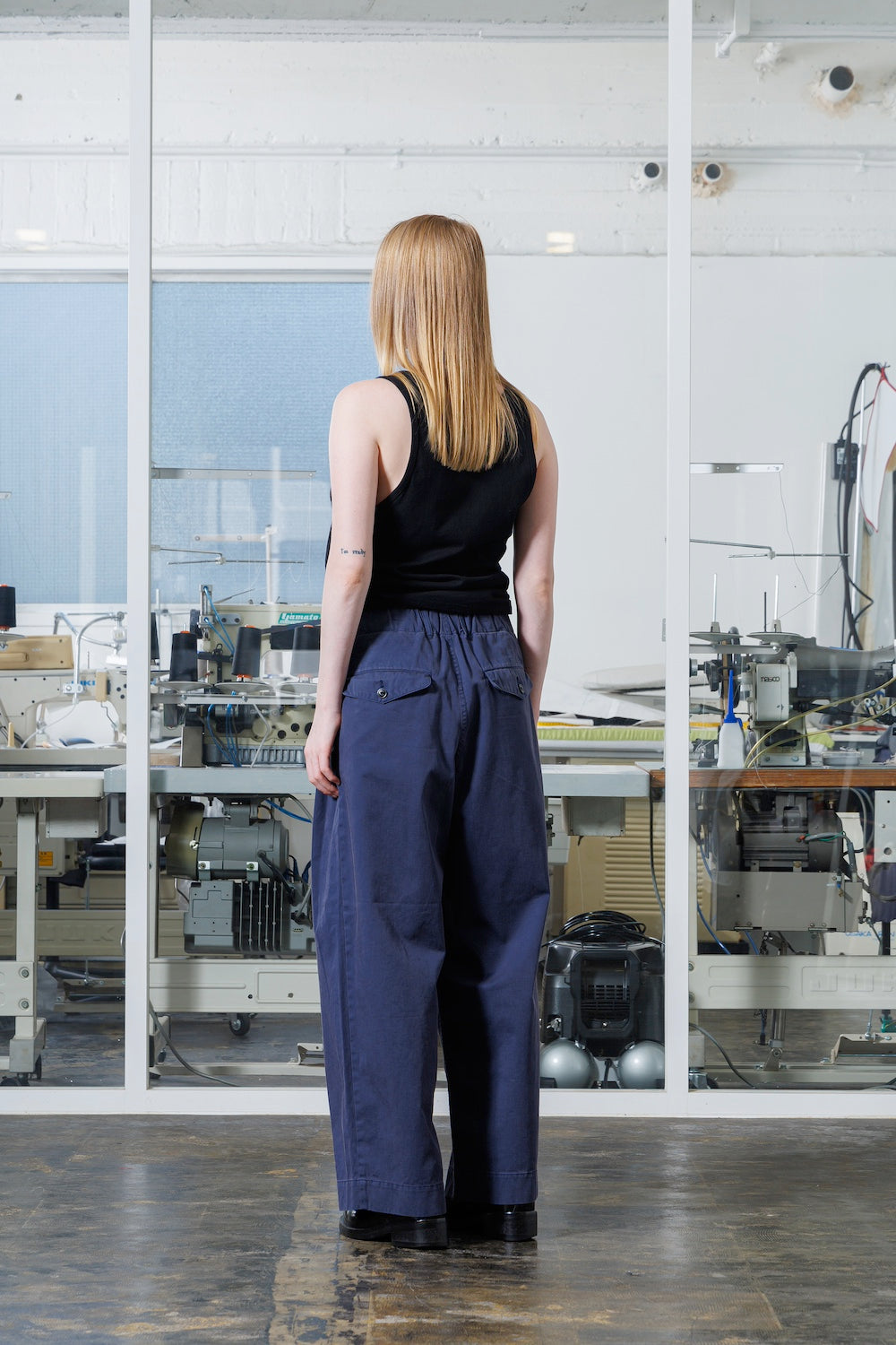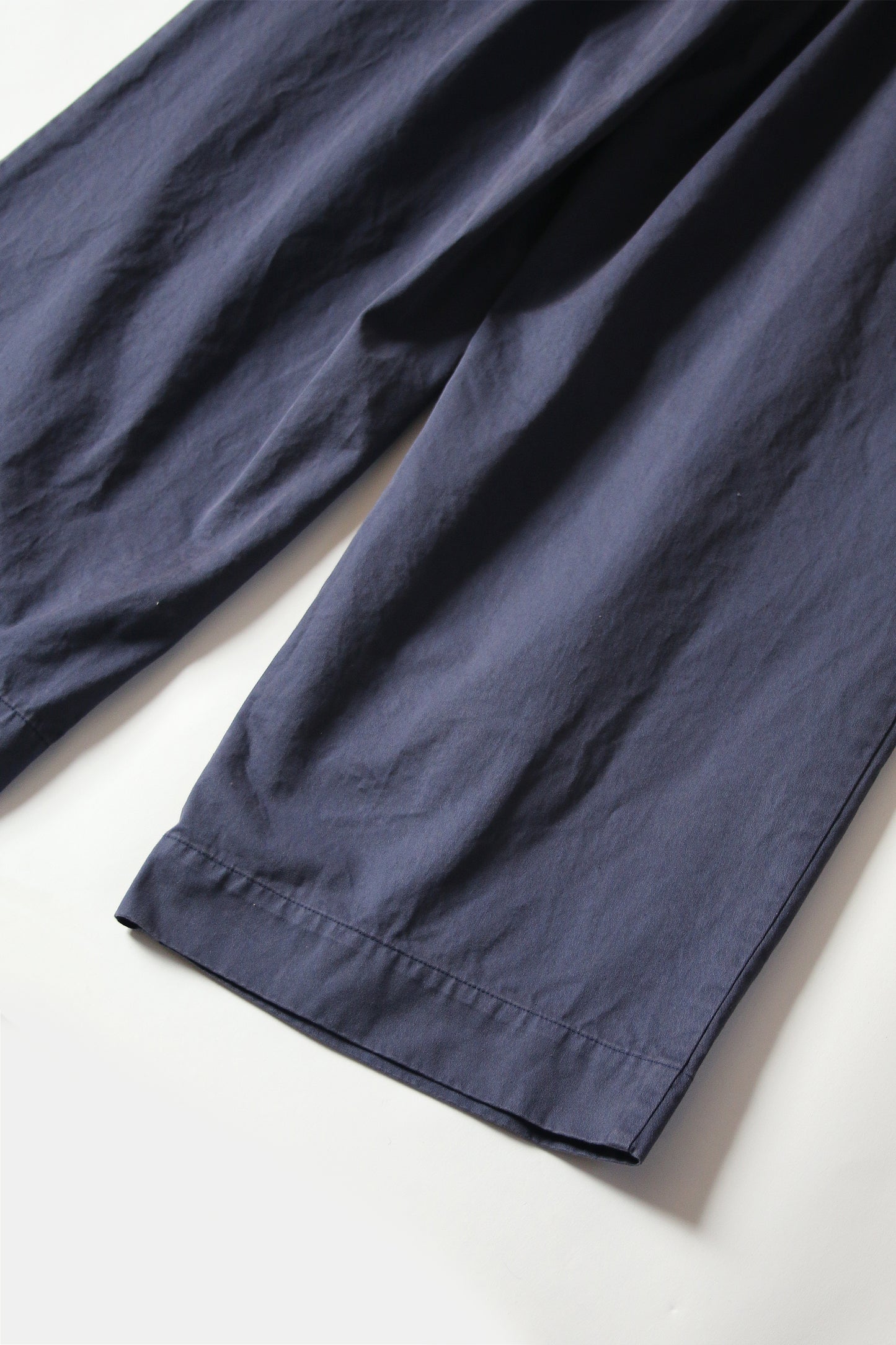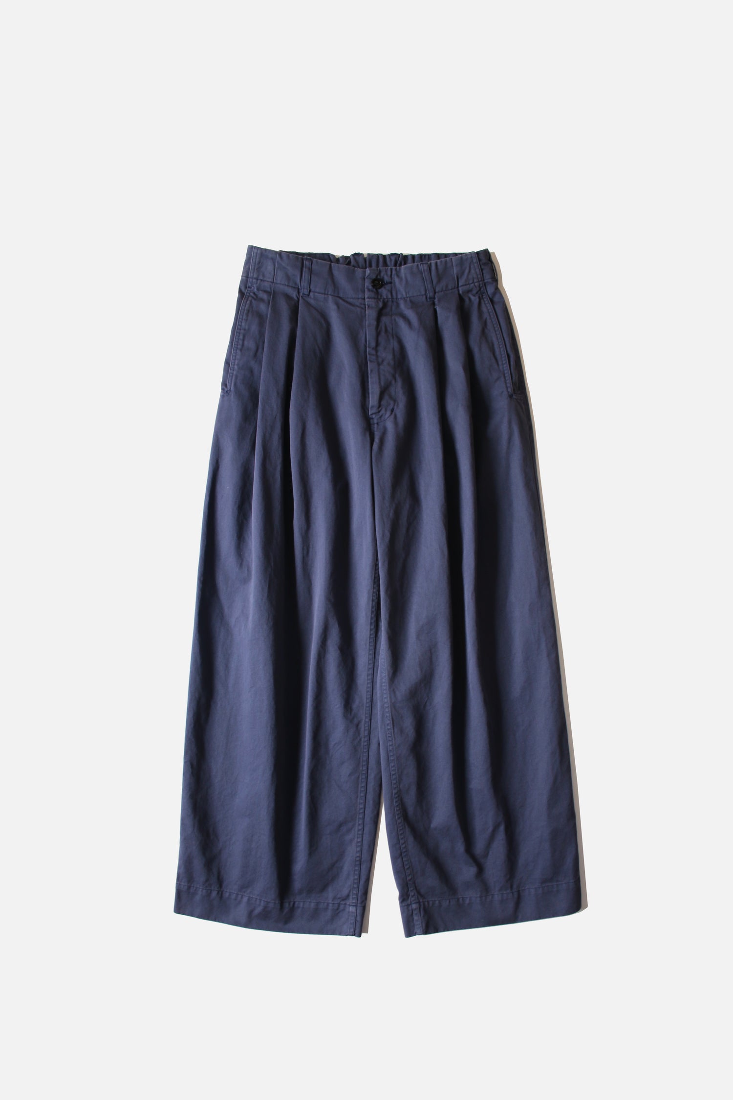 フロント2タック、後身頃ウエストゴム仕様のパンツです。高密度コンパクト糸を使用したツイル素材。製品後に硫化染め&バイオウォッシュを施し、ソフトな肌触りと適度なアタリを持たせました。左右ハンドポケット、後ろ両側フラップポケット。様々なトップス、ワンピースと相性良く、季節を問わず着用していただけます。