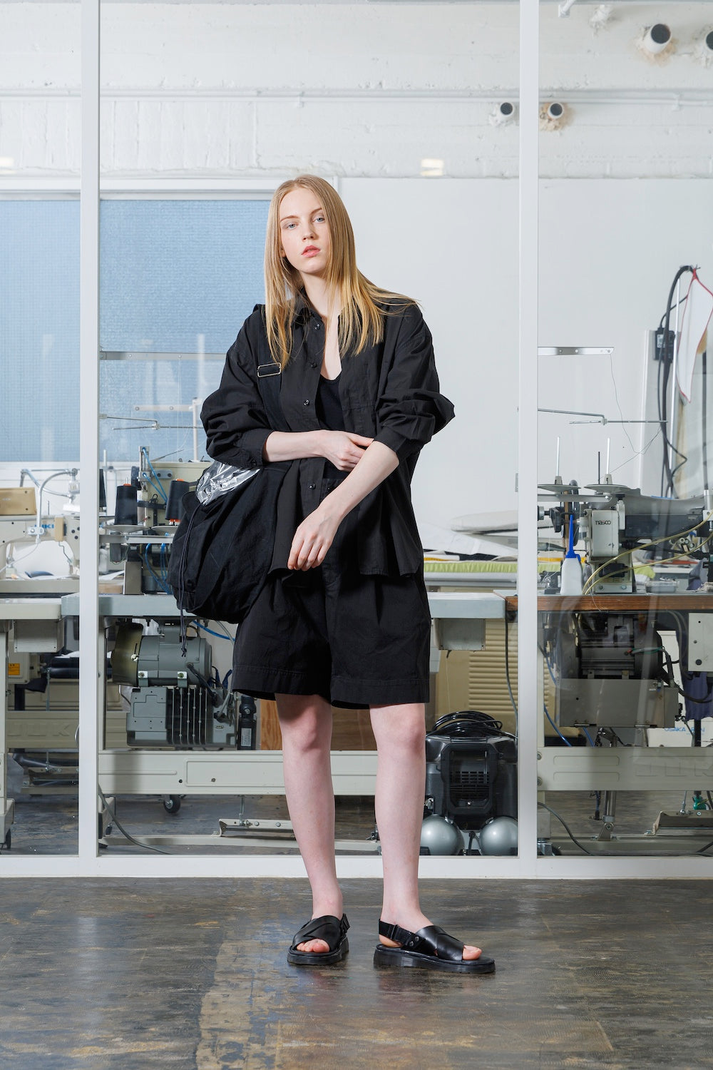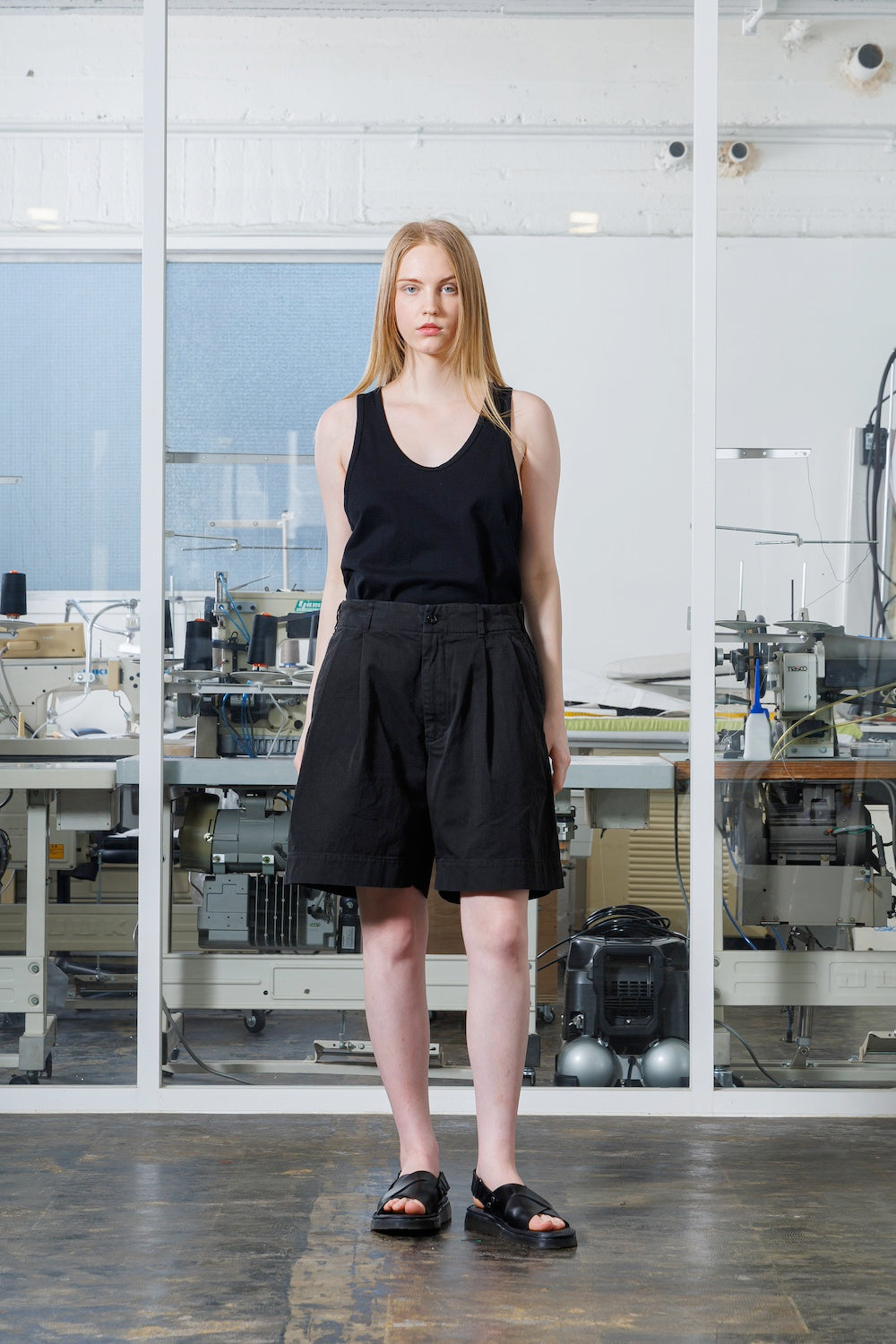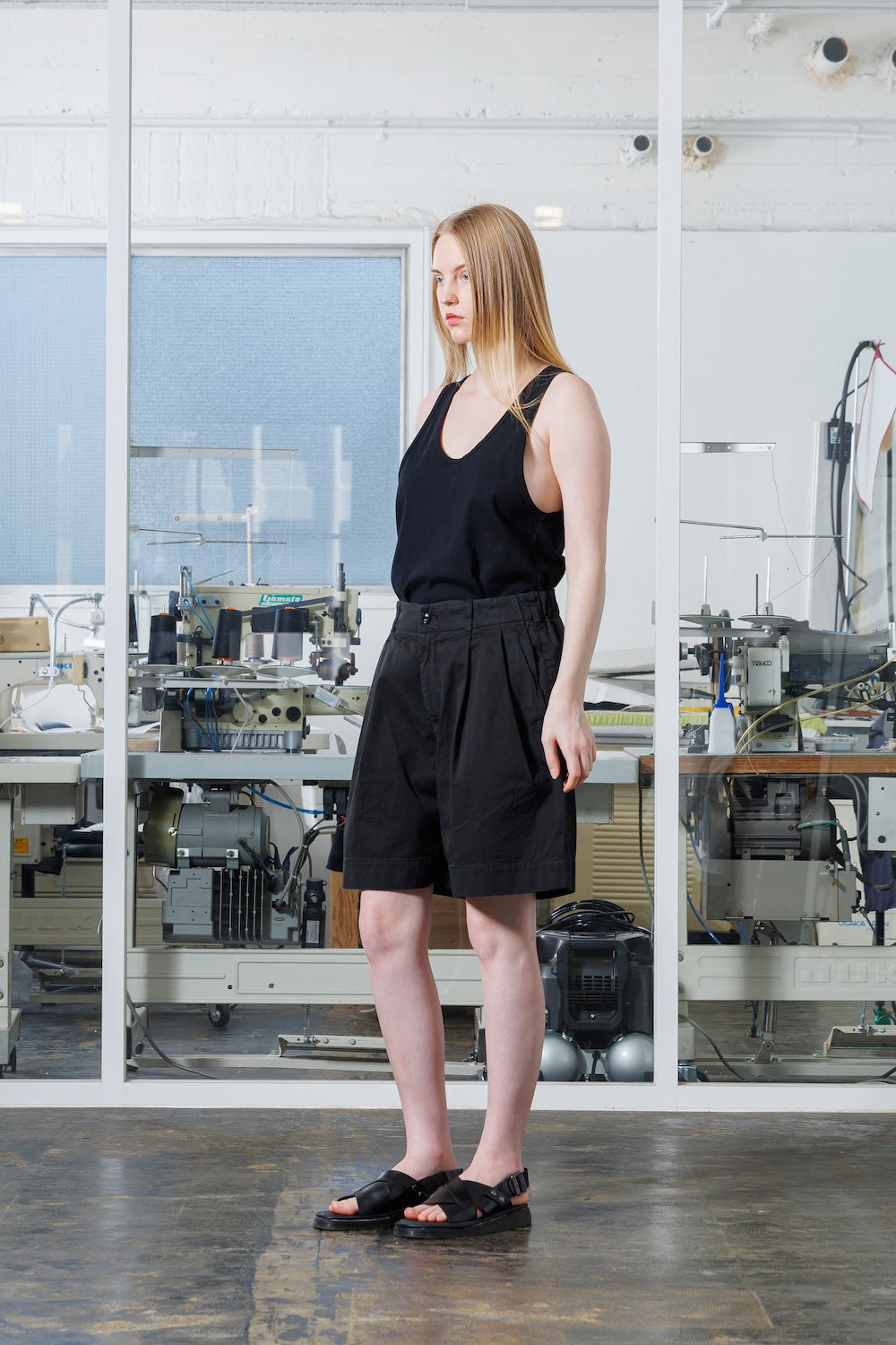 VOAAOV’s black shorts made from a twill so dense. Softness earned when washing’s done. Two tucks in the front. The back is elastic, stretched and wide. Pockets placed for hand and hold, both back and side.