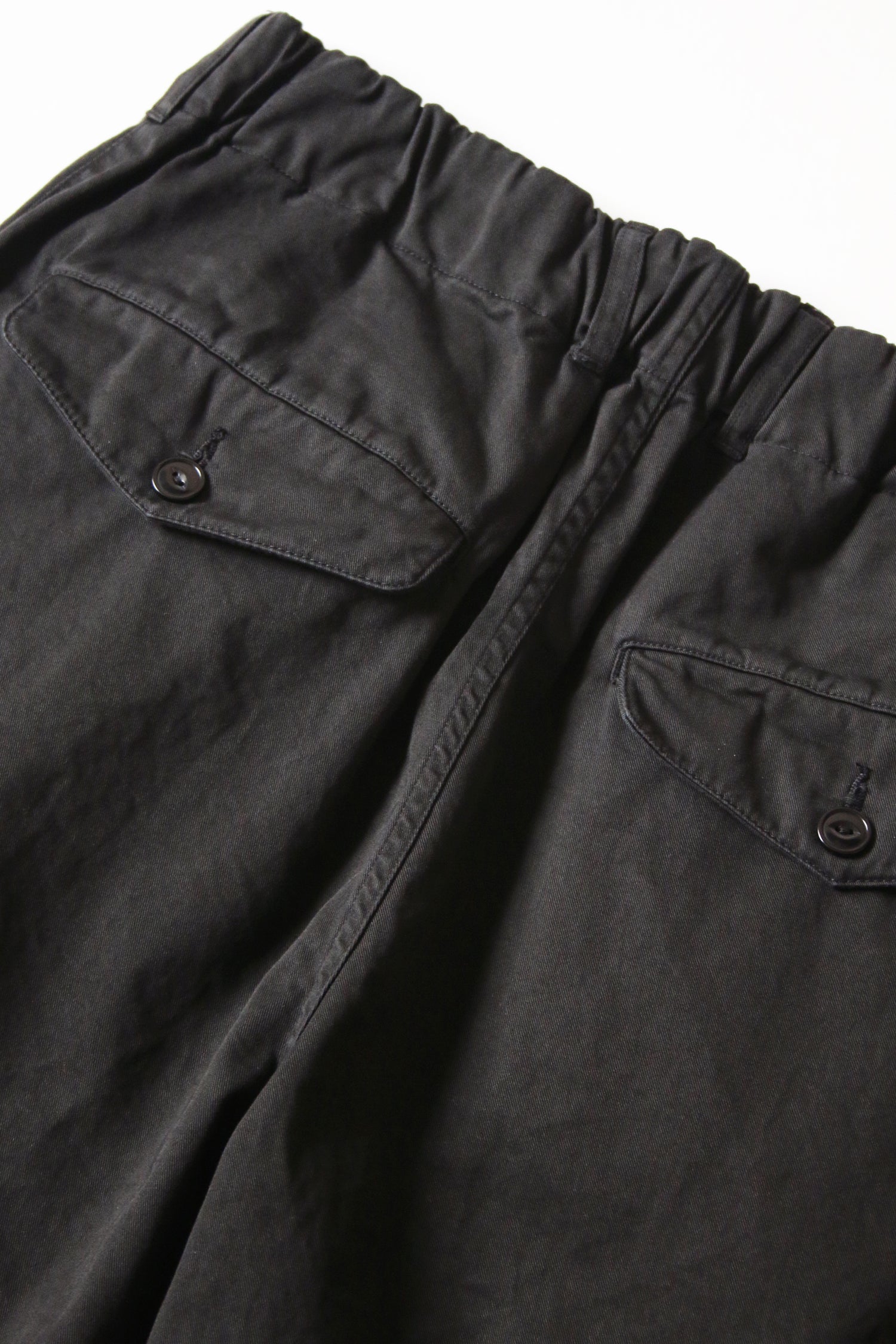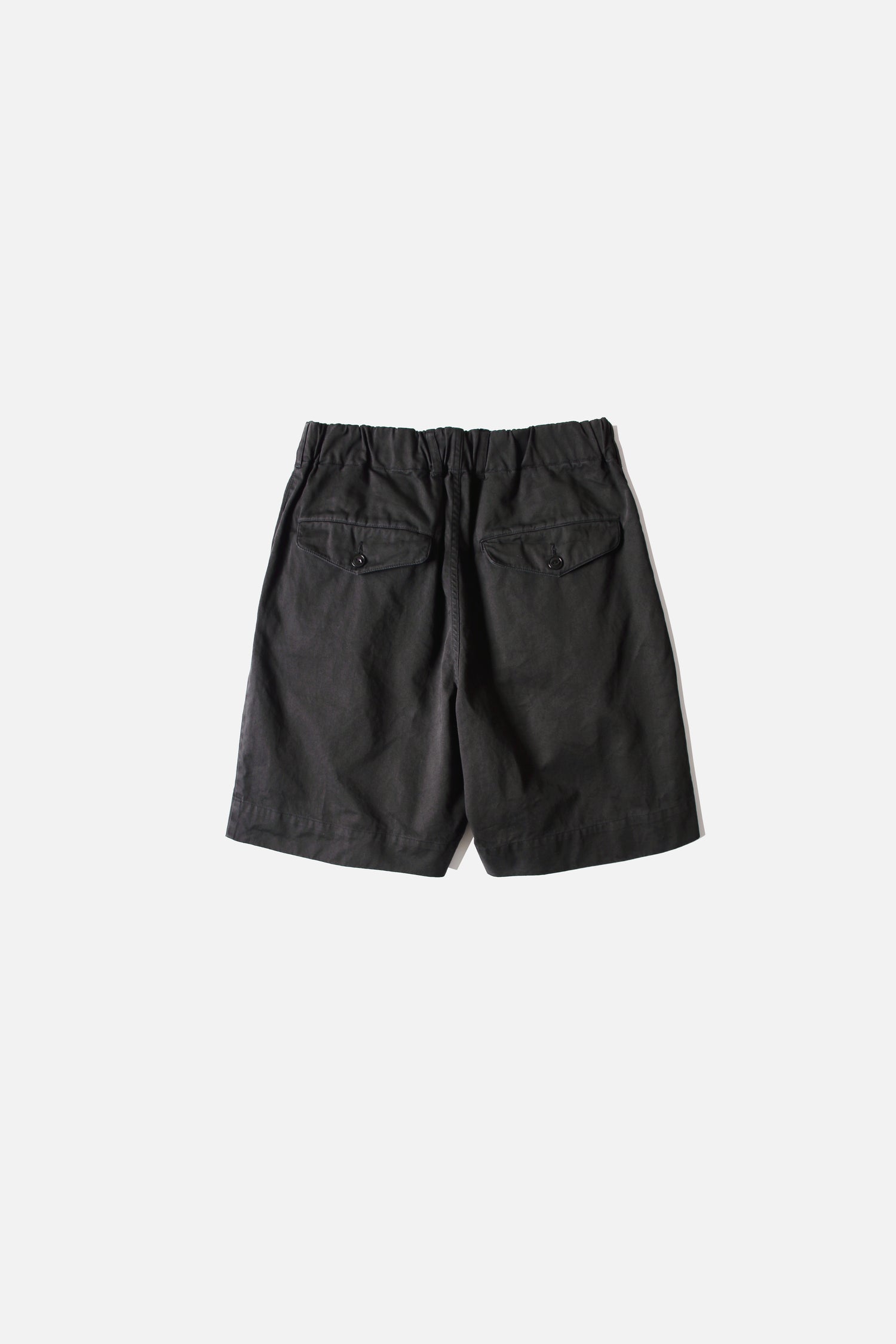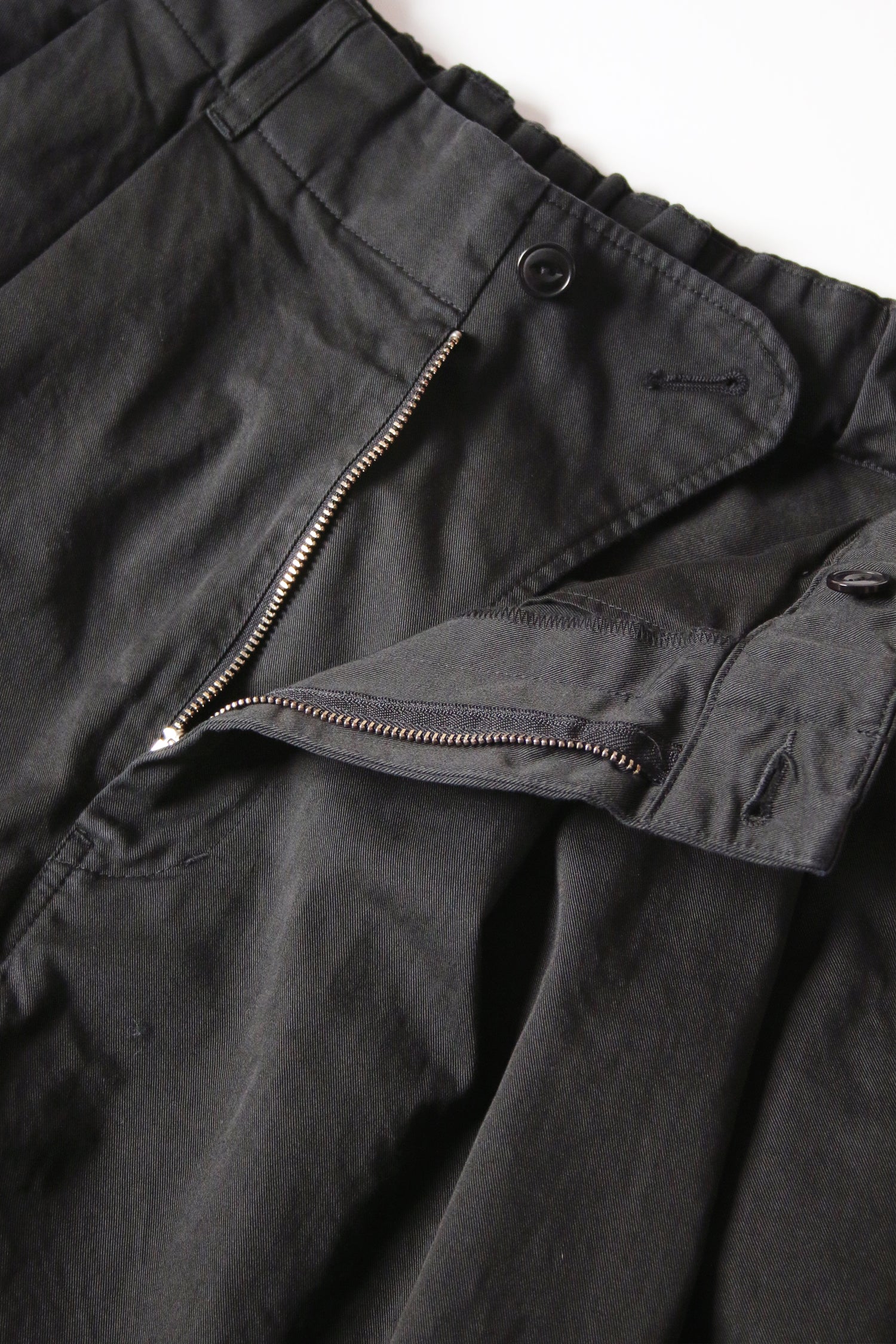フロント2タック、後身頃ウエストゴム仕様のVOAAOVショーツです。高密度コンパクト糸を使用したツイル素材。製品後に硫化染め&バイオウォッシュを施し、ソフトな肌触りと適度なアタリを持たせました。フロントファスナー開き。左右にハンドポケットとバックフラップポケットが2つ。