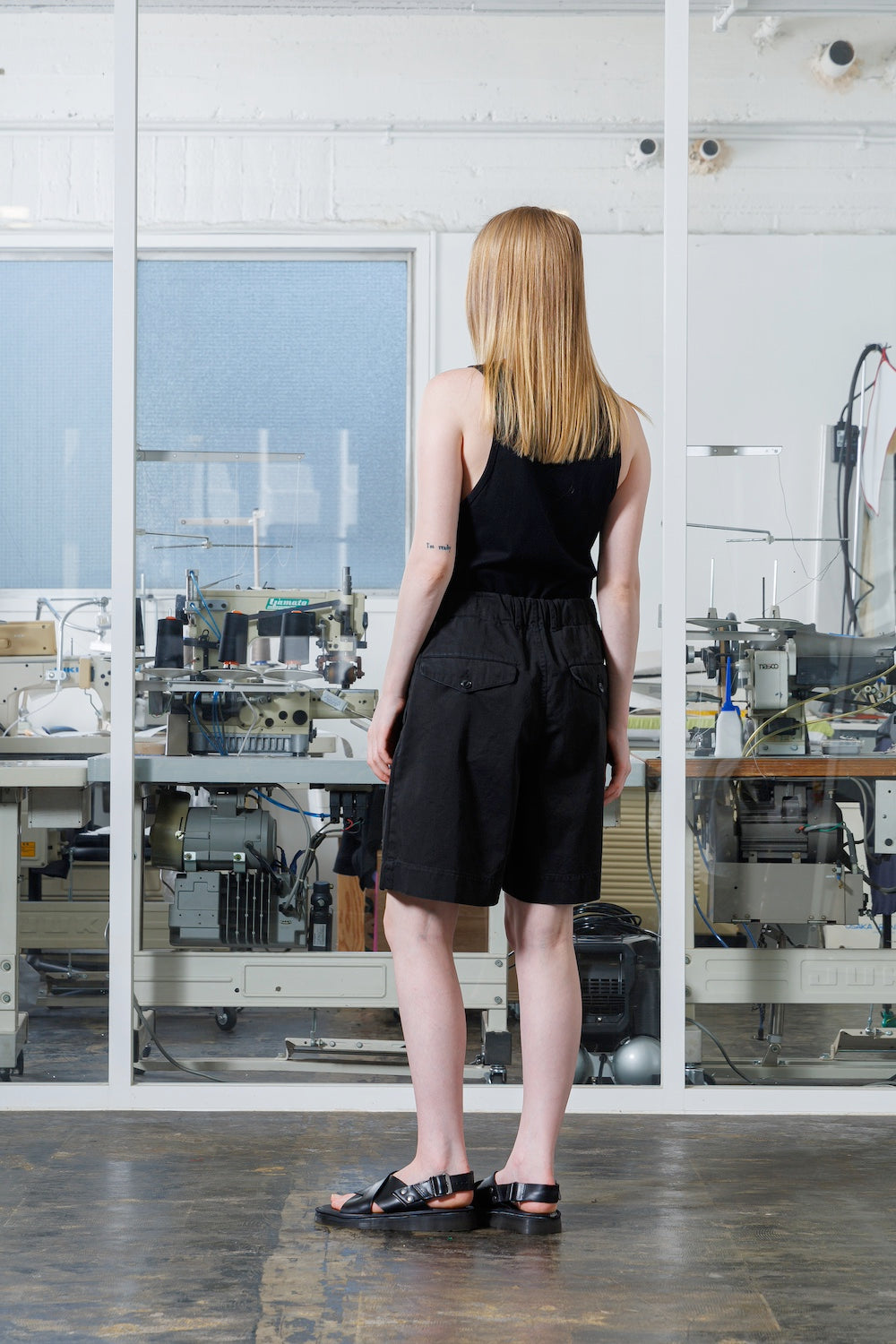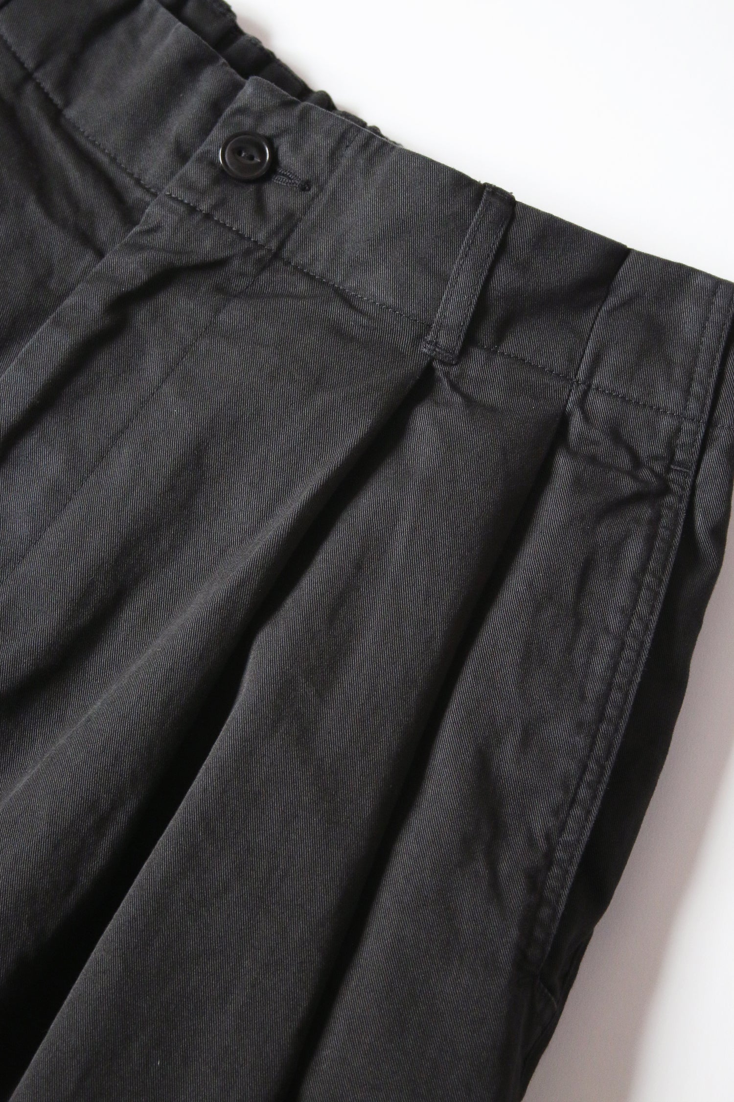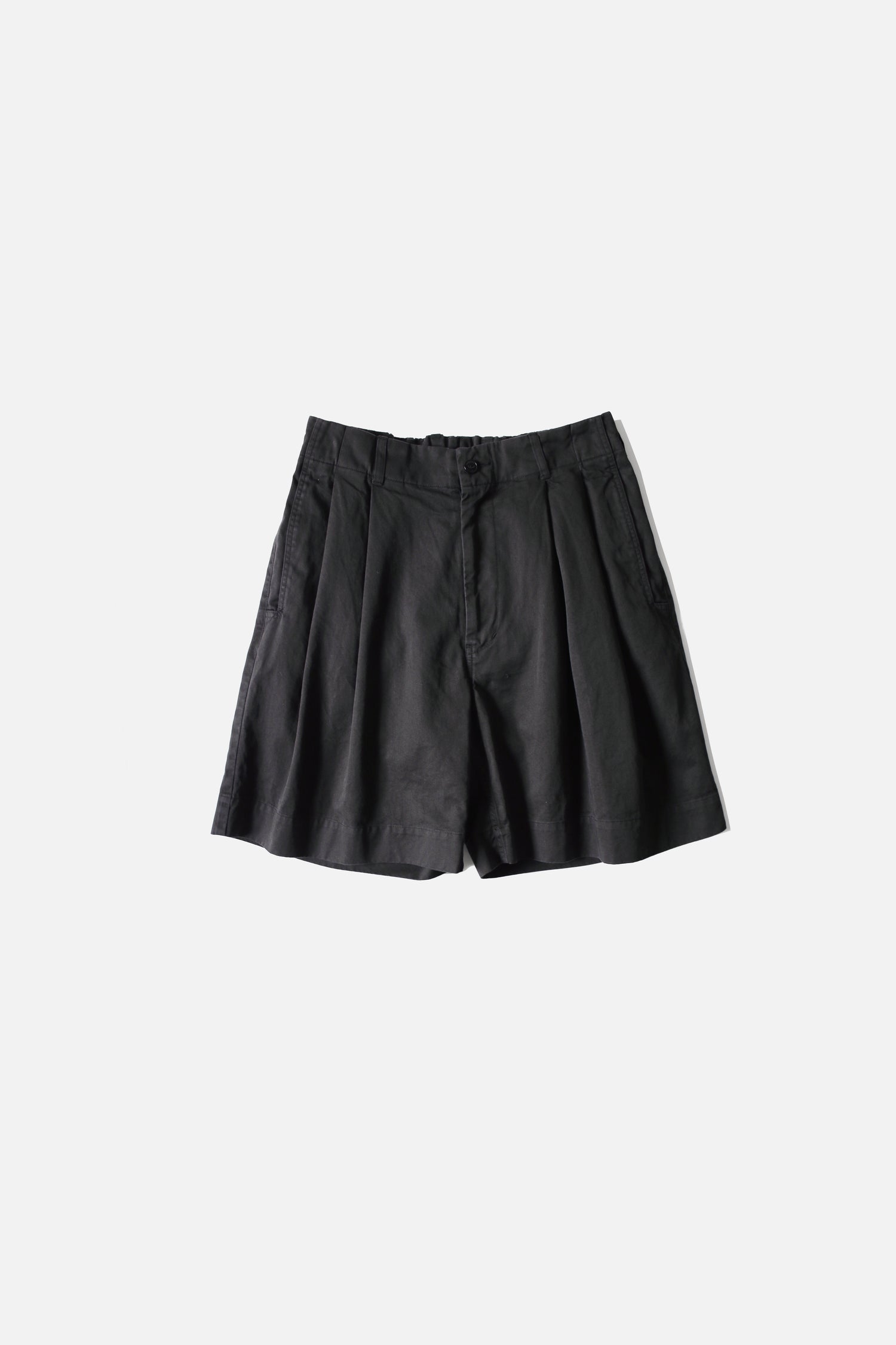 フロント2タック、後身頃ウエストゴム仕様のVOAAOVショーツです。高密度コンパクト糸を使用したツイル素材。製品後に硫化染め&バイオウォッシュを施し、ソフトな肌触りと適度なアタリを持たせました。フロントファスナー開き。左右にハンドポケットとバックフラップポケットが2つ。