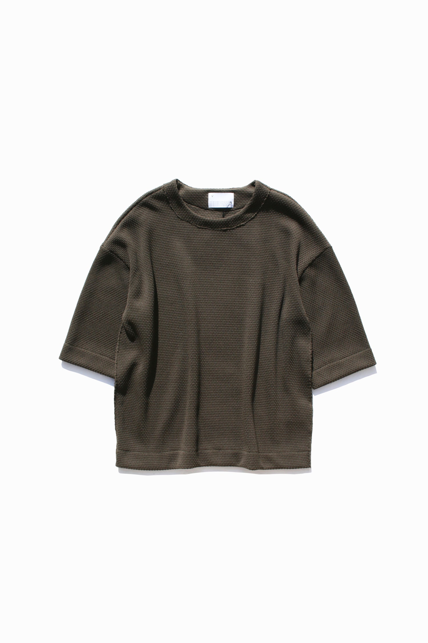 ローゲージニットの見た目とカットオフのディティールが特徴の七分袖トップス。ミニマルな構造と抜け目の無いデザイン。ローゲージとハイゲージを組み合わせて編んだ接結ジャージ素材。ローゲージニットの見た目でながら形状を安定させたハイテク素材。肌触りのよいポリエステルによる、軽い着用感とリラックス感のある仕上がり。カラーはブラックとオリーブの2色をご用意しました。経年変化も楽しみな一本。