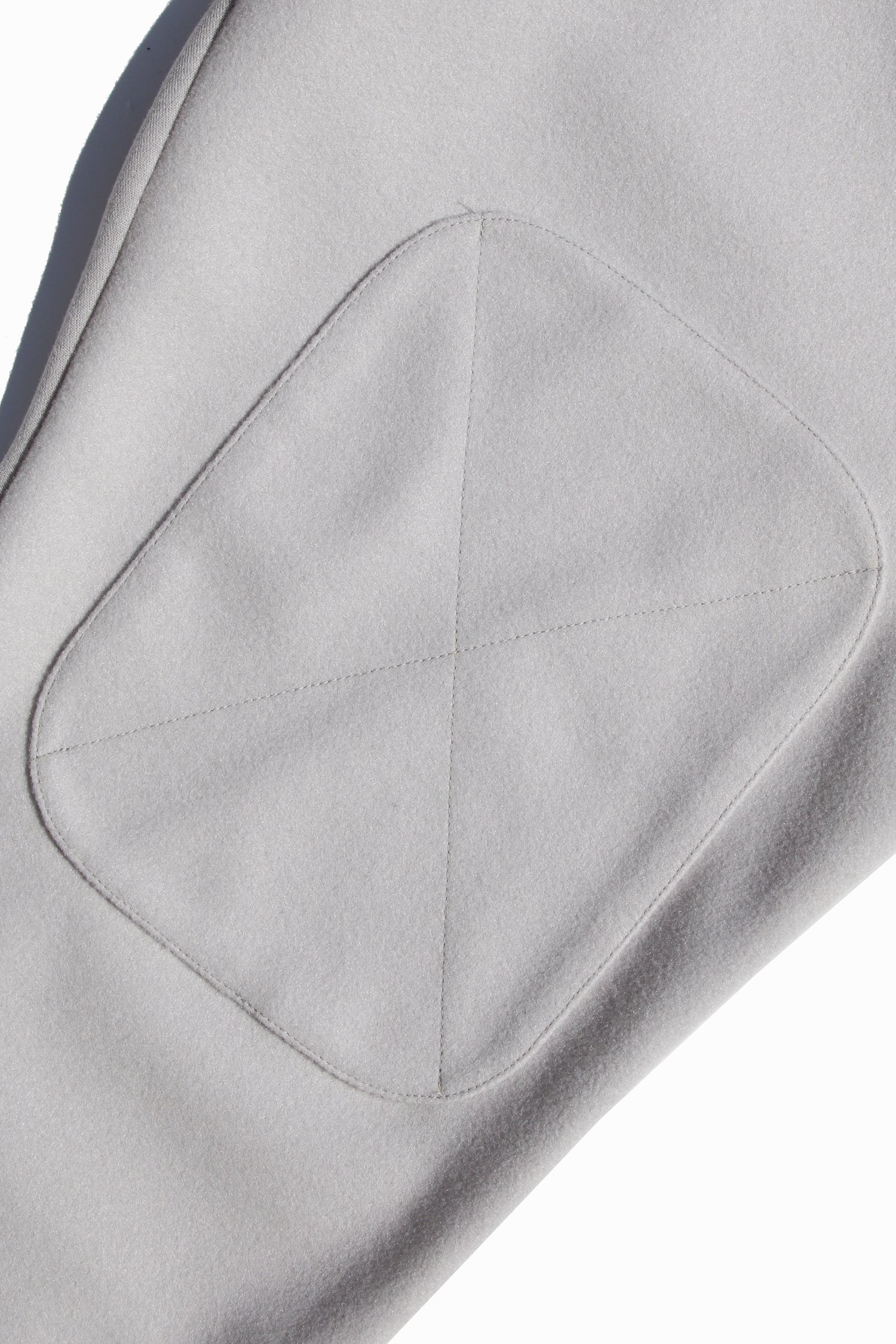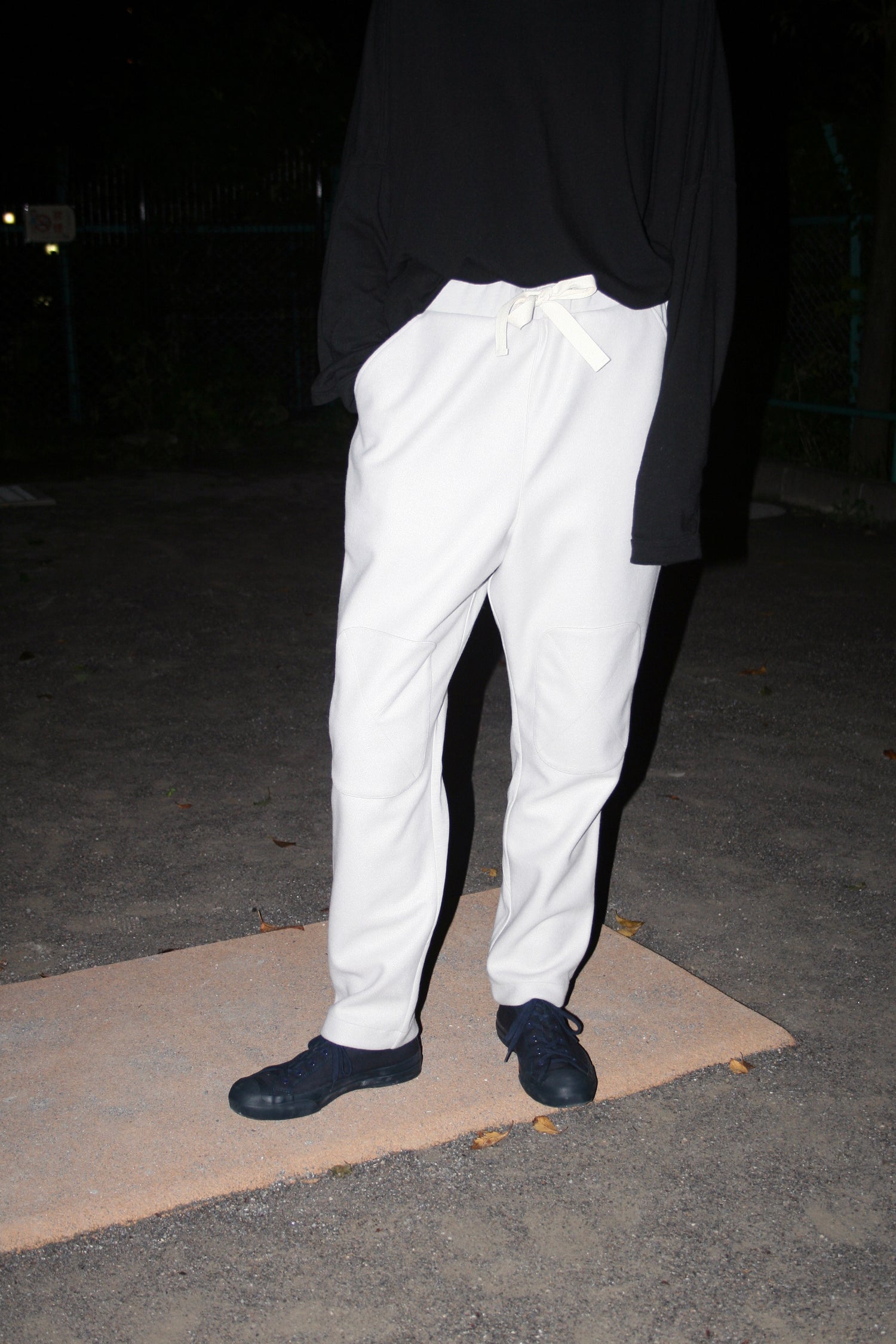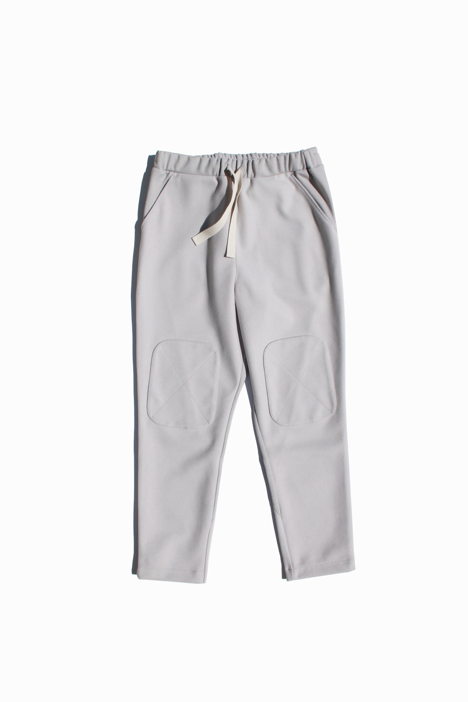 リラックスしたサイジングのダブルニーテーパードパンツ。こちらもライトグレーとブラウンの2色展開です。立体的な切り替えと、膝パッチが特徴のCHILL OUTイージーパンツ。上質なポリエステルxレーヨンxアクリルを採用。生地の表裏で切り替えし、変化をつけています。二つの異なるニット素材をニードルパンチ加工することでウールのような膨らみと高級感があり、軽い着心地が特徴のリラックス素材。手洗い可能なイージーケア。デーリーユースでの着用を考えサイドポケットをプラス。ウエストはドローコード付きのイージー仕様。カーディガンのセットアップが可能。
