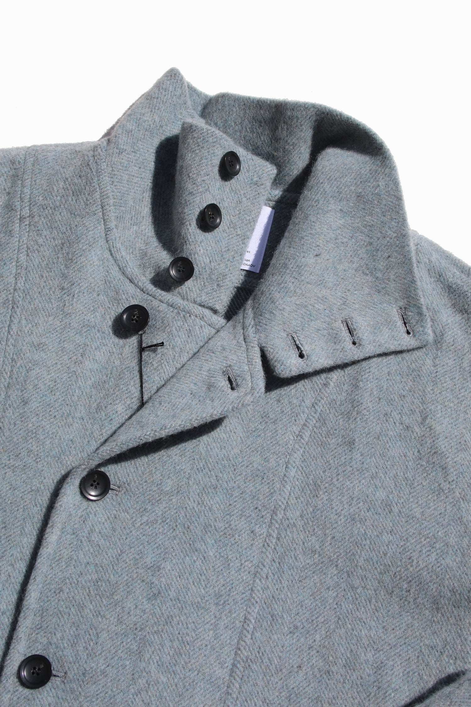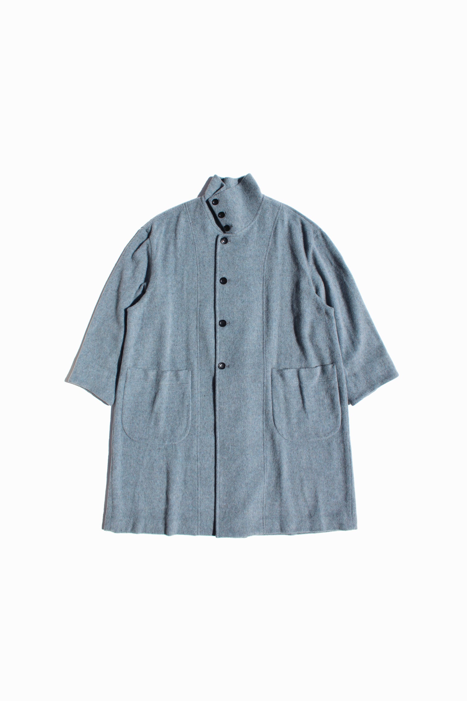 ブランケット素材を使用した一枚仕立ての新型イージーロングコートが登場。今期はブルーとブラックの2色を展開。服や裁断くずから取ったリサイクルウールを使用した大柄ヘリンボーン素材。シャギー起毛することで膨らみと柔らかさのある表情に。襟のボタンでスタンドカラーでの着用も可能。サイドには大きなパッチポケットを配置。アームホールにスリットを施し、動きやすさを確保。背面にはセンターベントが入ります。とろみのあるソフトなウールを使用しており、秋冬の防寒コートとしてご着用いただけます。ユニセックスでお使いいただけます。
