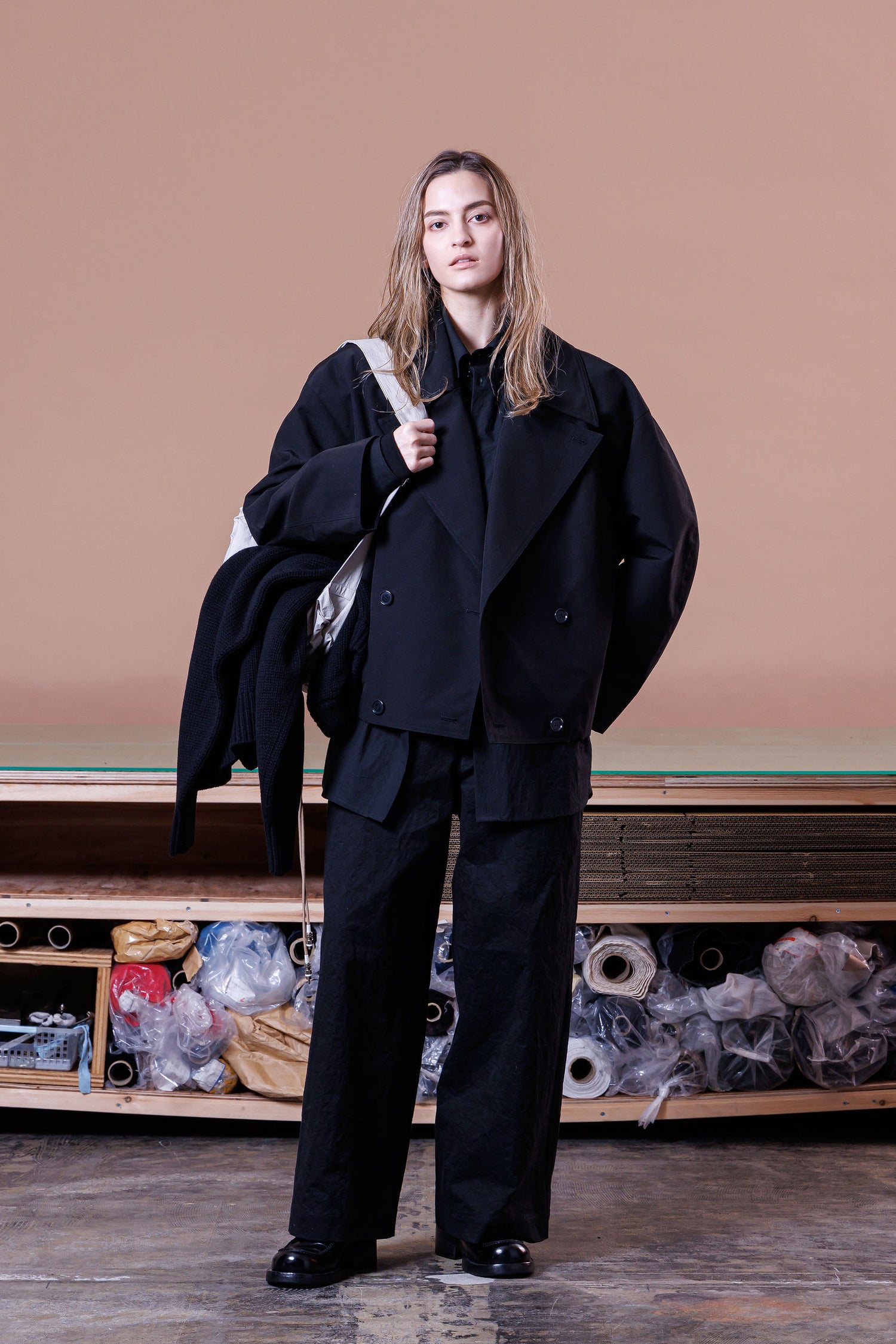Outsider black jacket constructed by using water-repellent and wrinkle-resistant T/C weather material, a modern-tech woven blend of recycled polyester and organic cotton. Smooth and high-density nylon taffeta is used for the inside lining. Future: exquisite adjusters and slanted pockets.