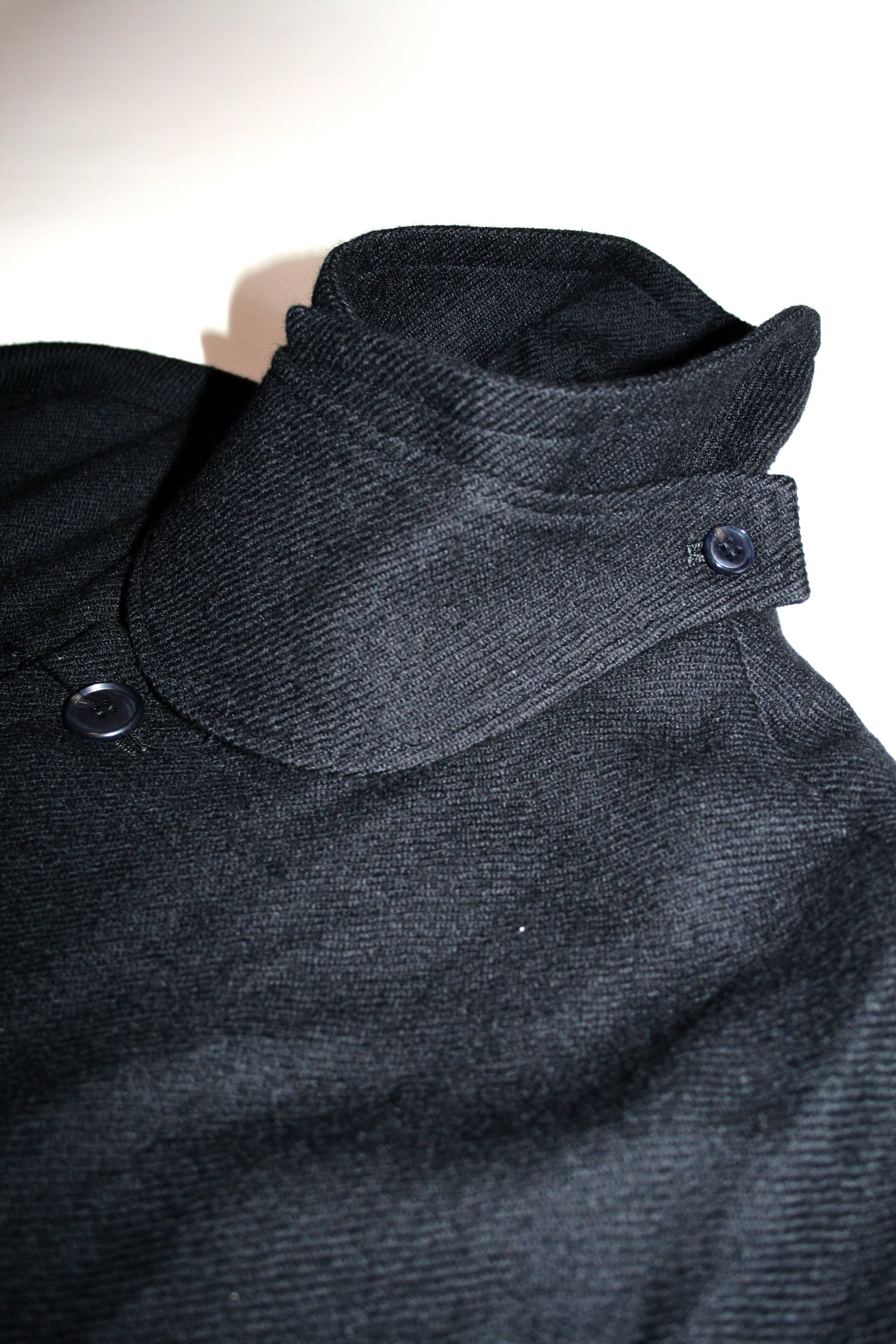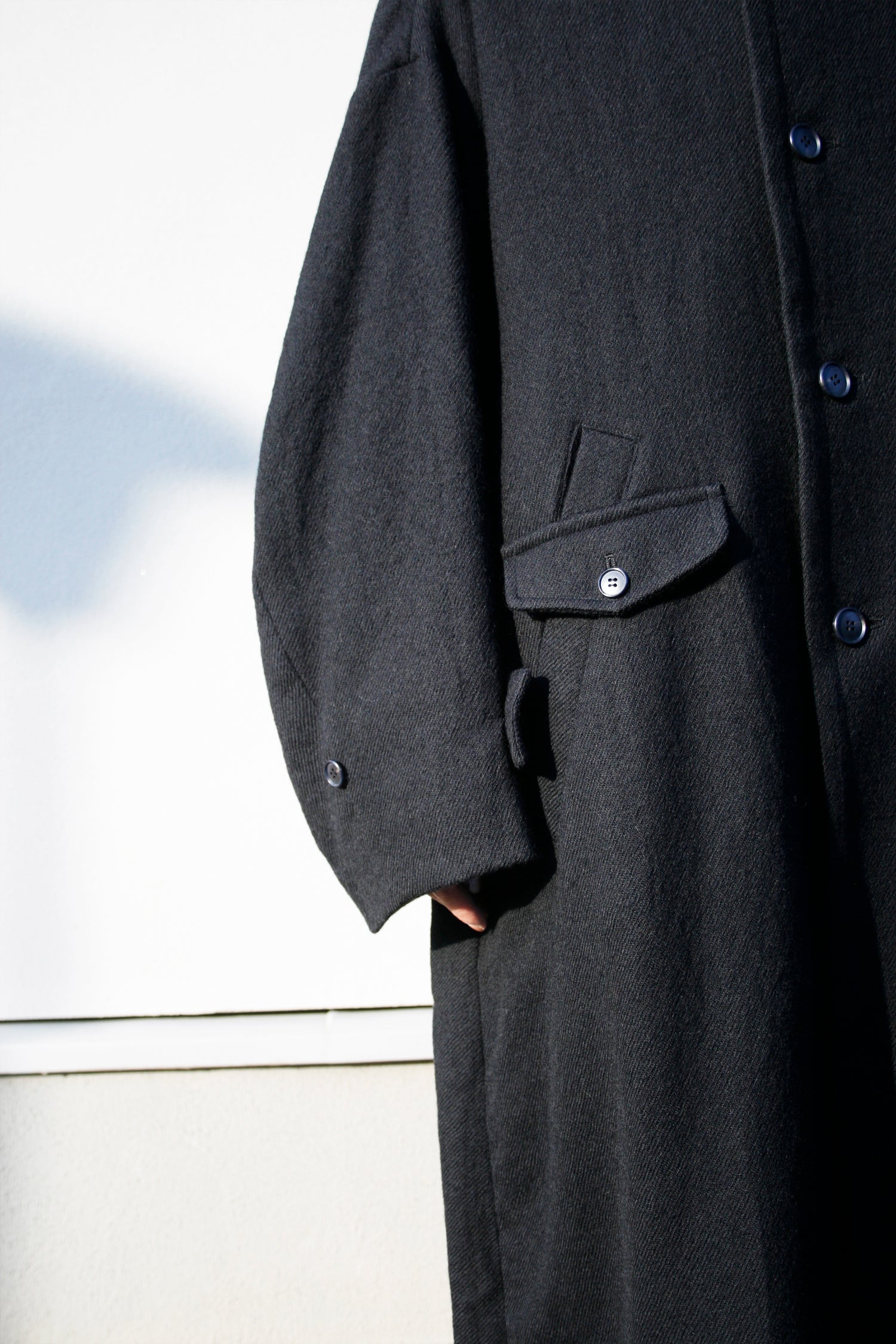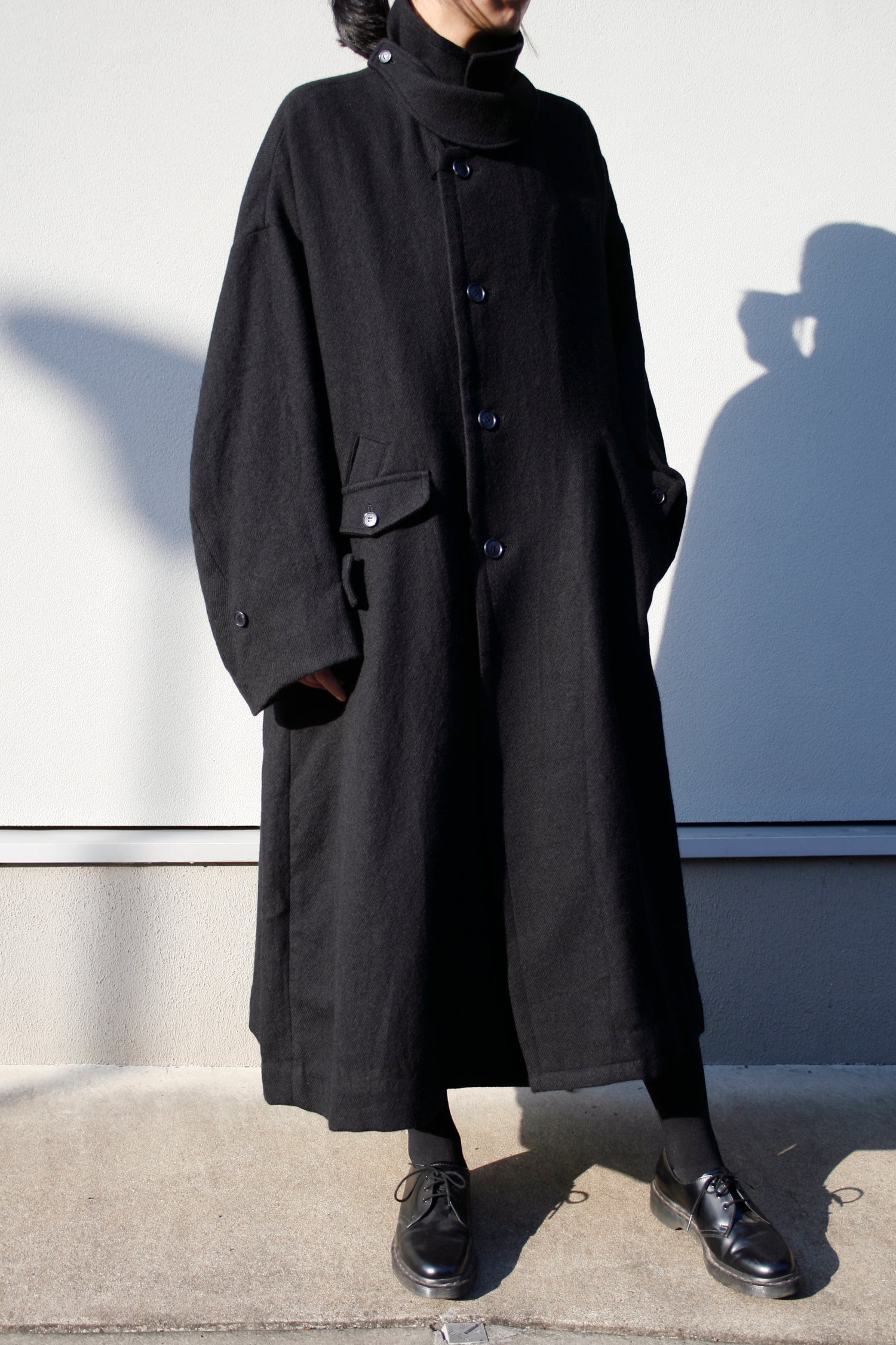 適度な毛羽をもつ尾州産のウールを使用した定番のステンカラーコート。実用性と保温性抜群のウールコートになります。梳毛としては太番手になる24番手双糸を使用。ざっくりと大きめの綾で織り上げ、空気を含ませながら縮絨するタンブラー加工でソフトな風合いに仕上げた尾州産ウール。 素材の使用分量に反して軽さも特徴です。VOAAOVの黑満載のコレクションをお楽しみください。