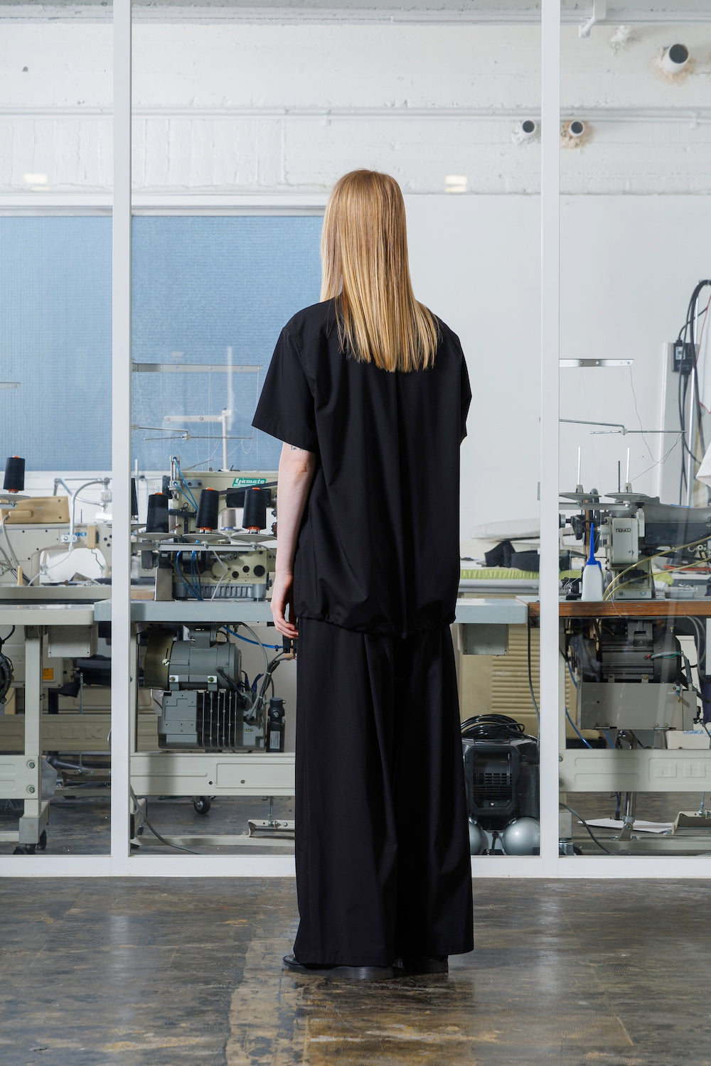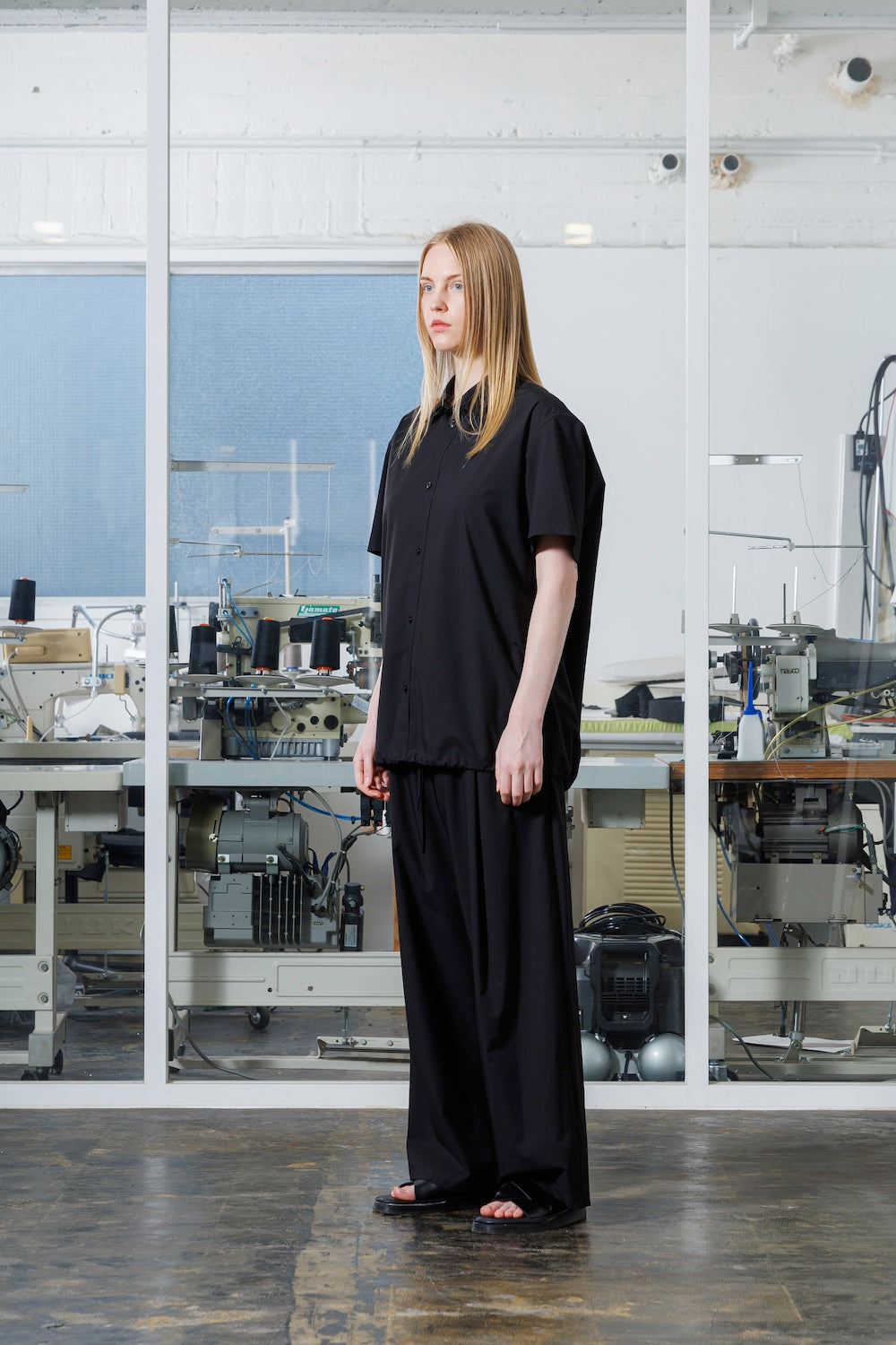 Comfort in its touch and fit, a black short-sleeve shirt in a rayon-polyester blend, a fabric that gentle and soft to the skin. The fit is loose and versatile In any season, everywhere. At the hem, a spindle to style your way, chic or sporty.