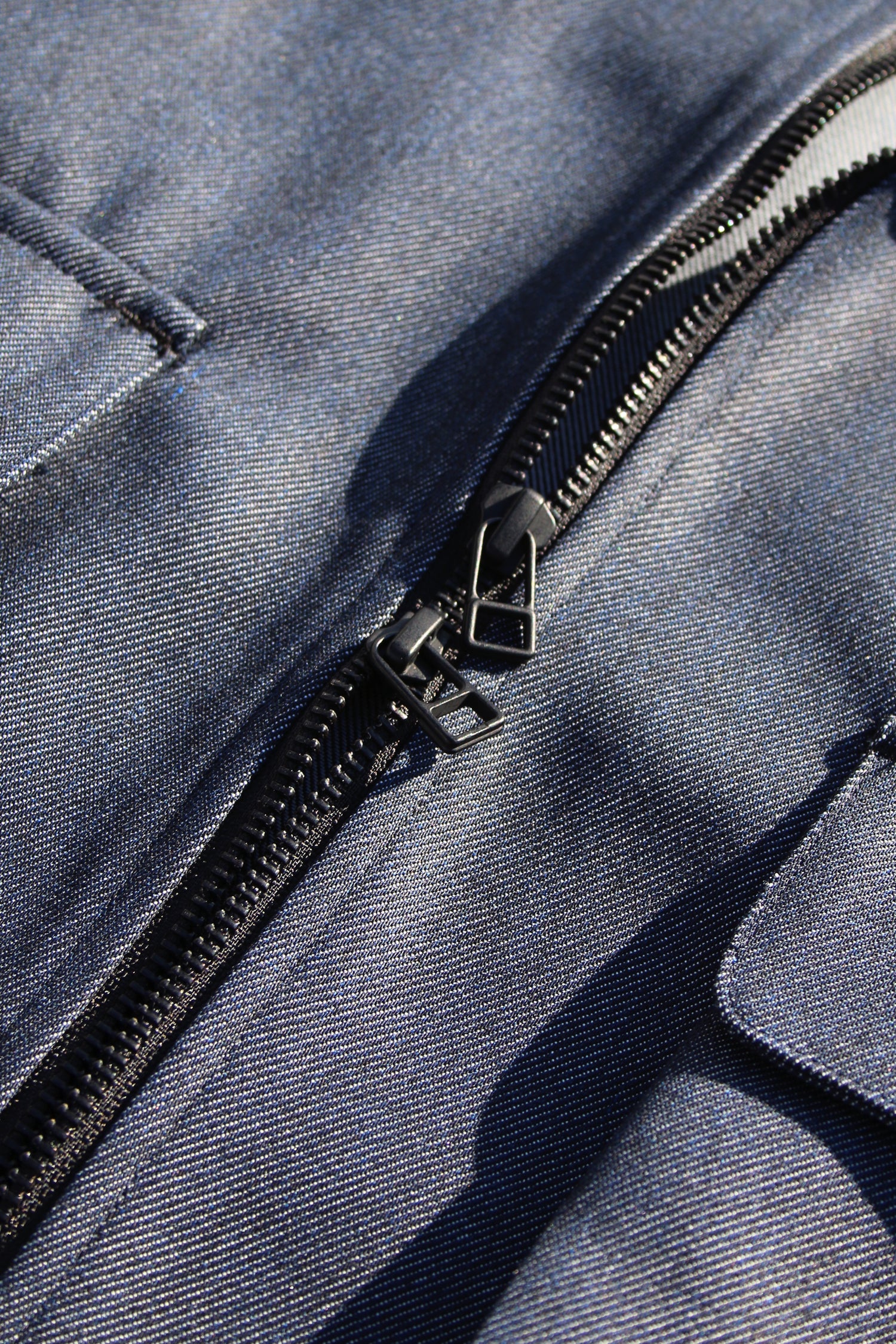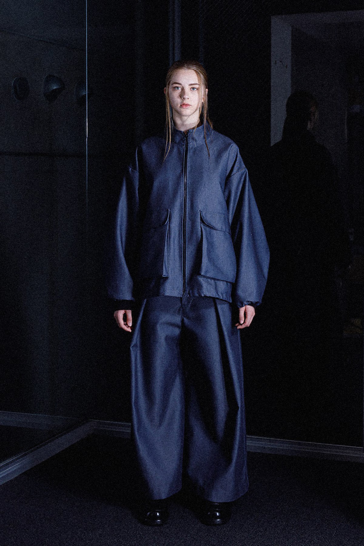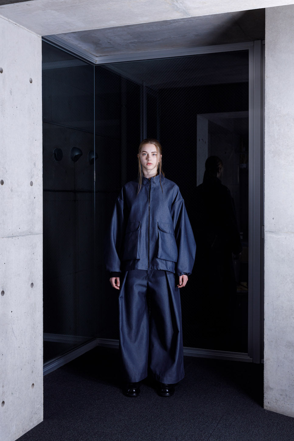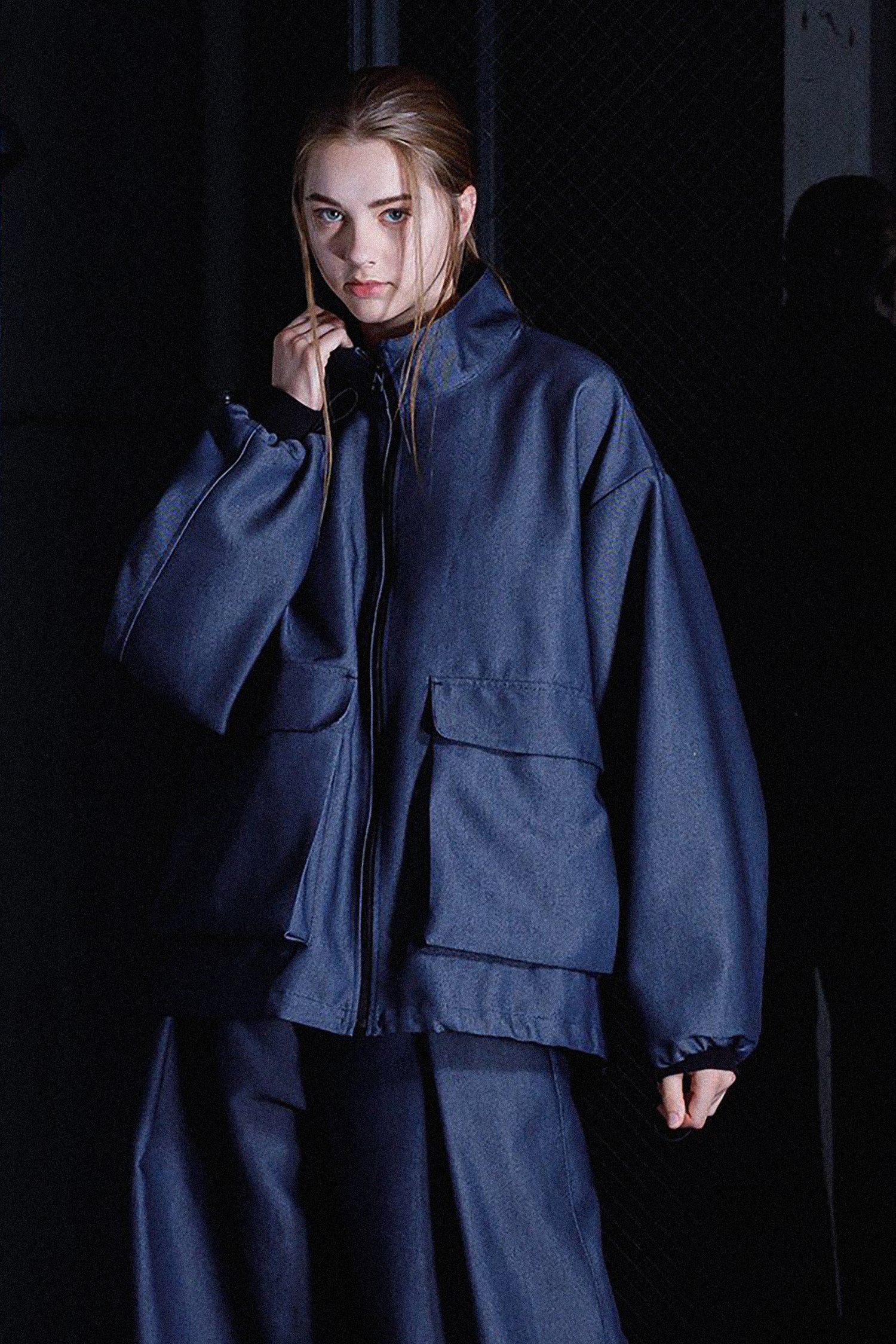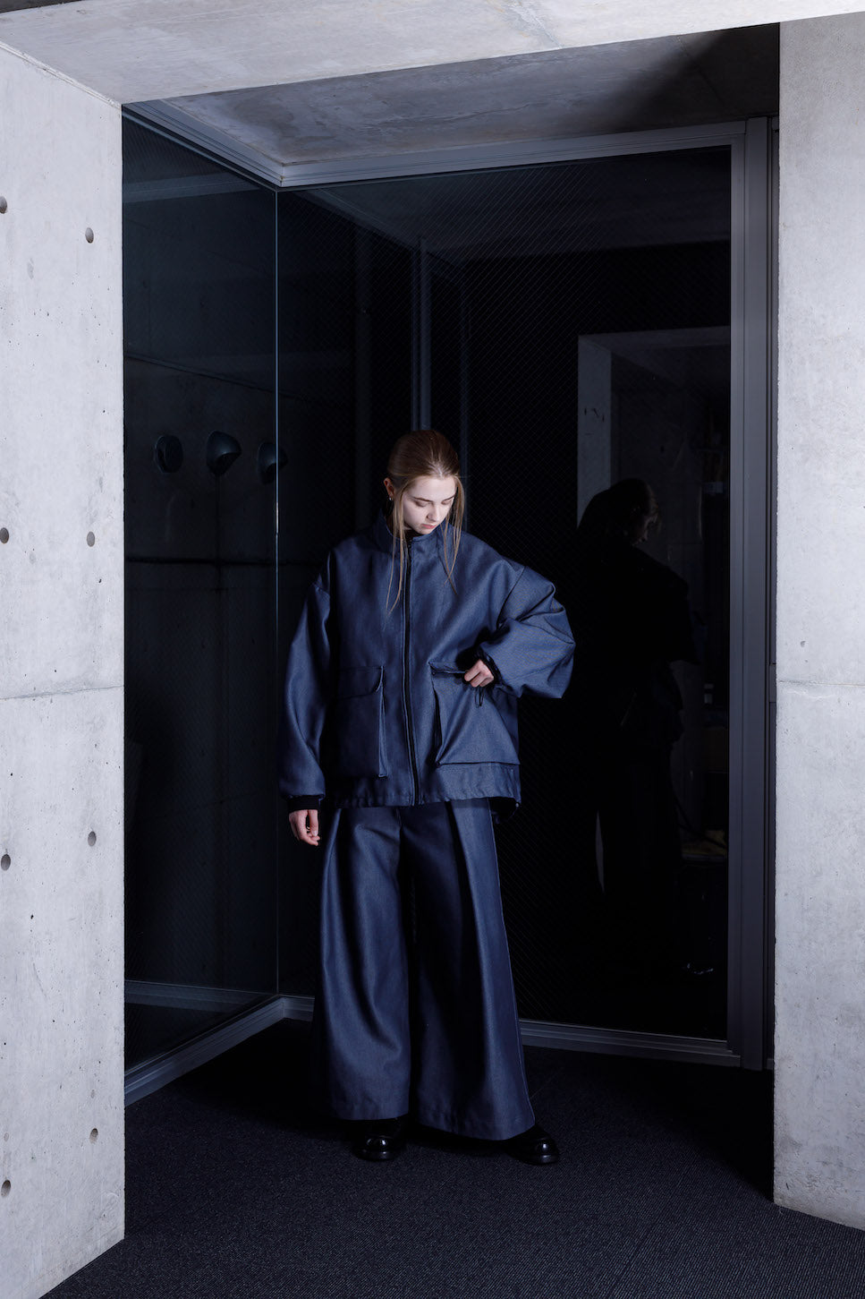 ルーズなバックスタイルが特徴のオーバーサイズのジップアップブルゾン。リサイクルペットボトルを原料に使用した、"経年変化しなくてもよい" デニム素材。ドロップショルダーと太めのアームホール。大きいフラップポケットが特徴です。裾と袖口のドローコードによるシルエットの変化もお楽しみいただけます。