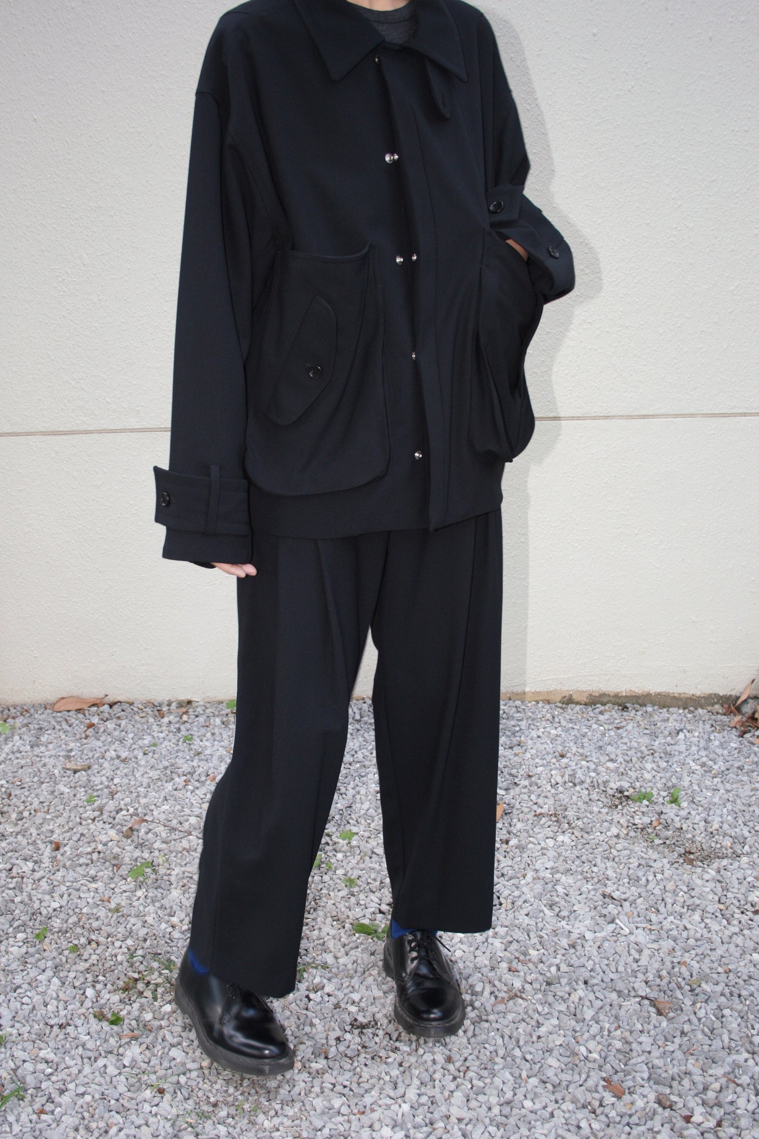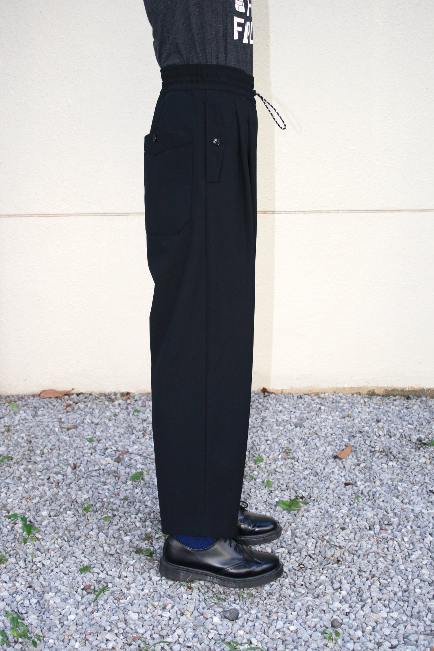 前期から引き継いだワイドイージーパンツ。軽やかなウールを使用したリラックスイージーパンツ。肉感のある4/48糸で構成されたウール混素材。シワになりにくくクリアな表面ながら、ヴィンテージライクな風合いに仕上げることで表情を持たせた素材。素材の持つ適度な張り感とドレープ性を存分に活かしたシルエット。キレイ目見えする素材なので、どんな素材のトップスとも相性抜群で、カジュアルイージーパンツ。ウエストはゴム仕様になっており、履き心地の良さも兼ね備えたデザイン。ウエストゴムストラップ付き。フロントポケット2ヶ、バックポケット2ヶ配備。同素材のワイドブルゾンとセットアップで着用可能。幅広いシーズンで着用できるおすすめの一着です。